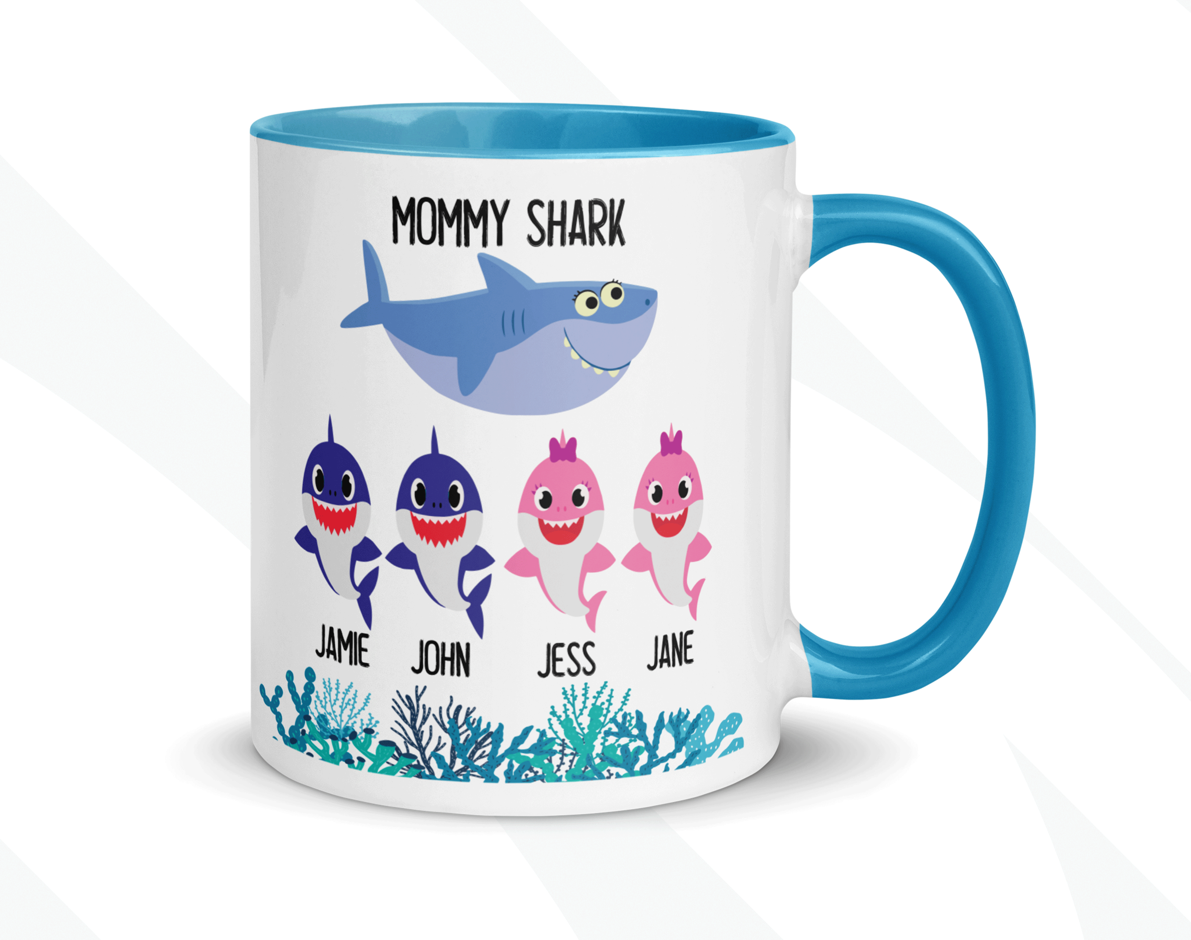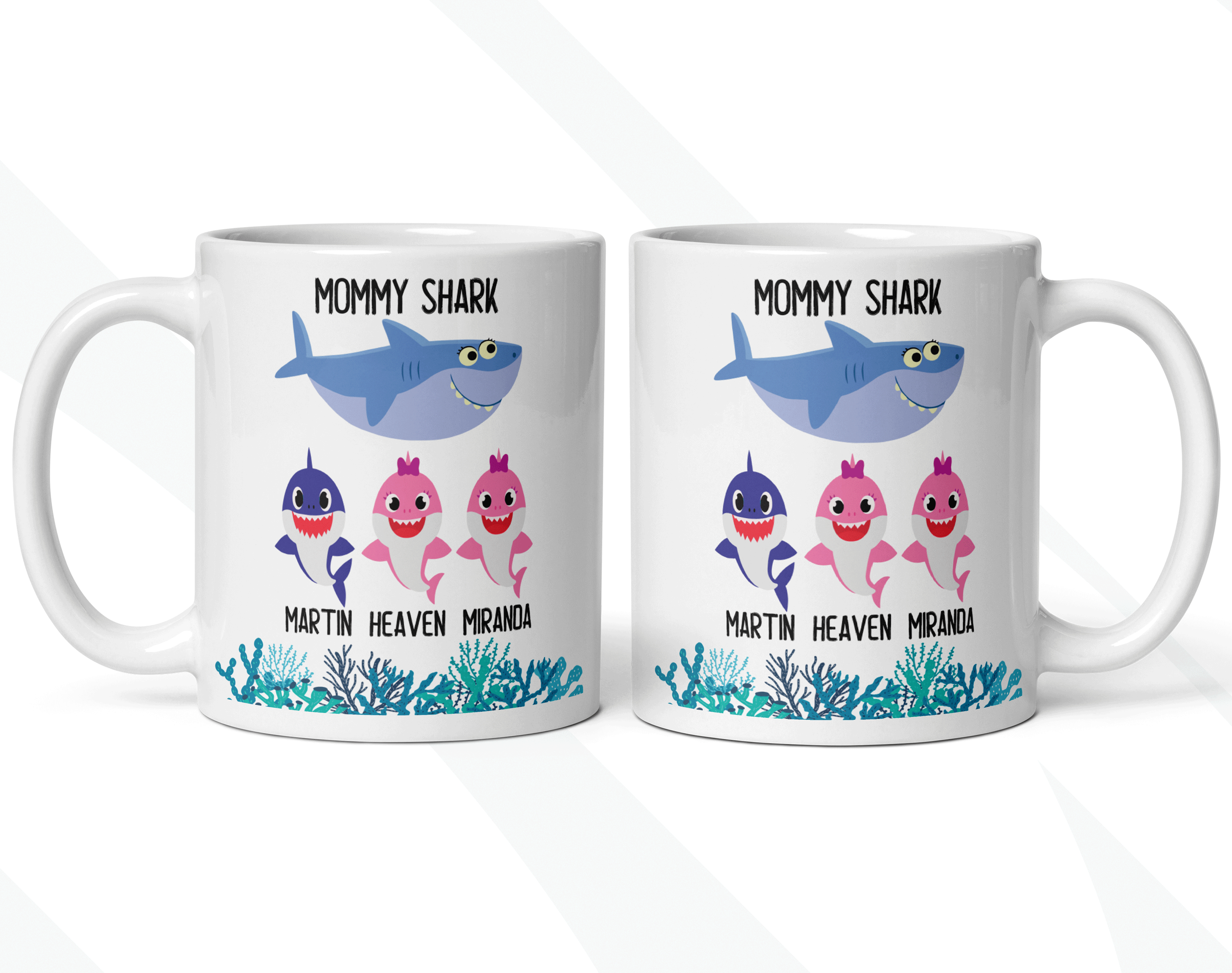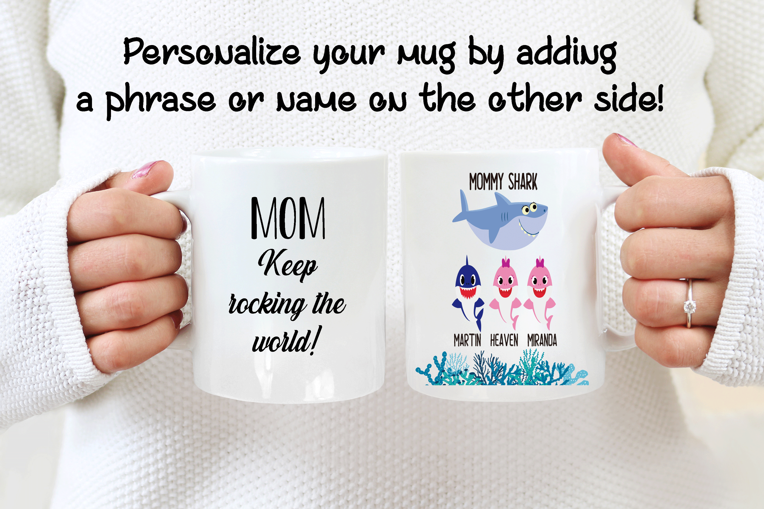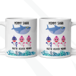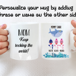 Your customized mug will be print on both sides, and you can choose to put in the back a name, phrase, or both as in the pictures. Please help us by providing us as much information as possible in the personalized text box. Please type the name(s) for each child and the color for each little shark in that box. We will take care of the rest! This mommy shark mug is your funny gift, so you get to design it as you wish!