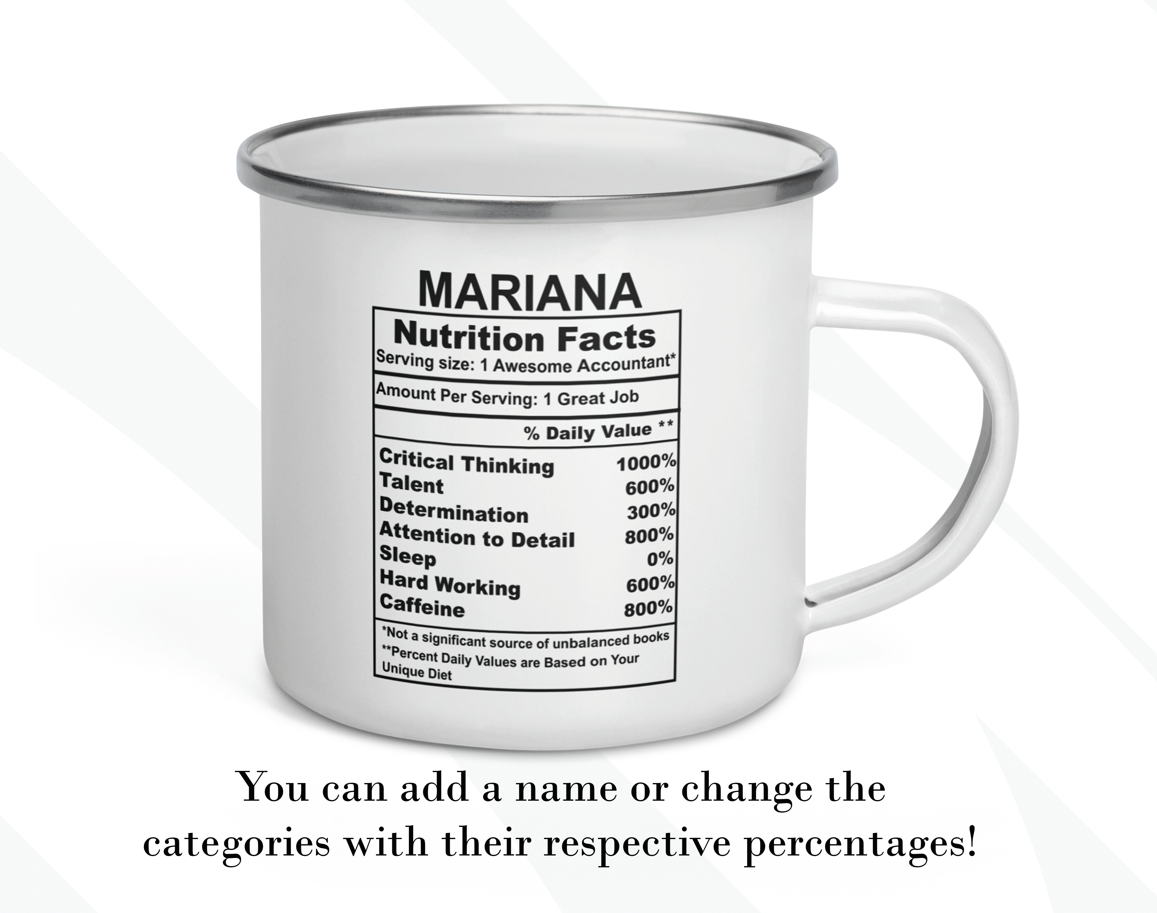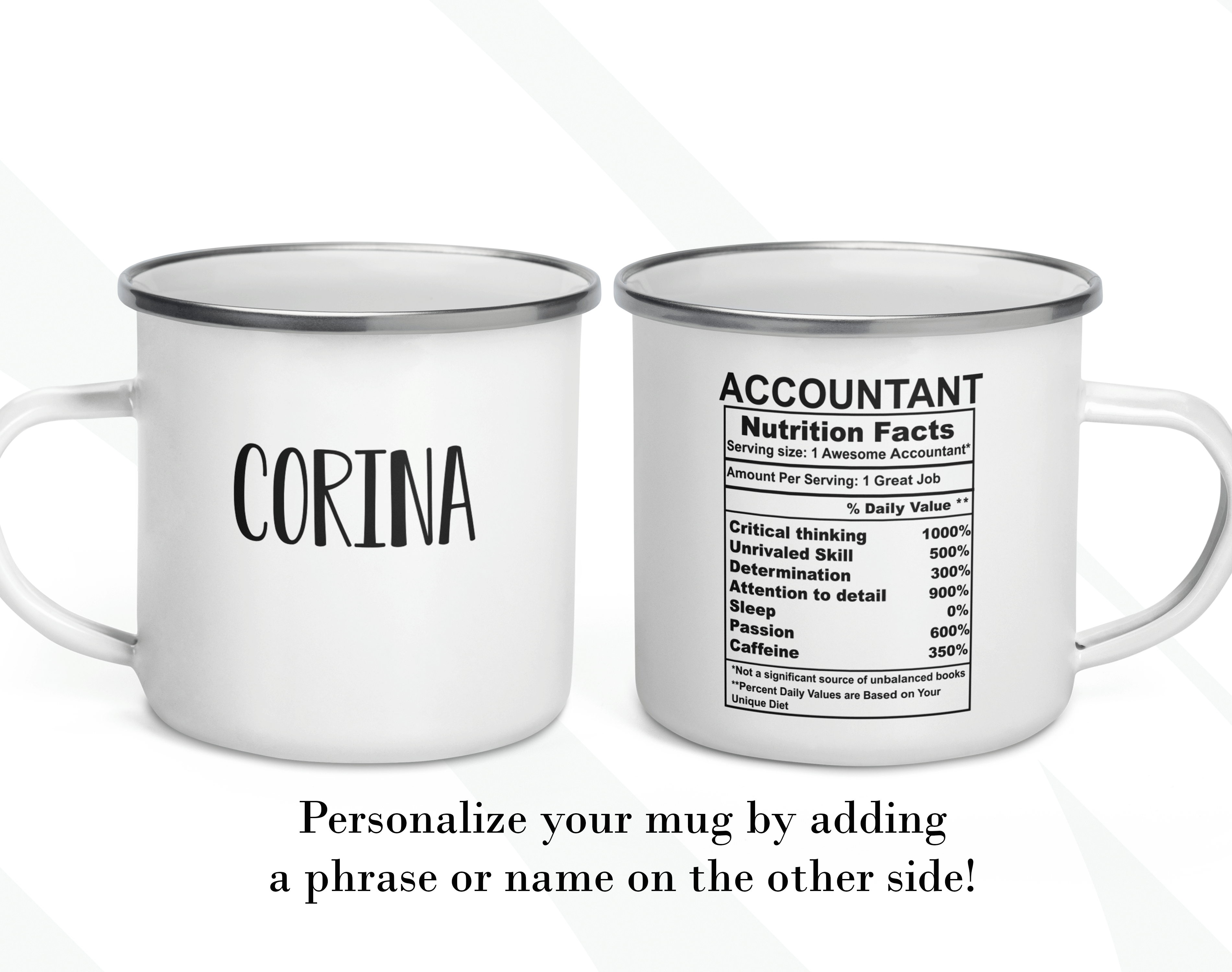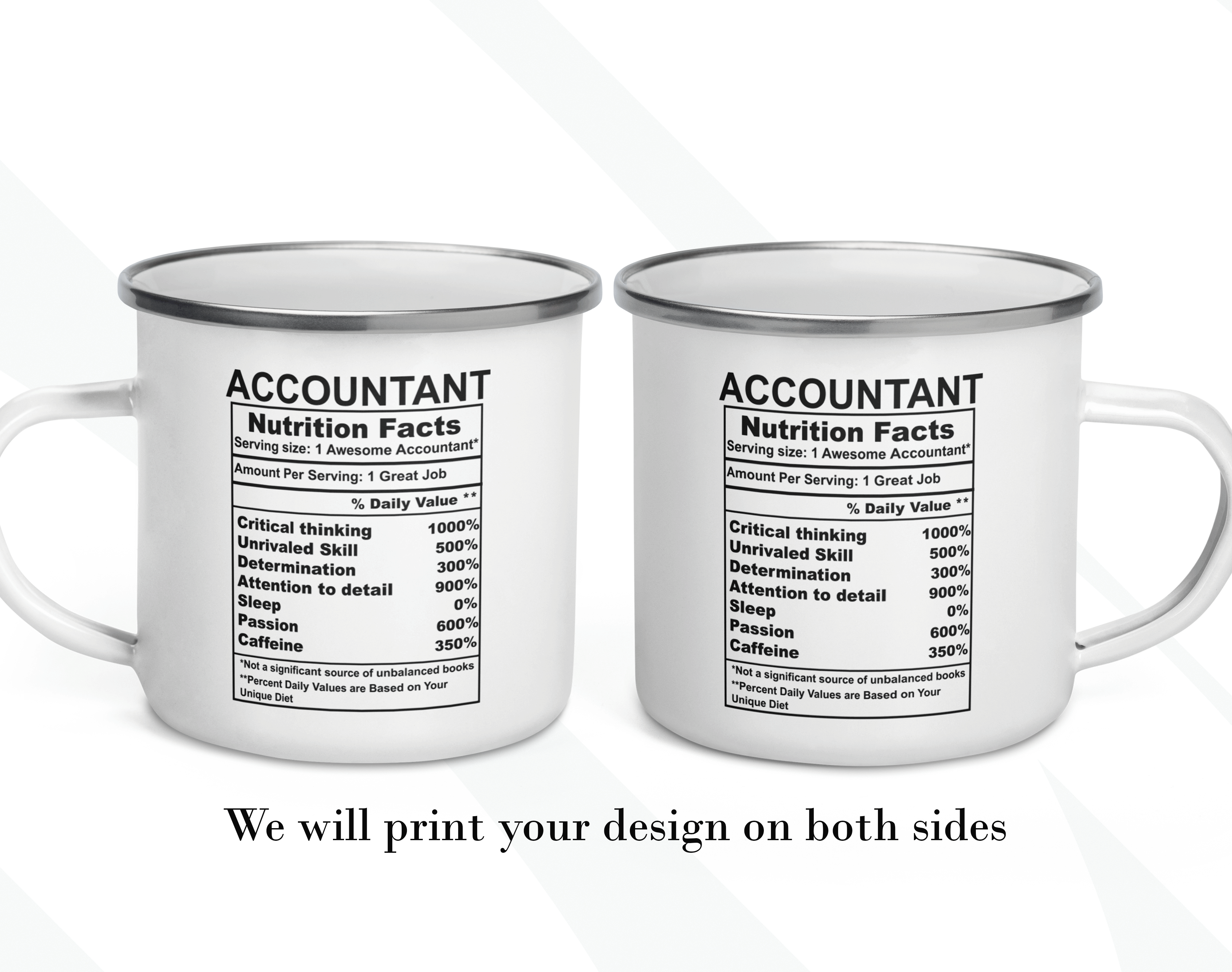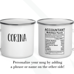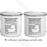 By default, we will print the main design on both sides of your accountant mug. You can put a name or phrase on the mug’s back, as in the pictures. If you add text to the mug’s back, please let us know your preferred font number (the options are on the pictures). As in the pictures, you can add a name or change the categories and percentages. Please help us by providing as much information as possible in the personalized text box; we will take care of the rest! It’s your customized mug, so you can design your accountant gift as you wish!