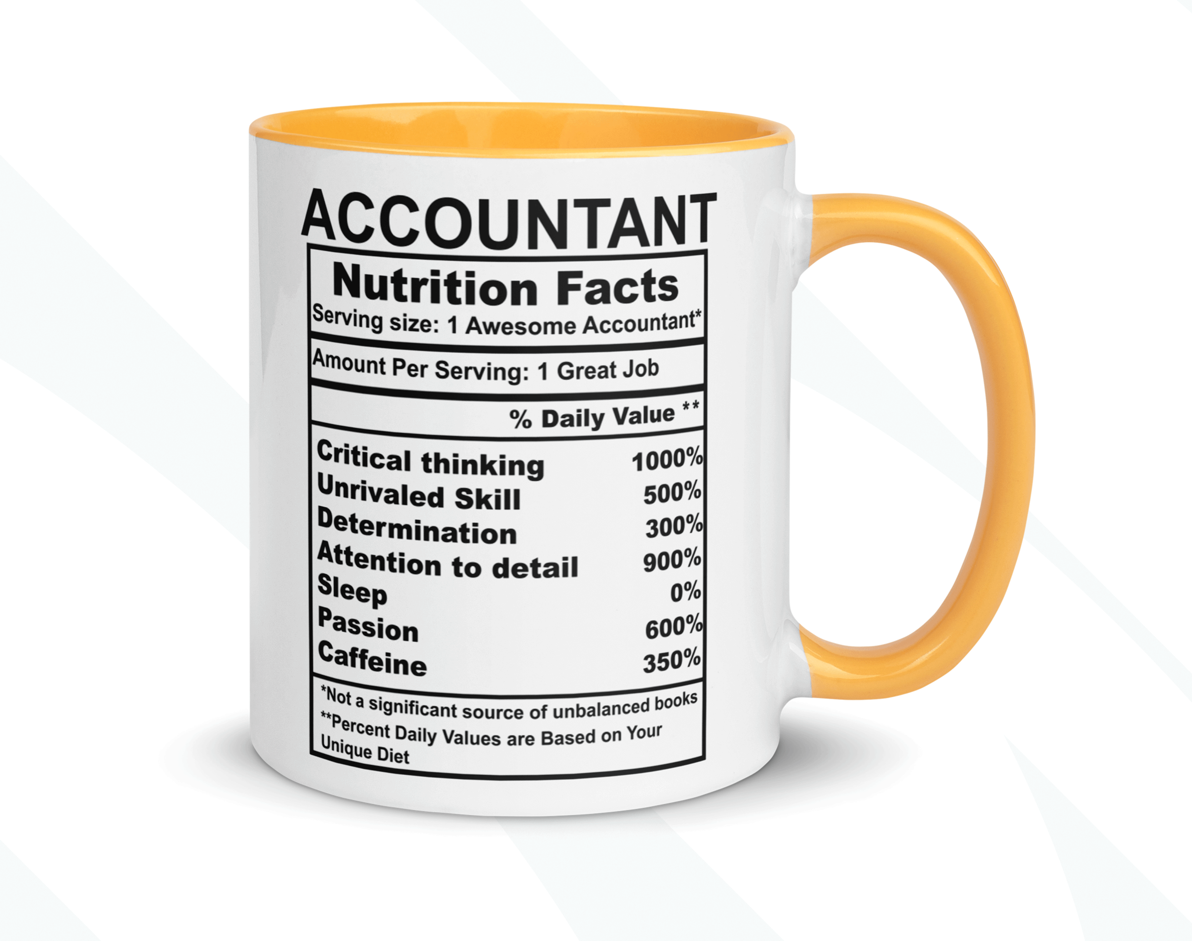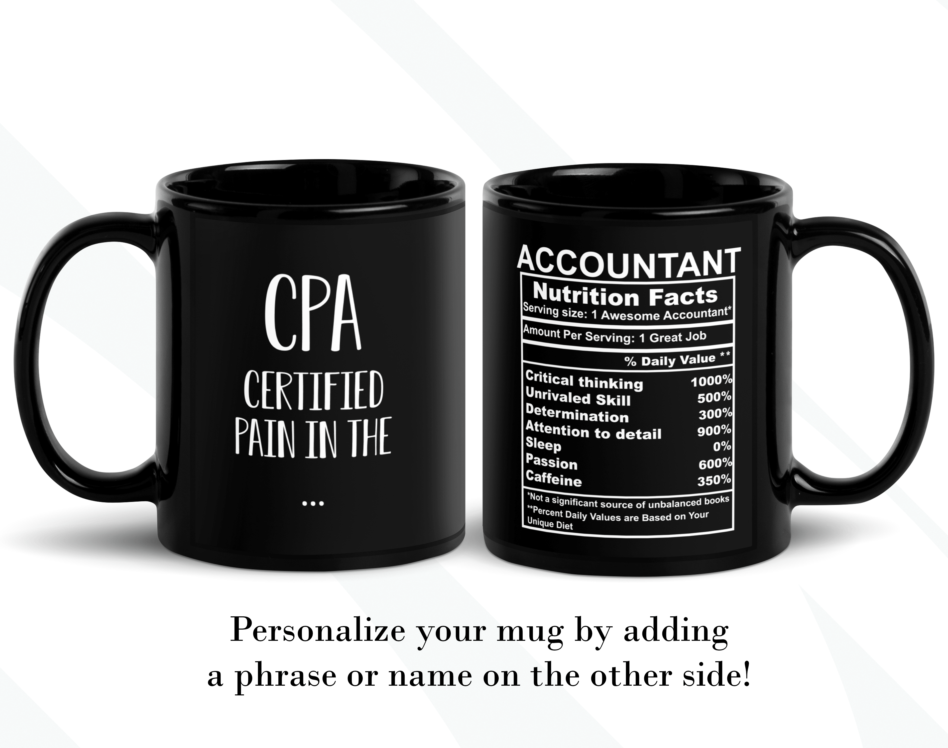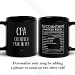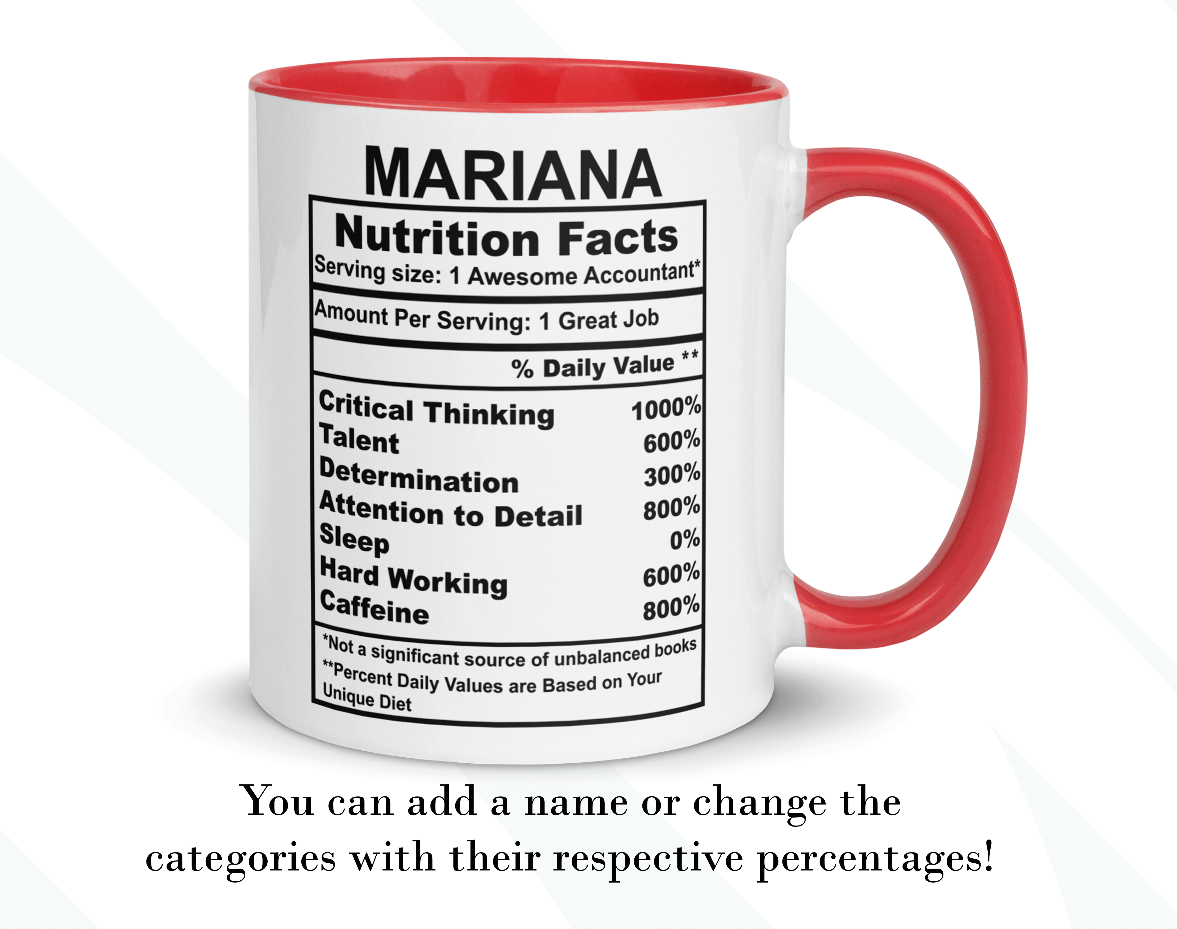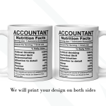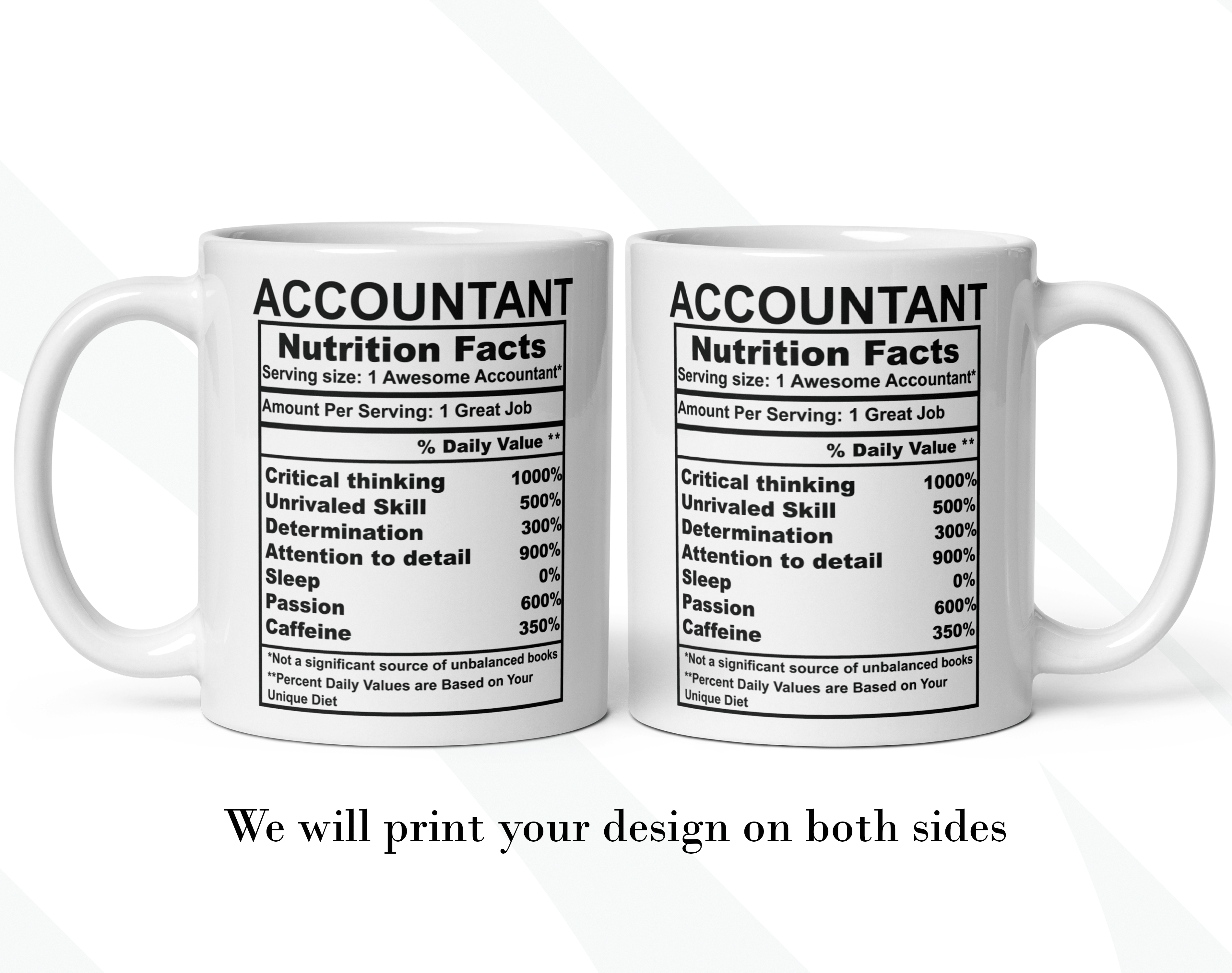 By default, we will print the main design on both sides of your accountant mug. You can put a name or phrase on the mug’s back, as in the pictures. If you add text to the mug’s back, please let us know your preferred font number (the options are on the pictures). As in the pictures, you can add a name or change the categories and percentages. Please help us by providing as much information as possible in the personalized text box; we will take care of the rest! It’s your personalized mug, so you can design your accountant gift as you wish!