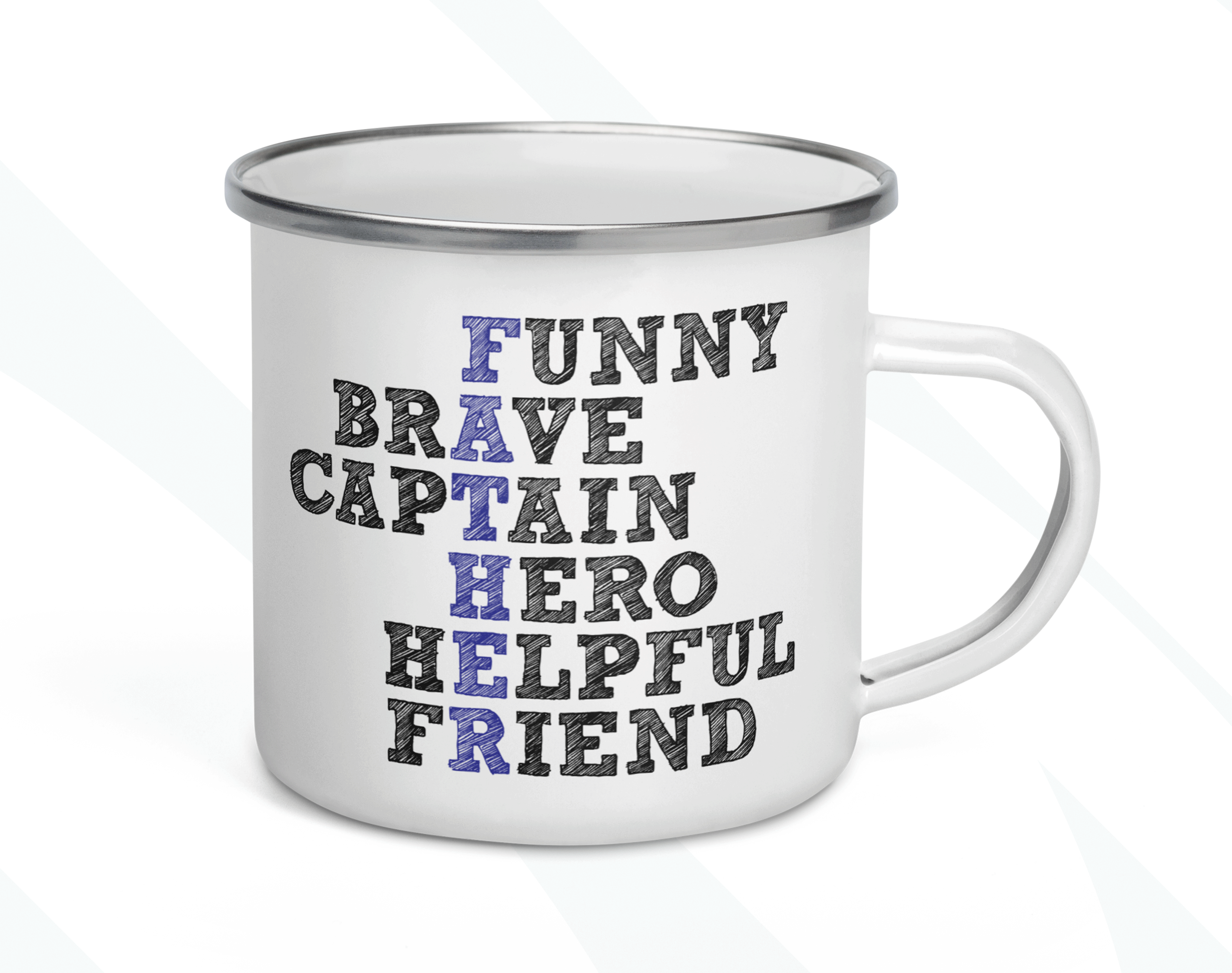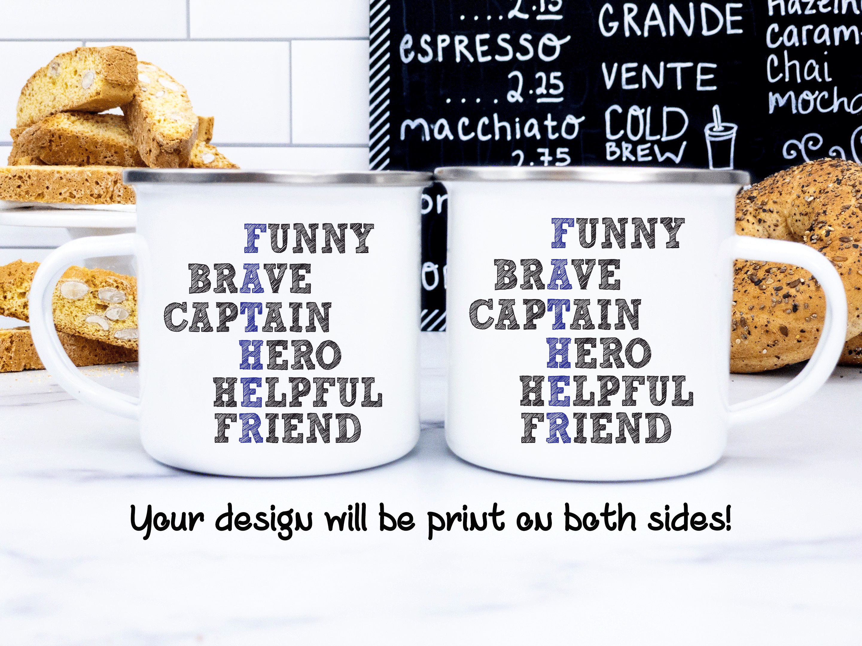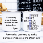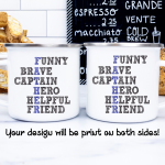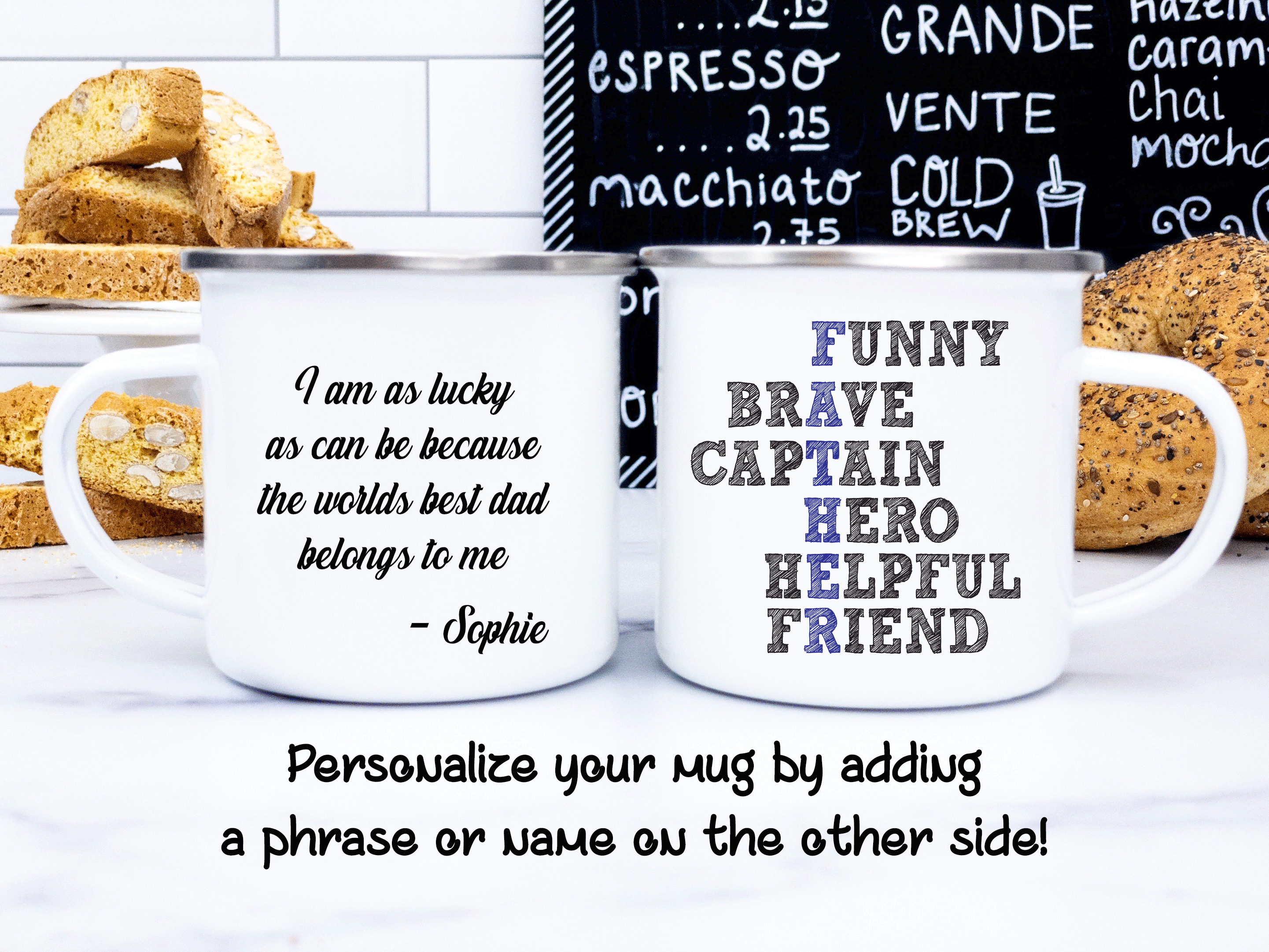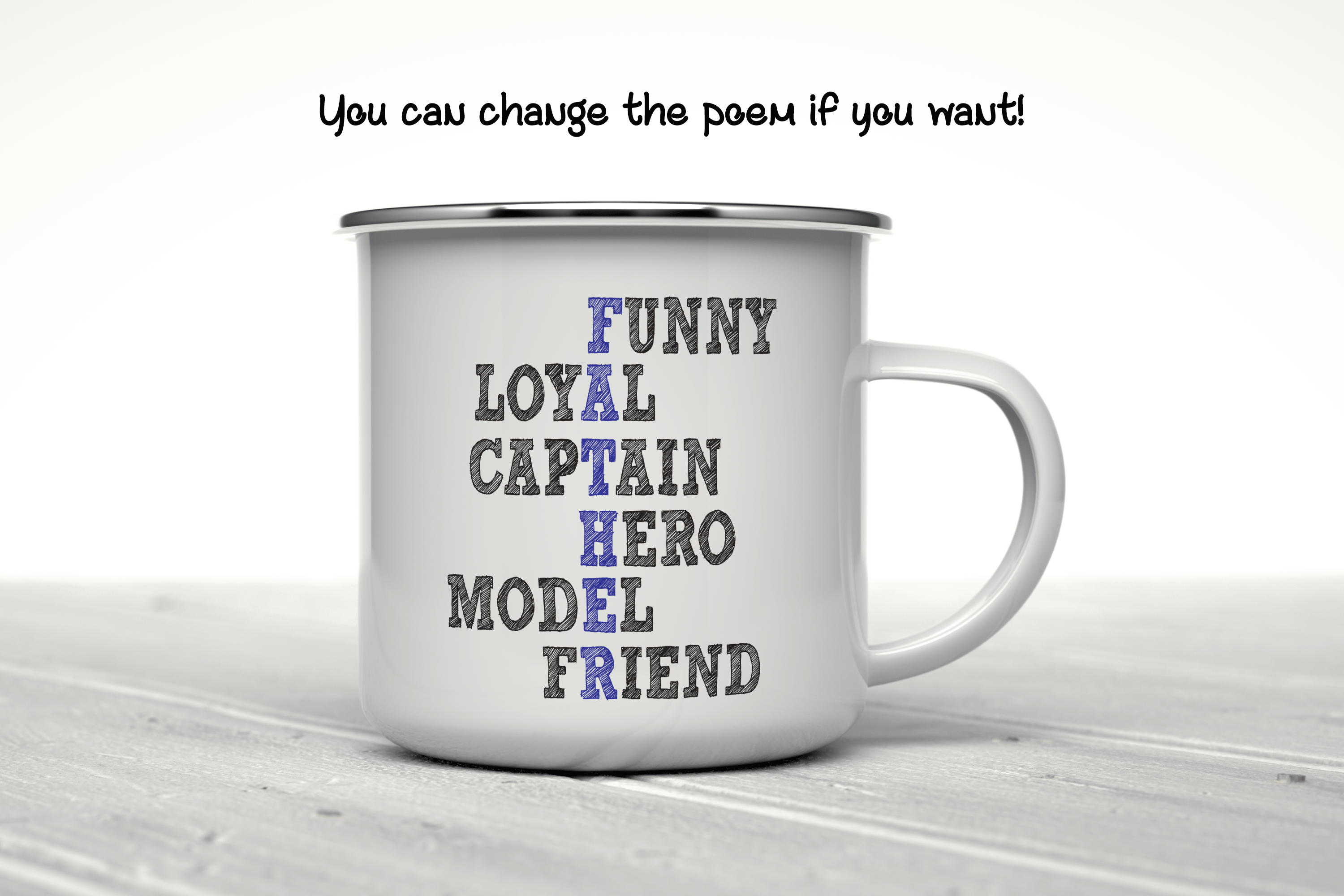 By default, we will print the main picture design on both sides. This Father’s Day gift is a personalized mug, where you can change the acrostic poem. Besides, if you want, you can choose to add in the mug’s back a name, phrase, or both, as in the pictures. And if you do so, please provide us with as much information as possible in the personalized text box; we will take care of the rest. This virtues mug is your custom gift, so you get to design your father’s gift as you wish!