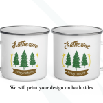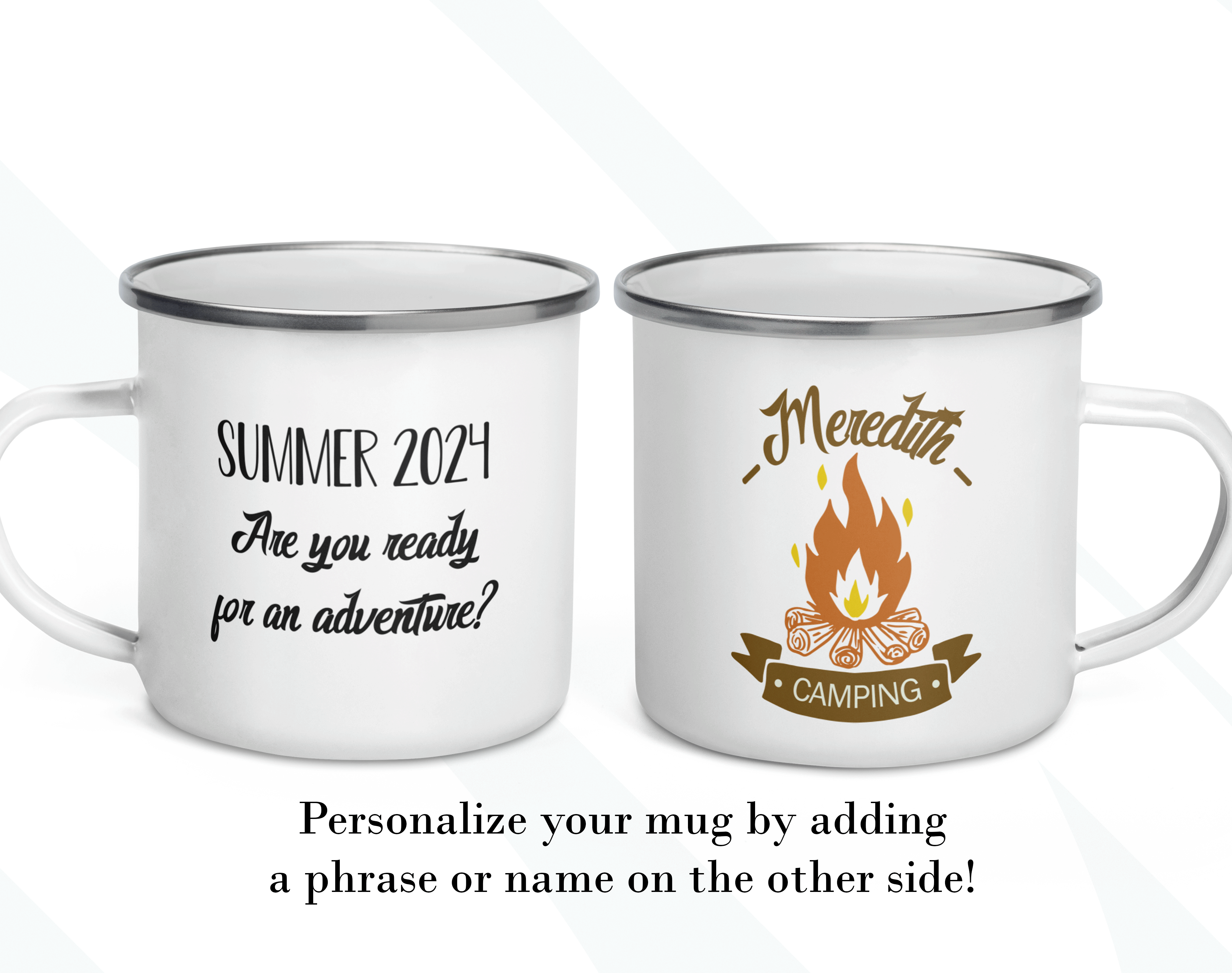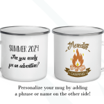 By default, we will print your custom campfire mug on both sides. You can put a phrase on the mug’s back, as in the pictures. Please help us by providing the name for the design in the personalized text box; we will take care of the rest. If you add text on the mug’s back, please let us know your preferred font number (the options are on the pictures). This camper mug is your personalized mug, so you can design your campfire mug as you wish!
