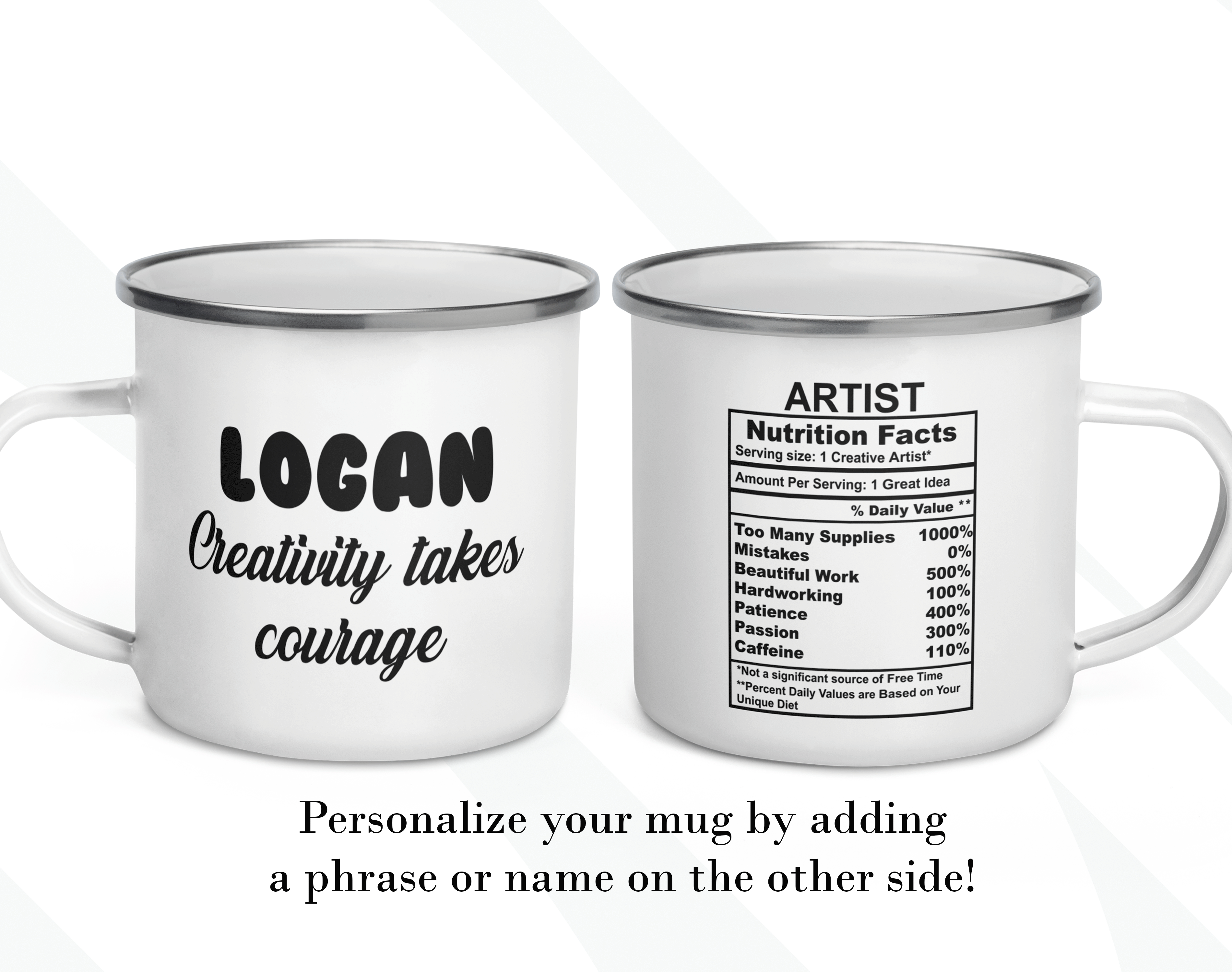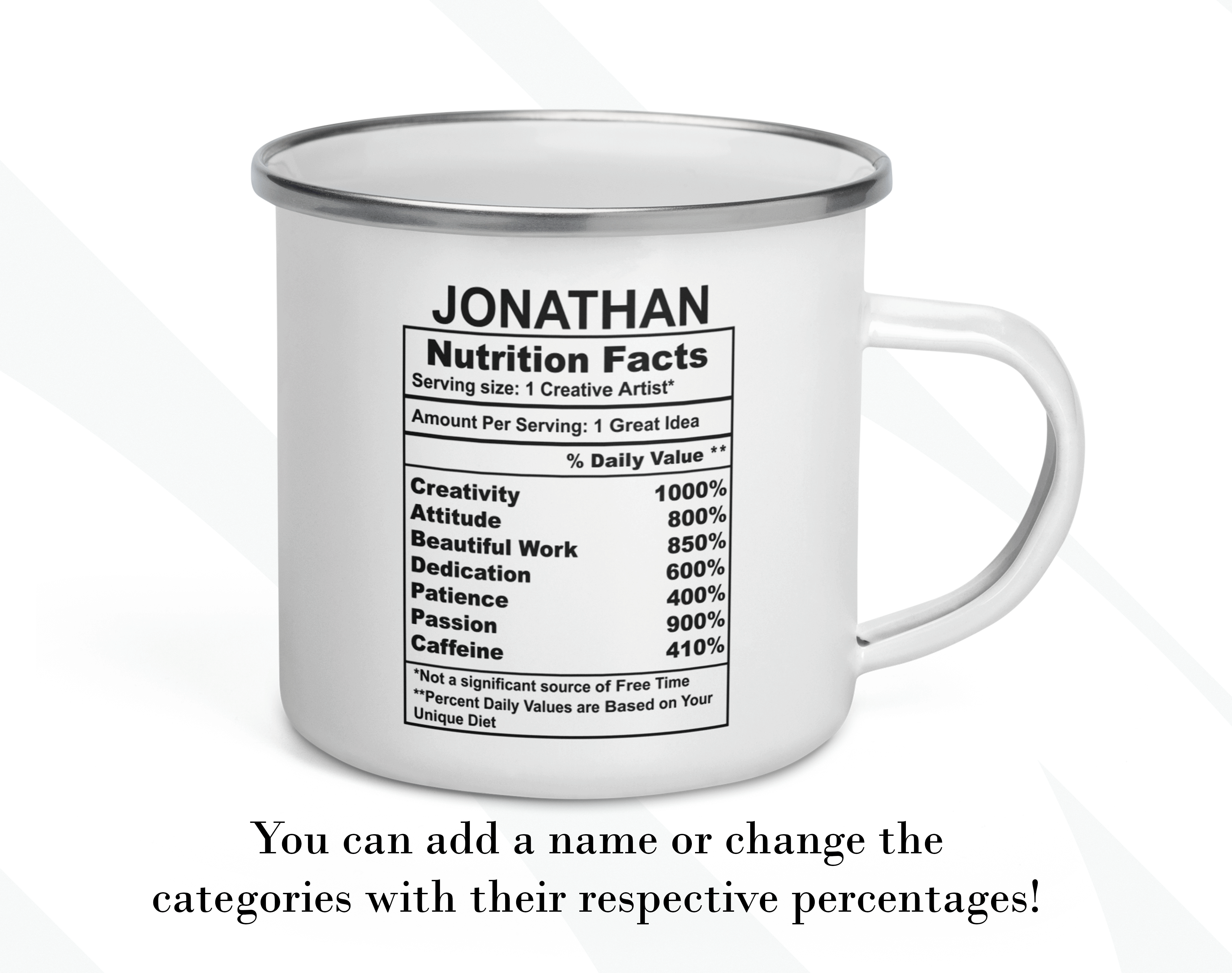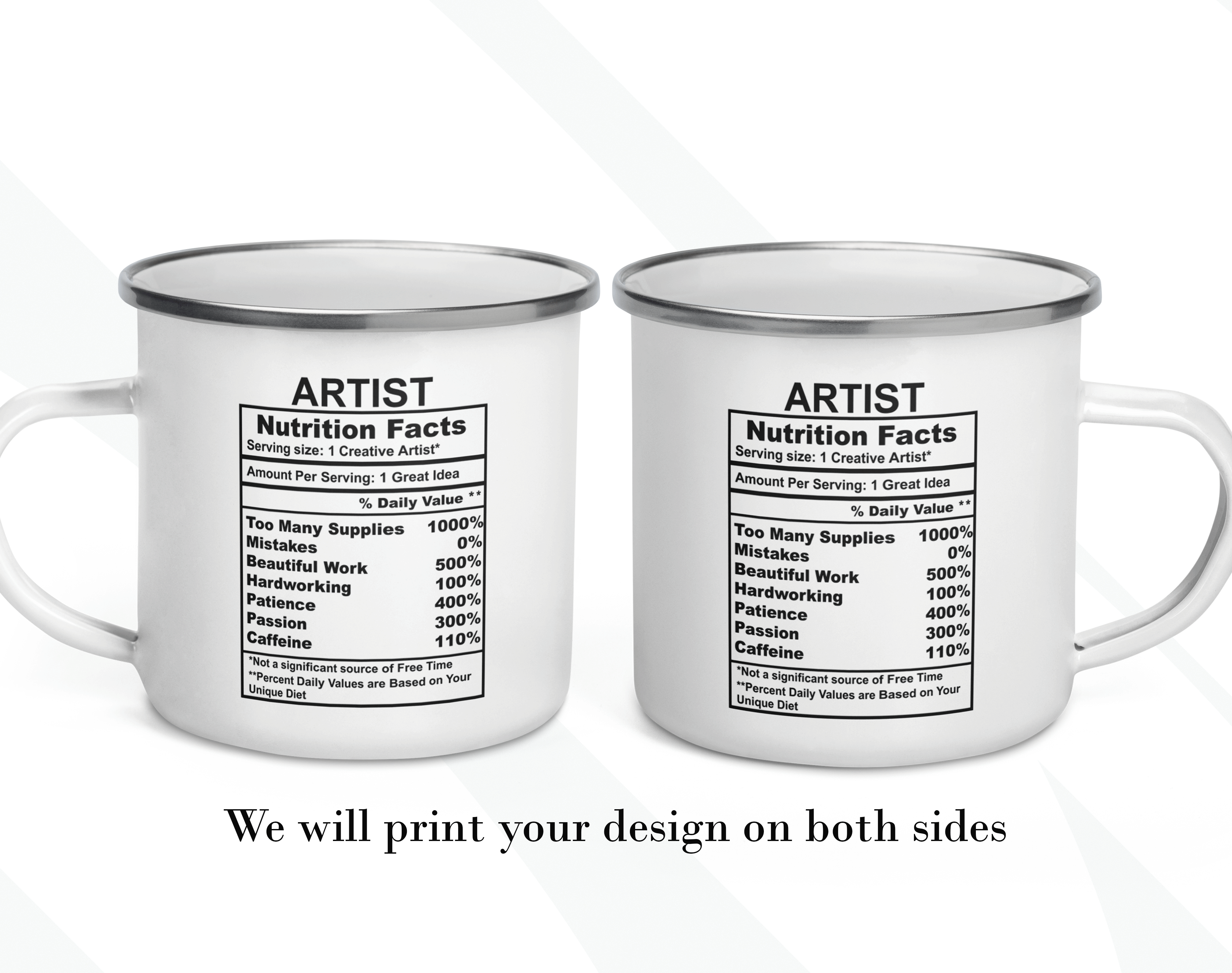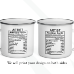 By default, we will print the main design on both sides of your artist mug. You can put a name or phrase on the mug’s back, as in the pictures. If you add text to the mug’s back, please let us know your preferred font number (the options are on the pictures). As in the pictures, you can add a name or change the categories and percentages. Please help us by providing as much information as possible in the personalized text box; we will take care of the rest! It’s your customized mug, so you can design your gift for an artist as you wish!