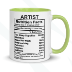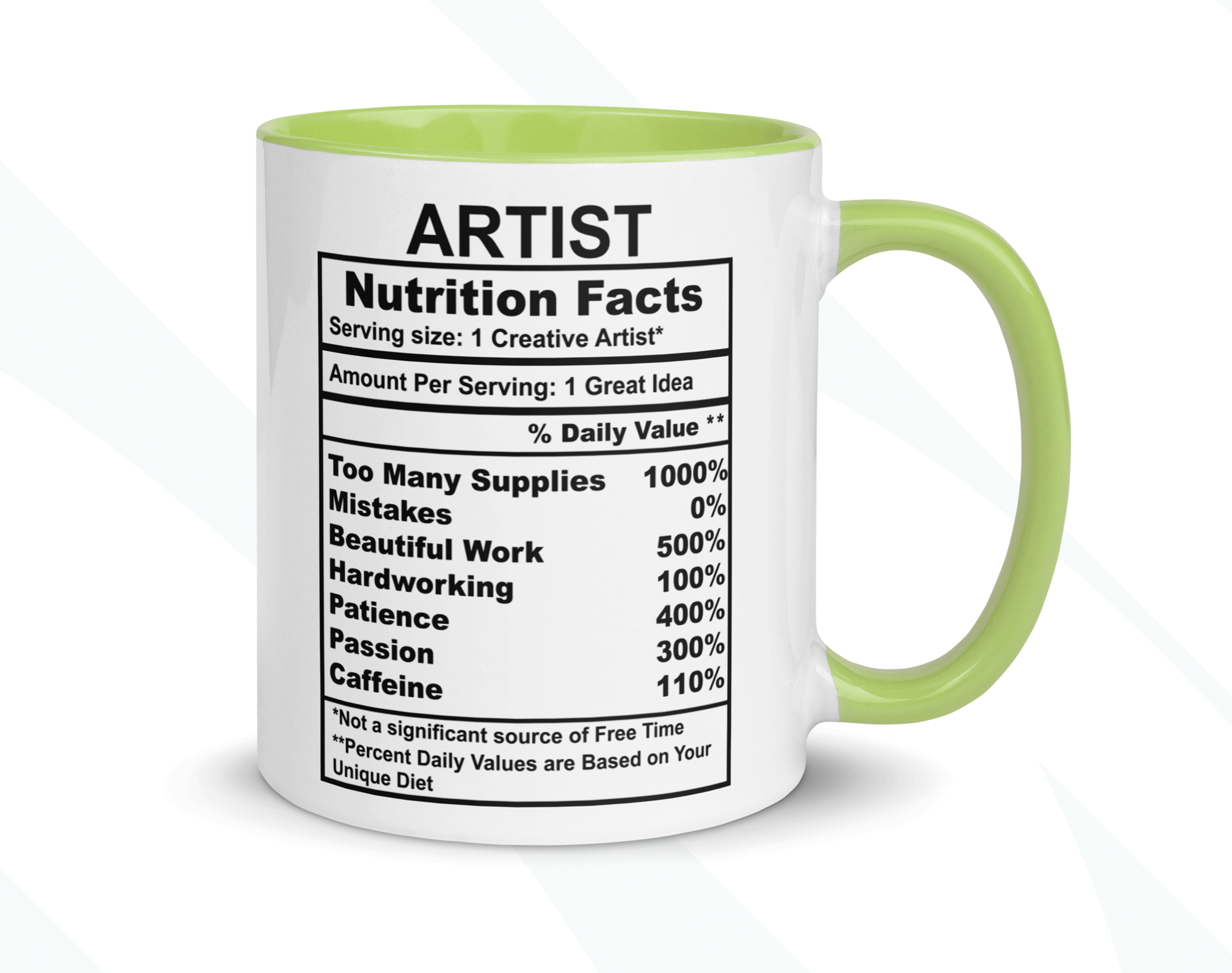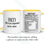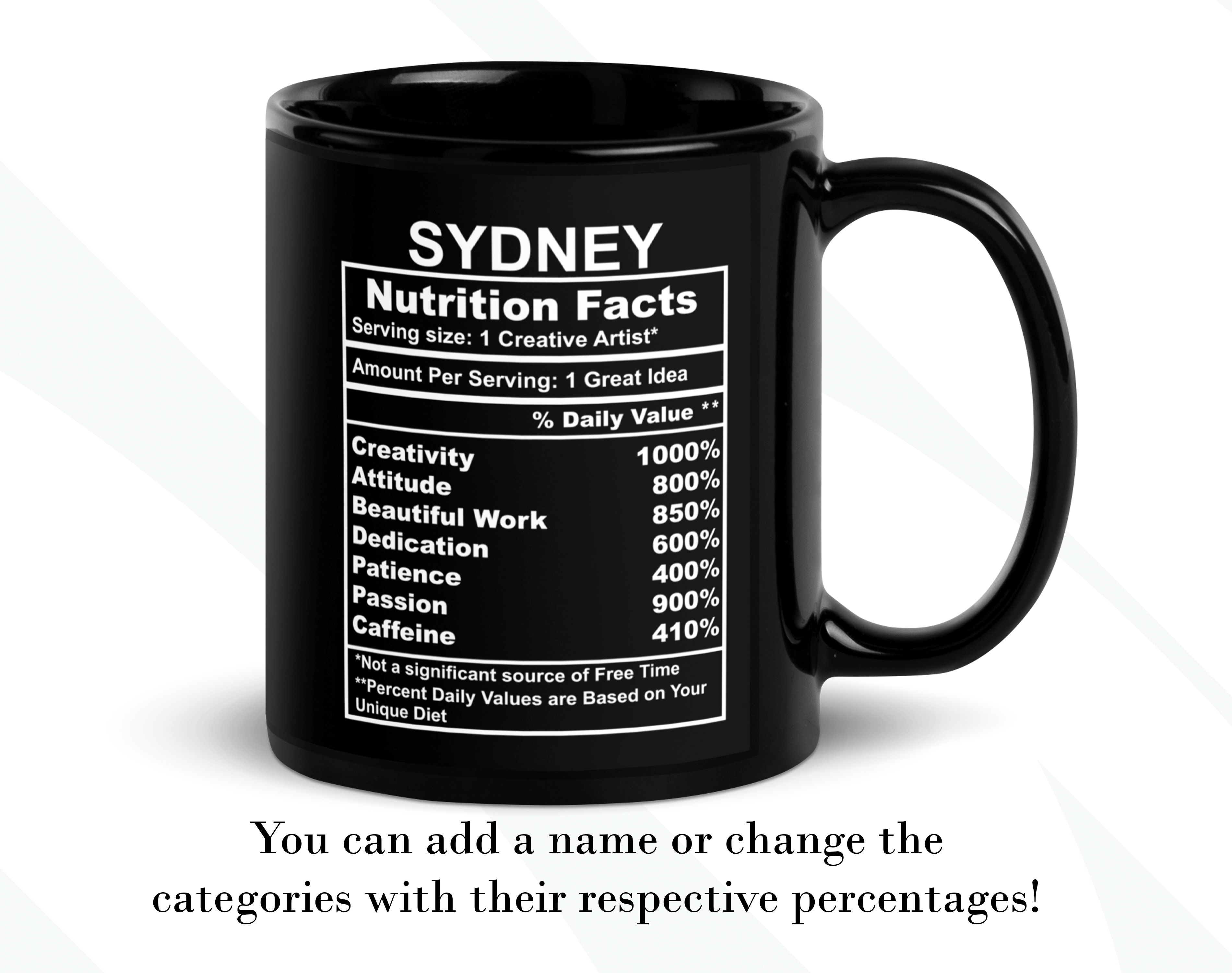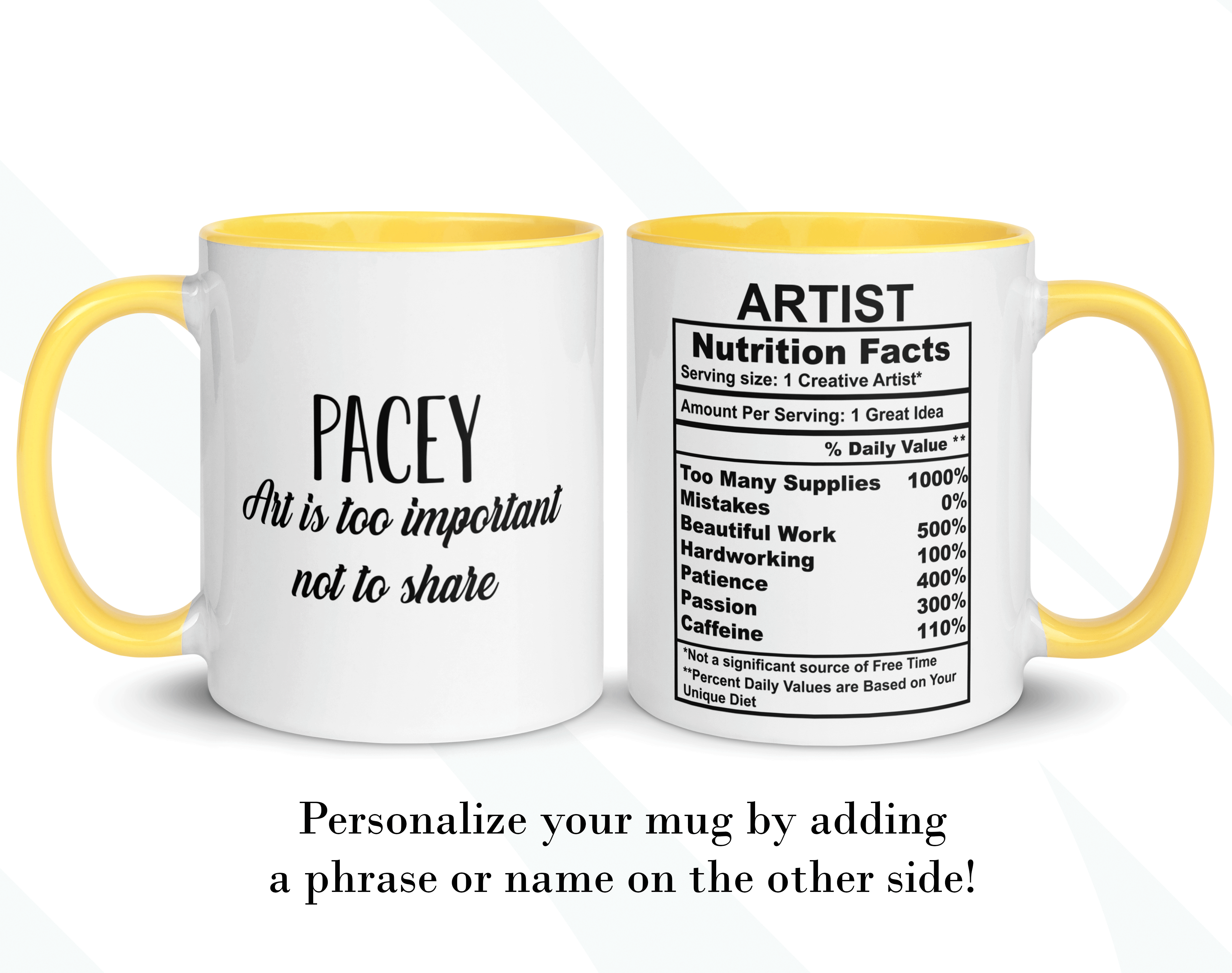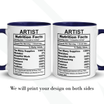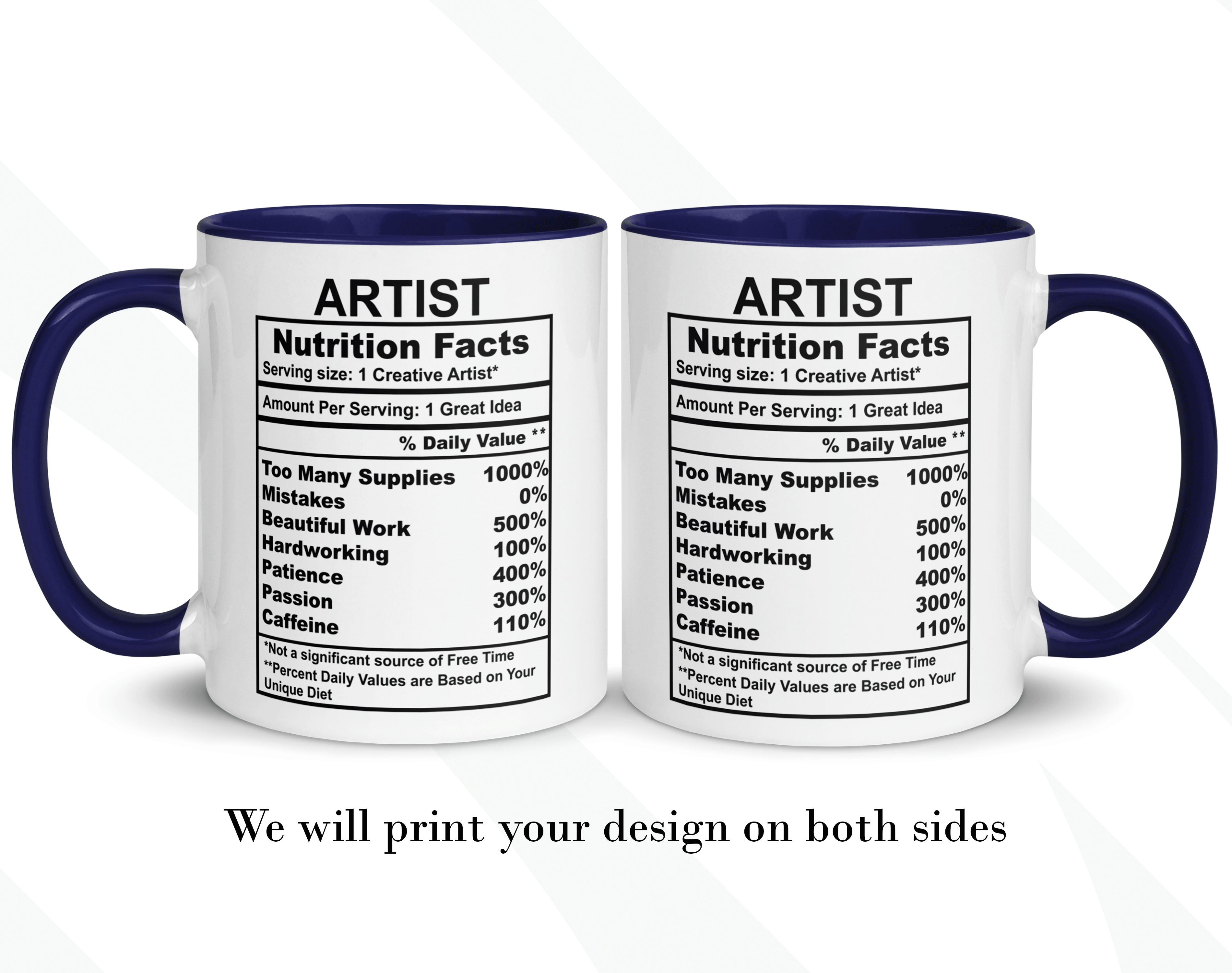 By default, we will print the main design on both sides of your artist mug. You can put a name or phrase on the mug’s back, as in the pictures. If you add text to the mug’s back, please let us know your preferred font number (the options are on the pictures). As in the pictures, you can add a name or change the categories and percentages. Please help us by providing as much information as possible in the personalized text box; we will take care of the rest! It’s your personalized mug, so you can design your artist gift as you wish!