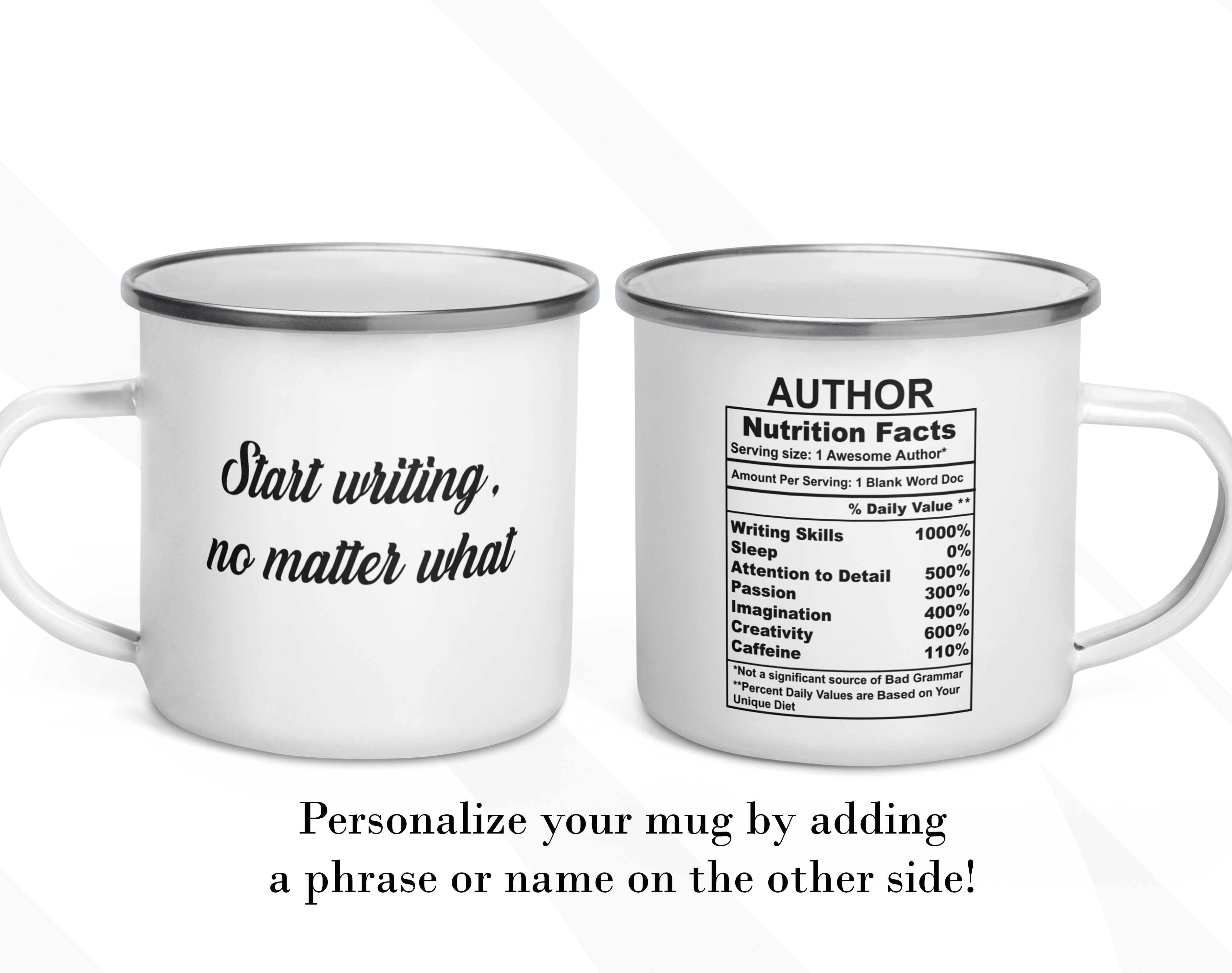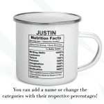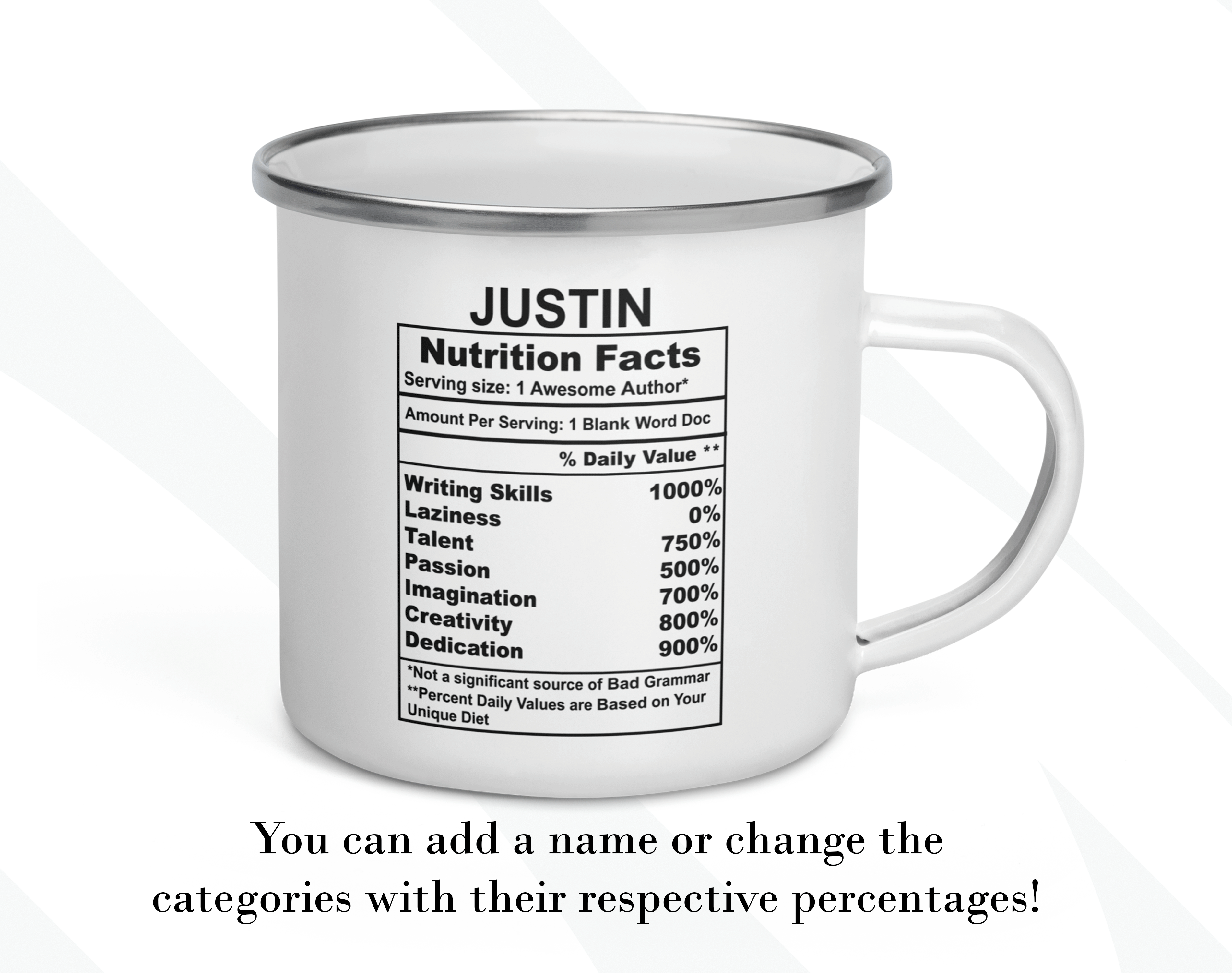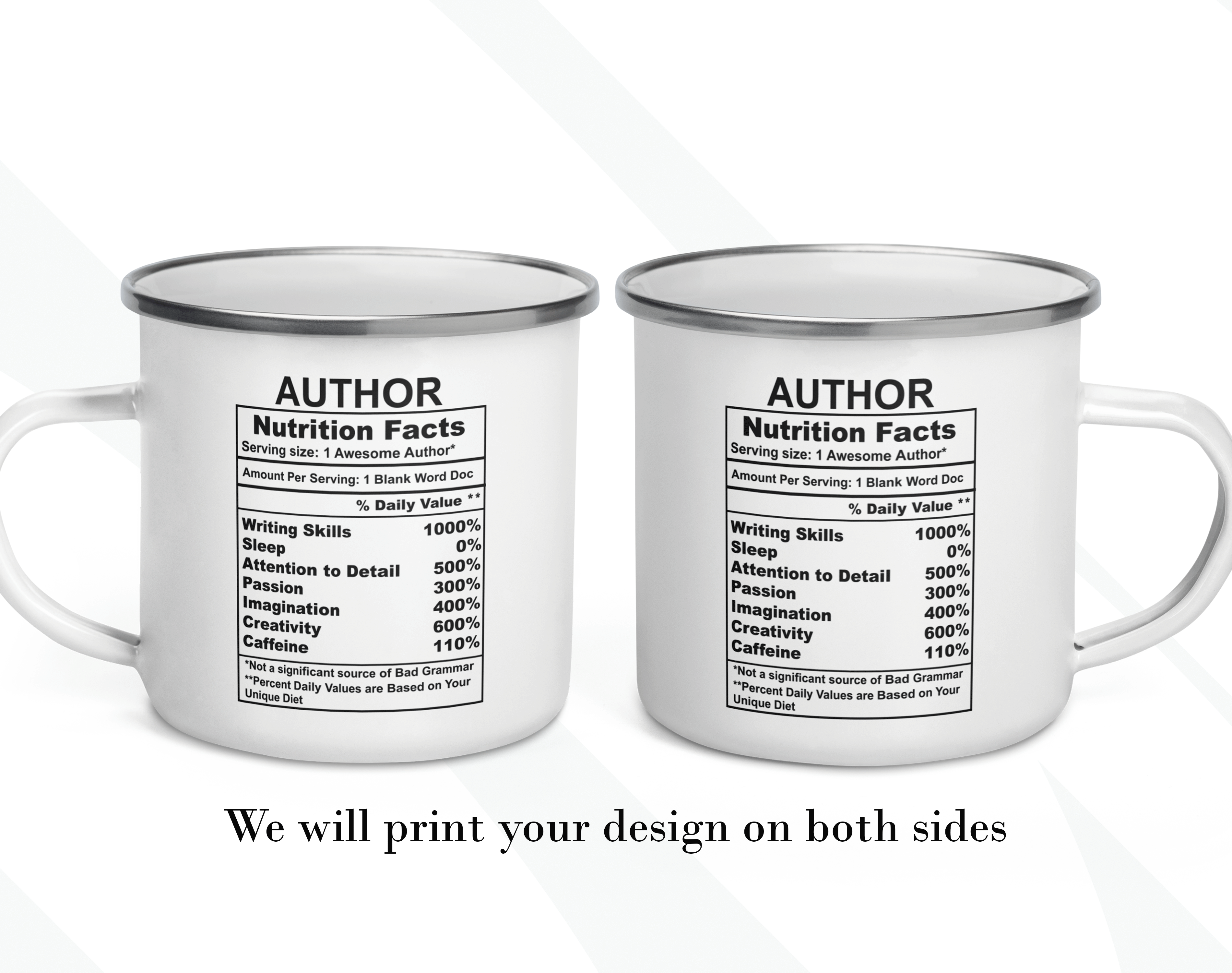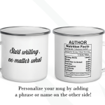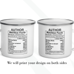 By default, we will print the main design on both sides of your author’s mug. You can put a name or phrase on the mug’s back, as in the pictures. If you add text to the mug’s back, please let us know your preferred font number (the options are on the pictures). As in the pictures, you can add a name or change the categories and percentages. Please help us by providing as much information as possible in the personalized text box; we will take care of the rest! It’s your customized mug, so you can design your gift for an author as you wish!