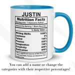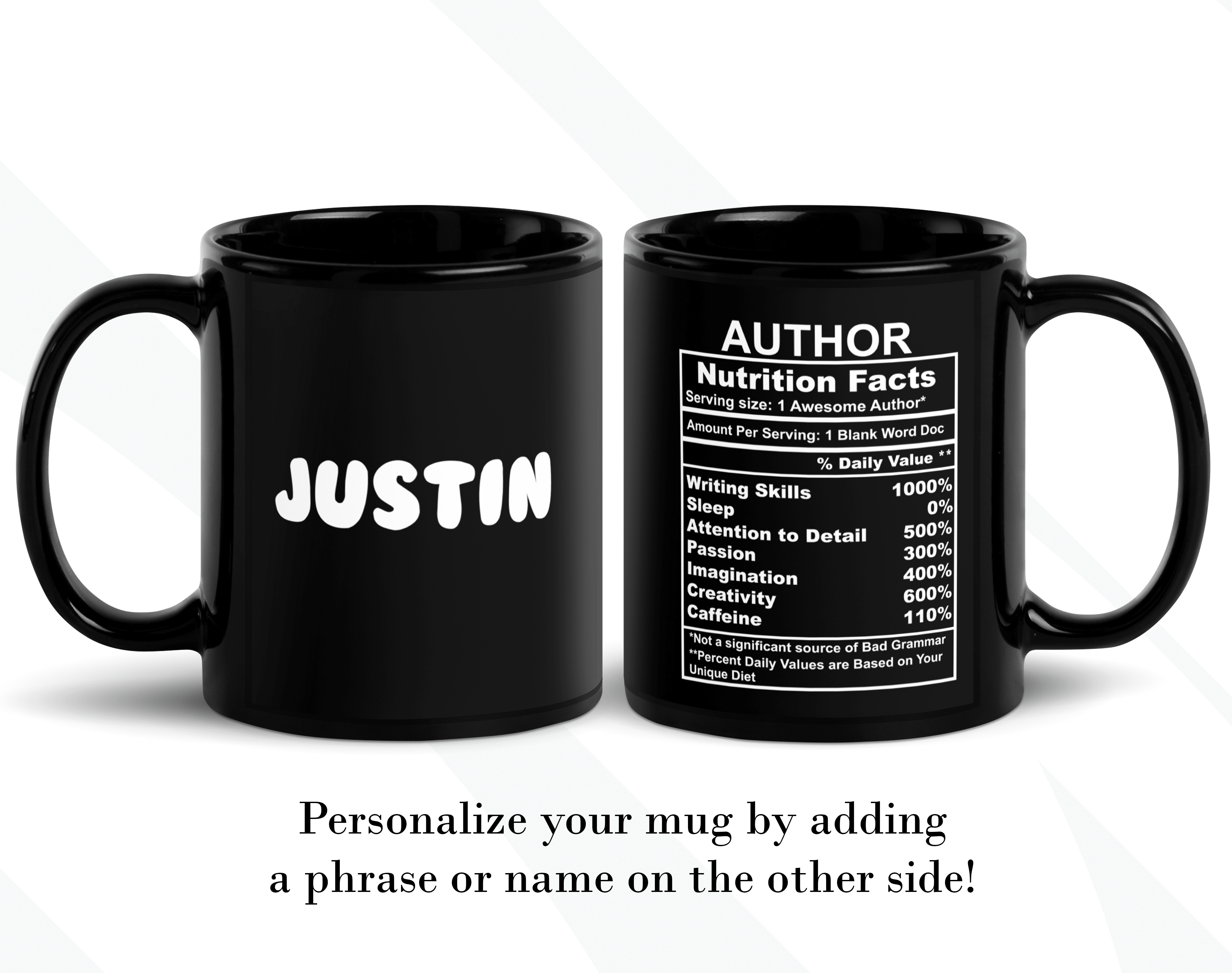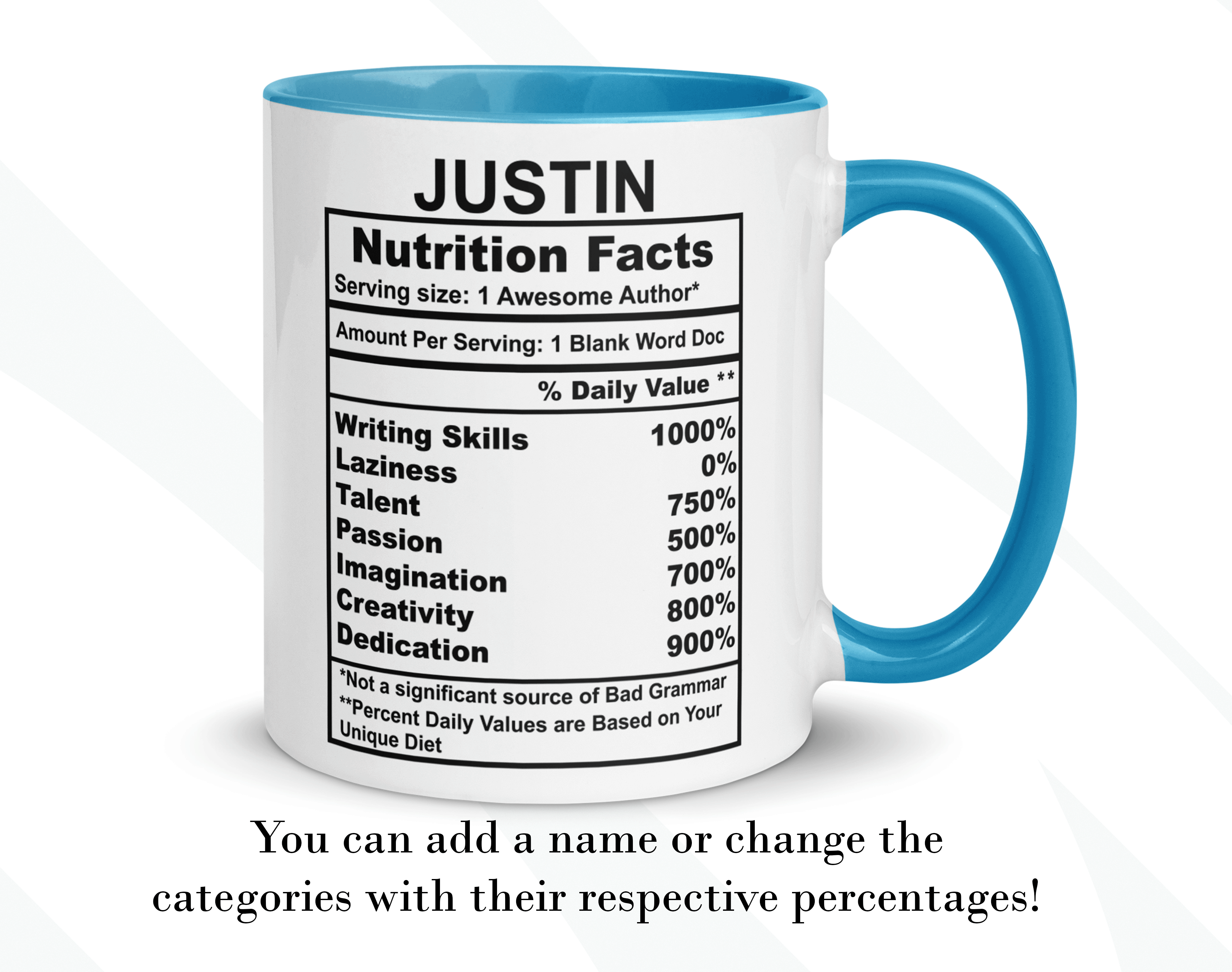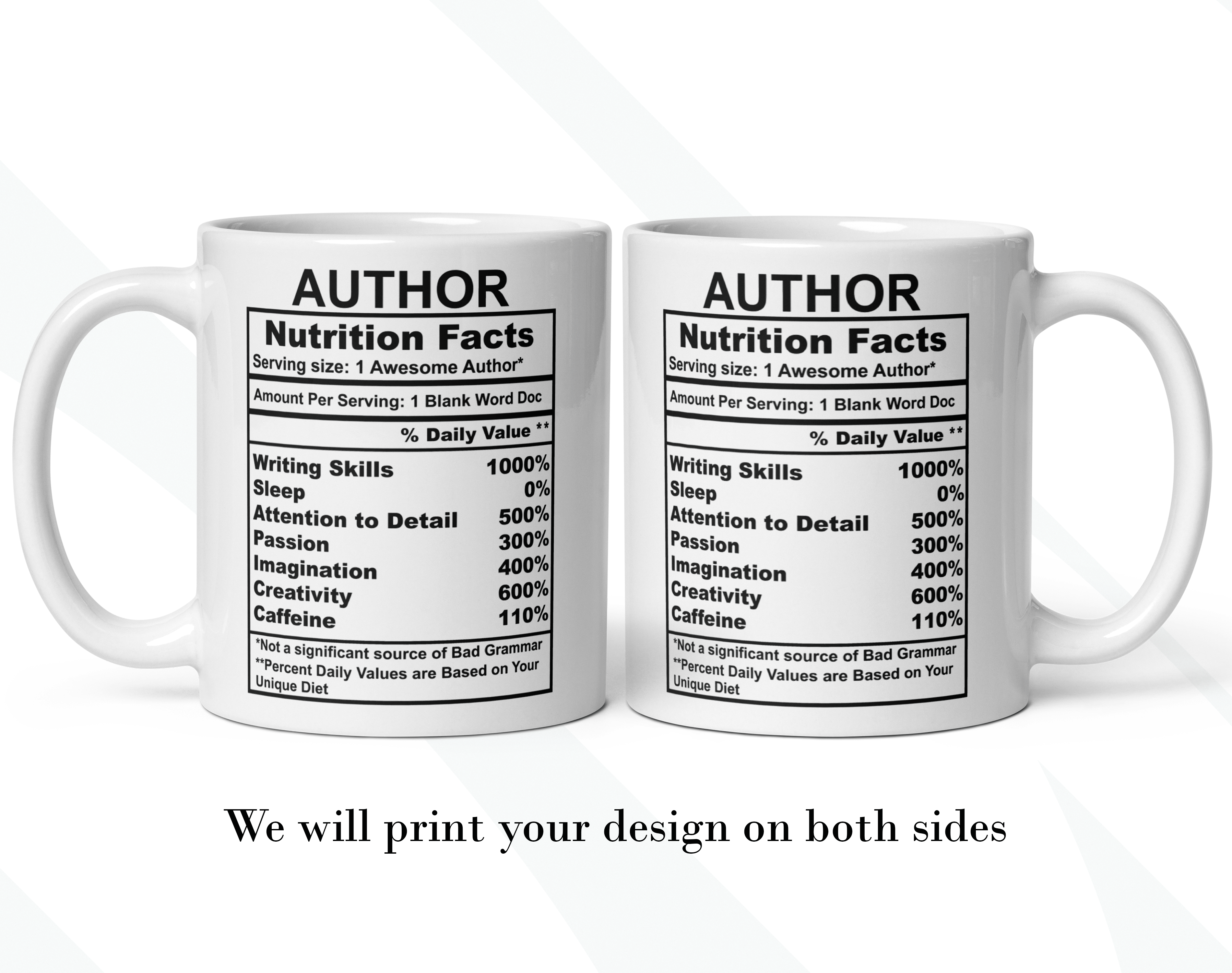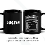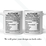 By default, we will print the main design on both sides of your author’s mug. You can put a name or phrase on the mug’s back, as in the pictures. If you add text to the mug’s back, please let us know your preferred font number (the options are on the pictures). As in the pictures, you can add a name or change the categories and percentages. Please help us by providing as much information as possible in the personalized text box; we will take care of the rest! It’s your personalized mug, so you can design your gift for an author as you wish!