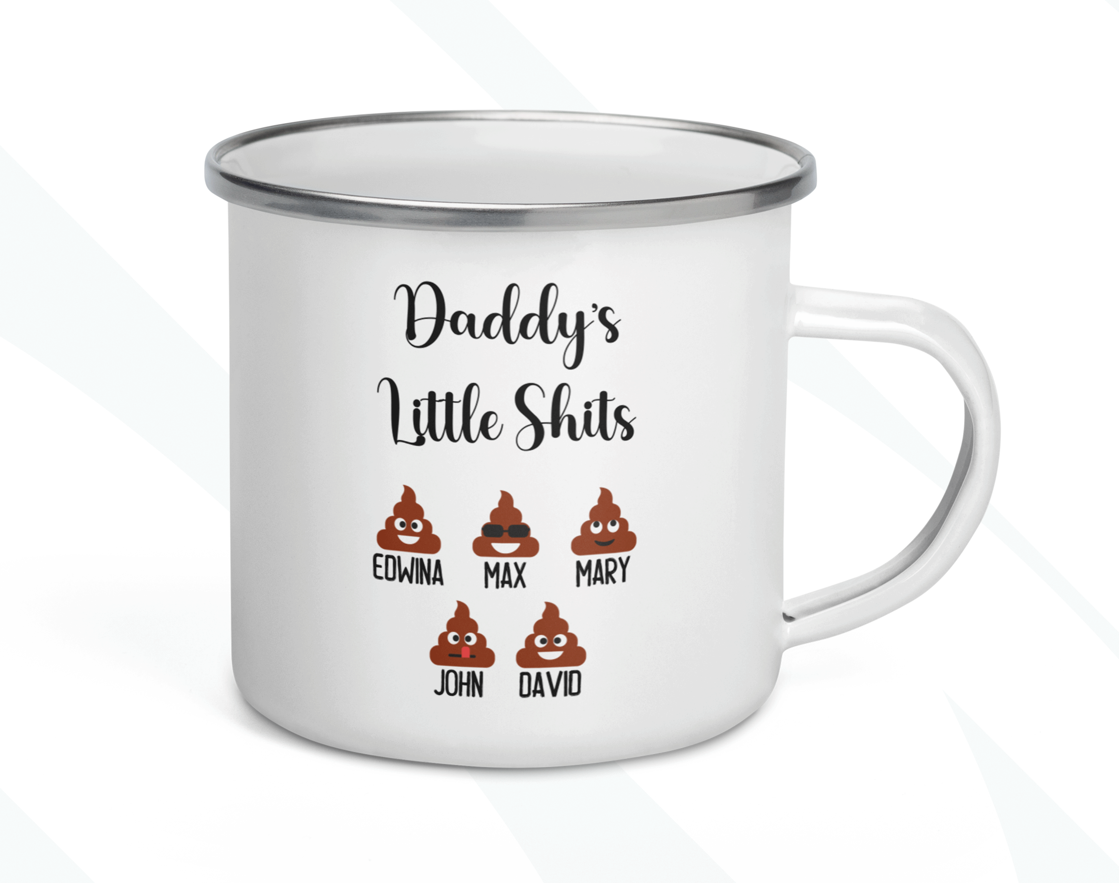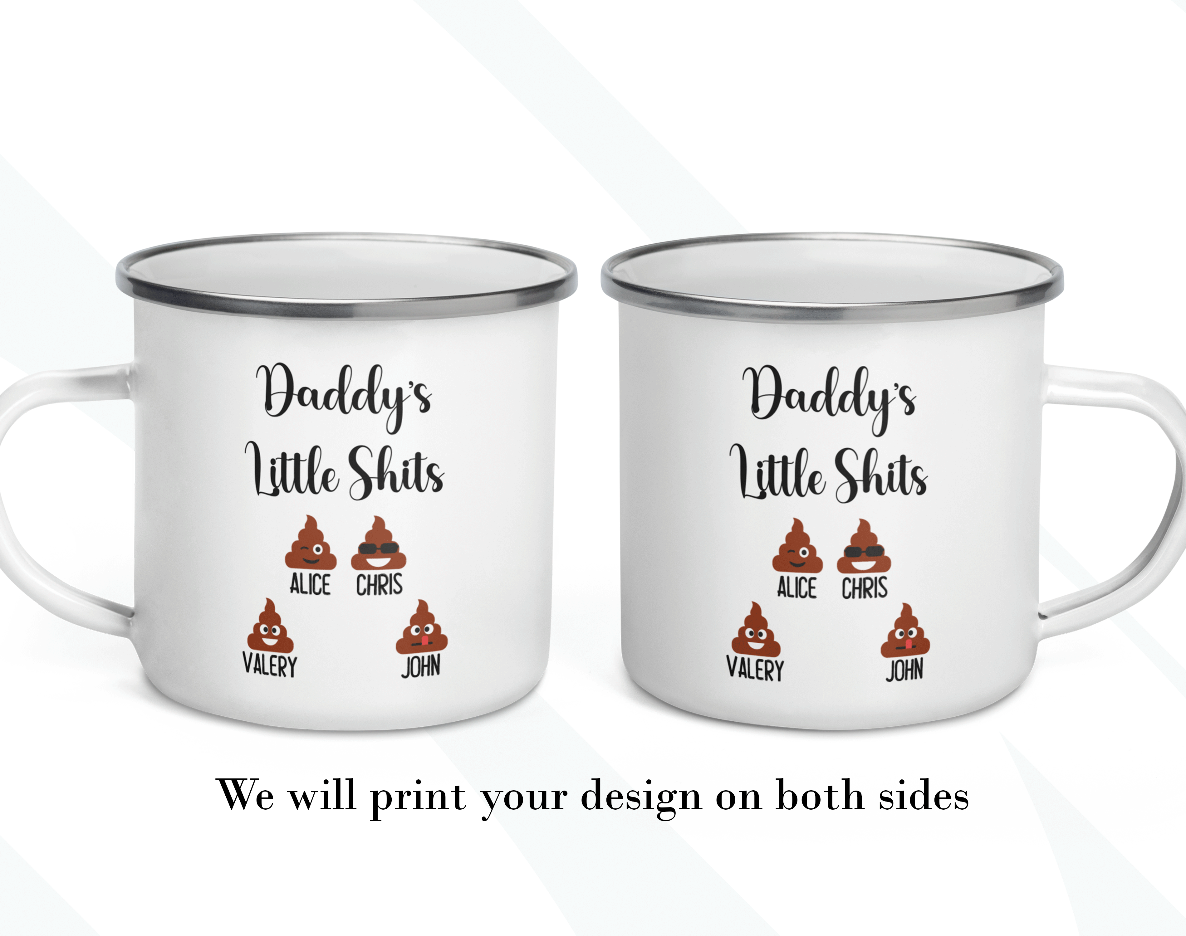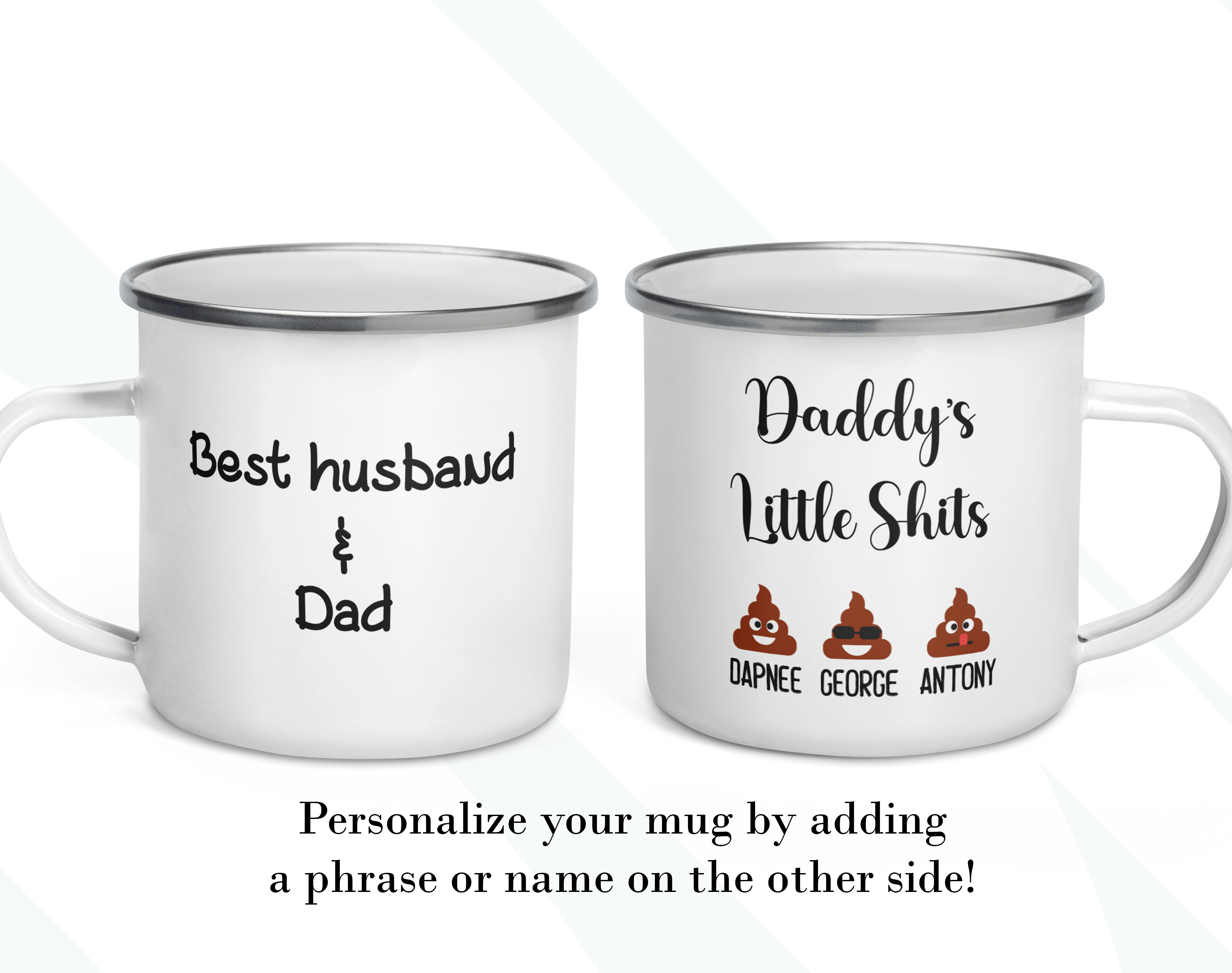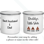 By default, we will print your personalized mug on both sides. As in the pictures, you can add a name, phrase, or both to your custom gift on the mug’s back. If you want to do it that way, please provide us with as much information as possible in the personalized text box. Please type the name(s) followed by the emoji option in the personalized text box. We will take care of the rest! It’s your customized mug, so you get to design your gift for Dad as you wish!