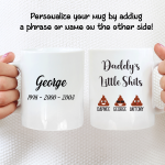 By default, we will print your personalized mug on both sides. You can add to your custom gift a name, phrase, or both, on the mug’s back, as in the pictures. If you want to do it that way, please provide us with as much information as possible in the personalized text box. Please, type the name(s) followed by the emoji option in the personalized text box. We will take care of the rest! It’s your customized mug, so you get to design your gift for dad as you wish!