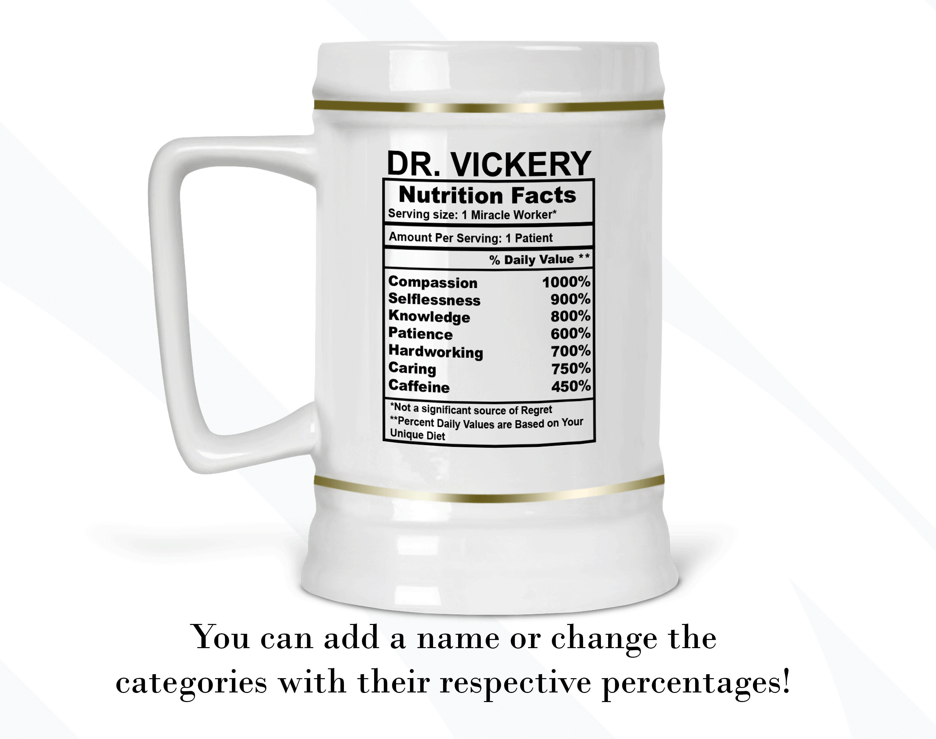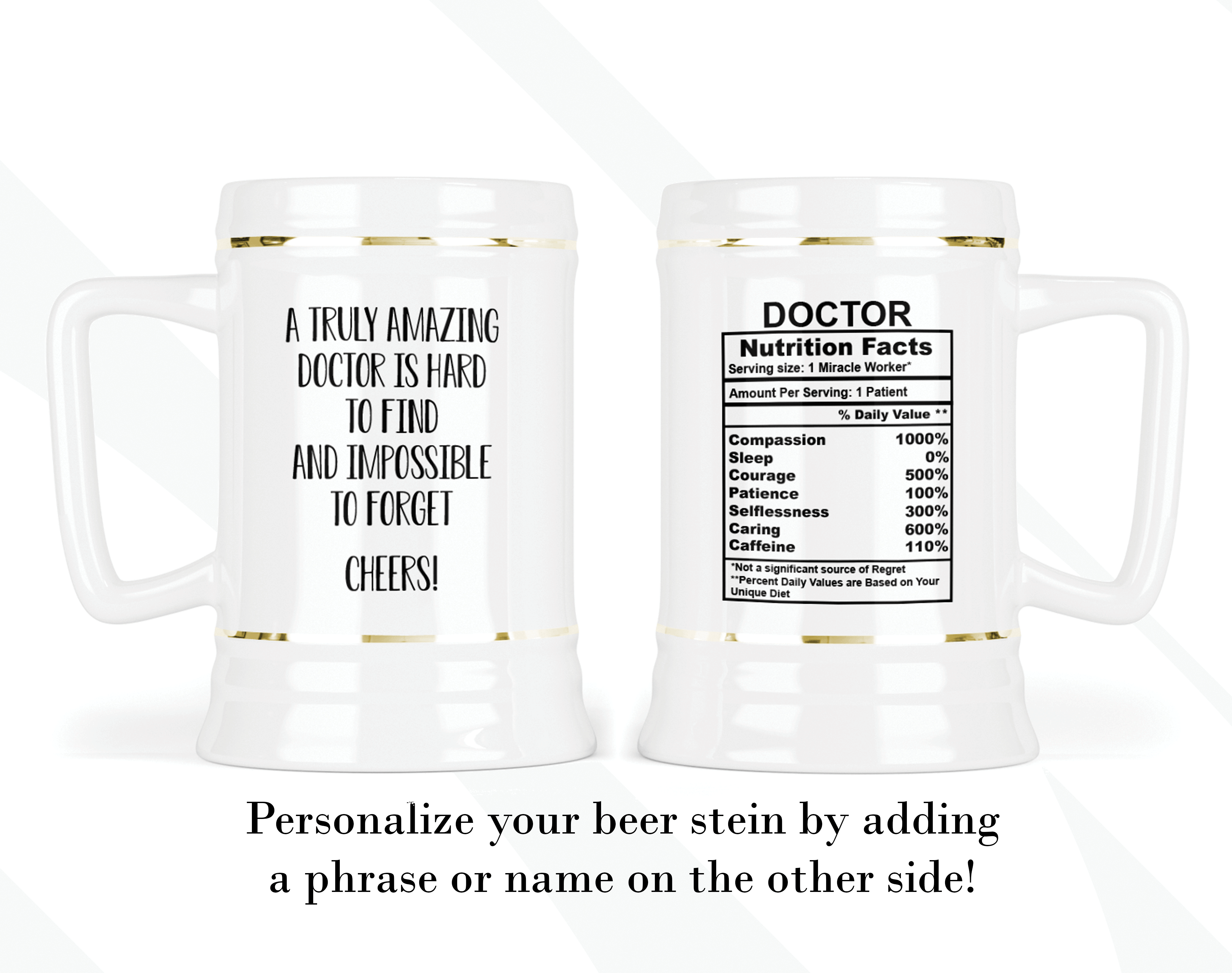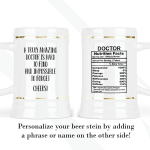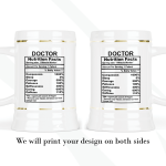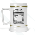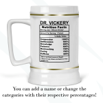 By default, we will print the main design on both sides of your doctor’s gift beer stein. As in the pictures, you can put a name or phrase on the beer stein’s back. If you add text to the beer stein’s back, please let us know your preferred font number (the options are on the pictures). As in the pictures, you can add a name or change the categories and percentages. Please help us by providing as much information as possible in the personalized text box; we will take care of the rest! It’s your customized beer stein, so you can design your doctor’s facts gift as you wish!