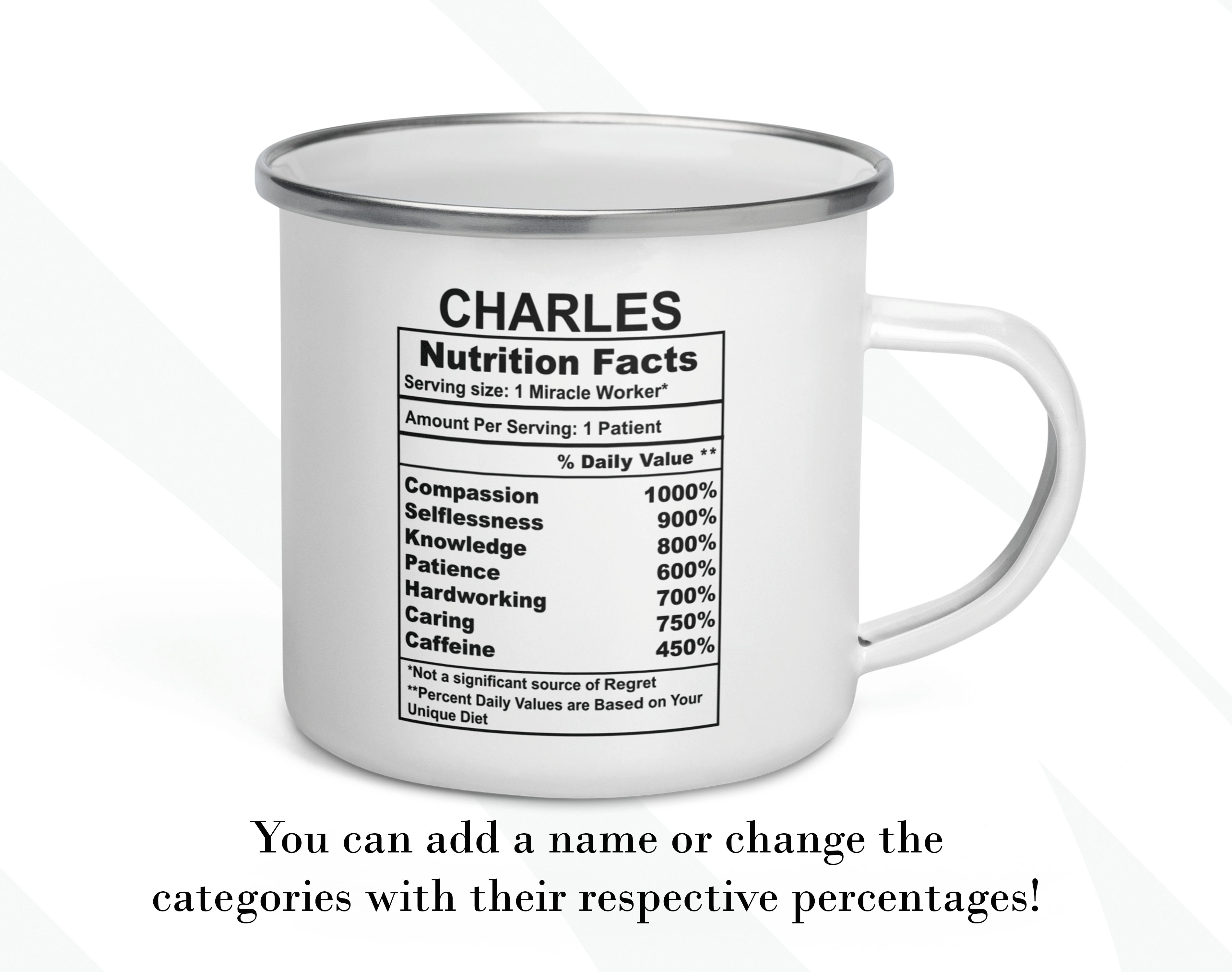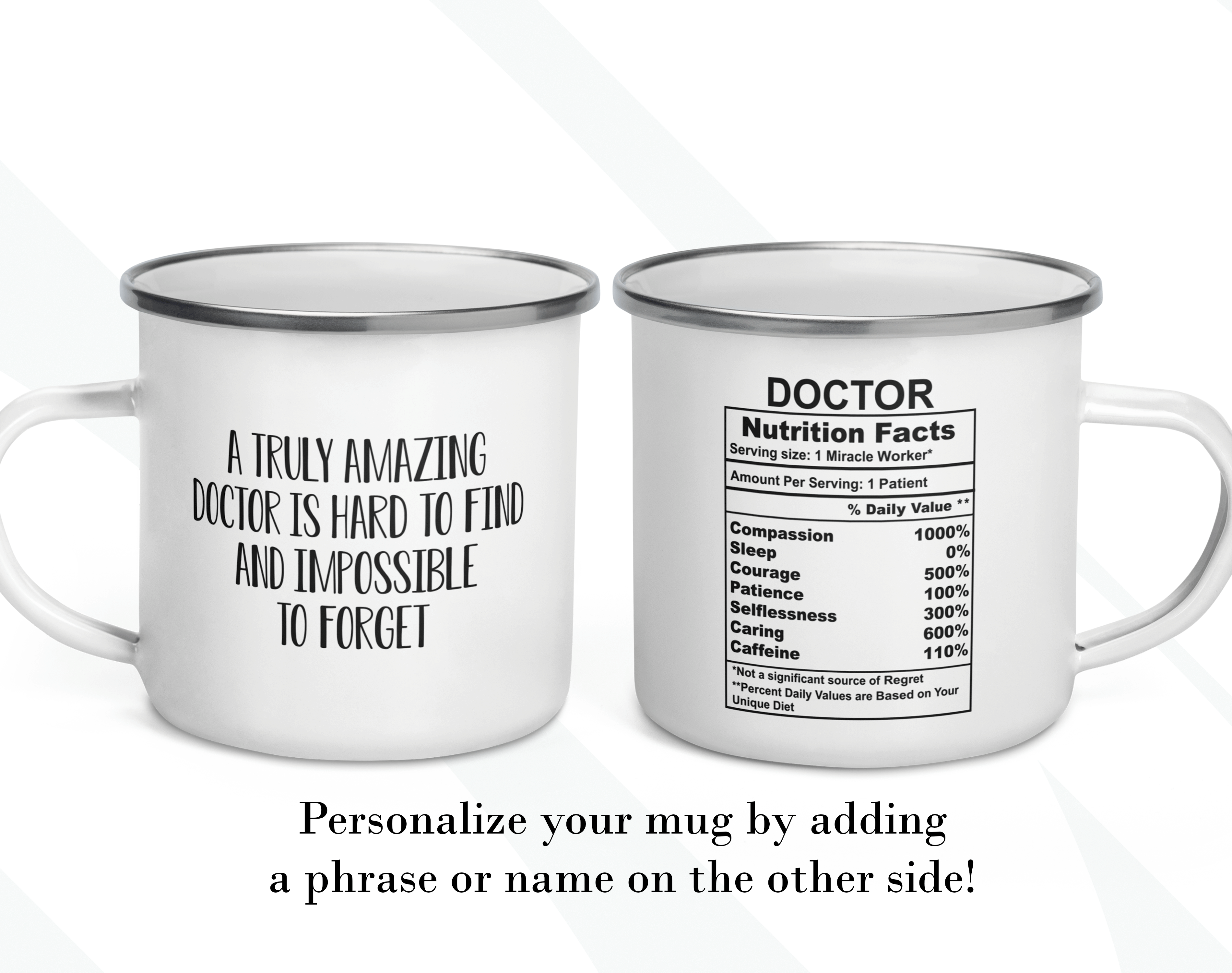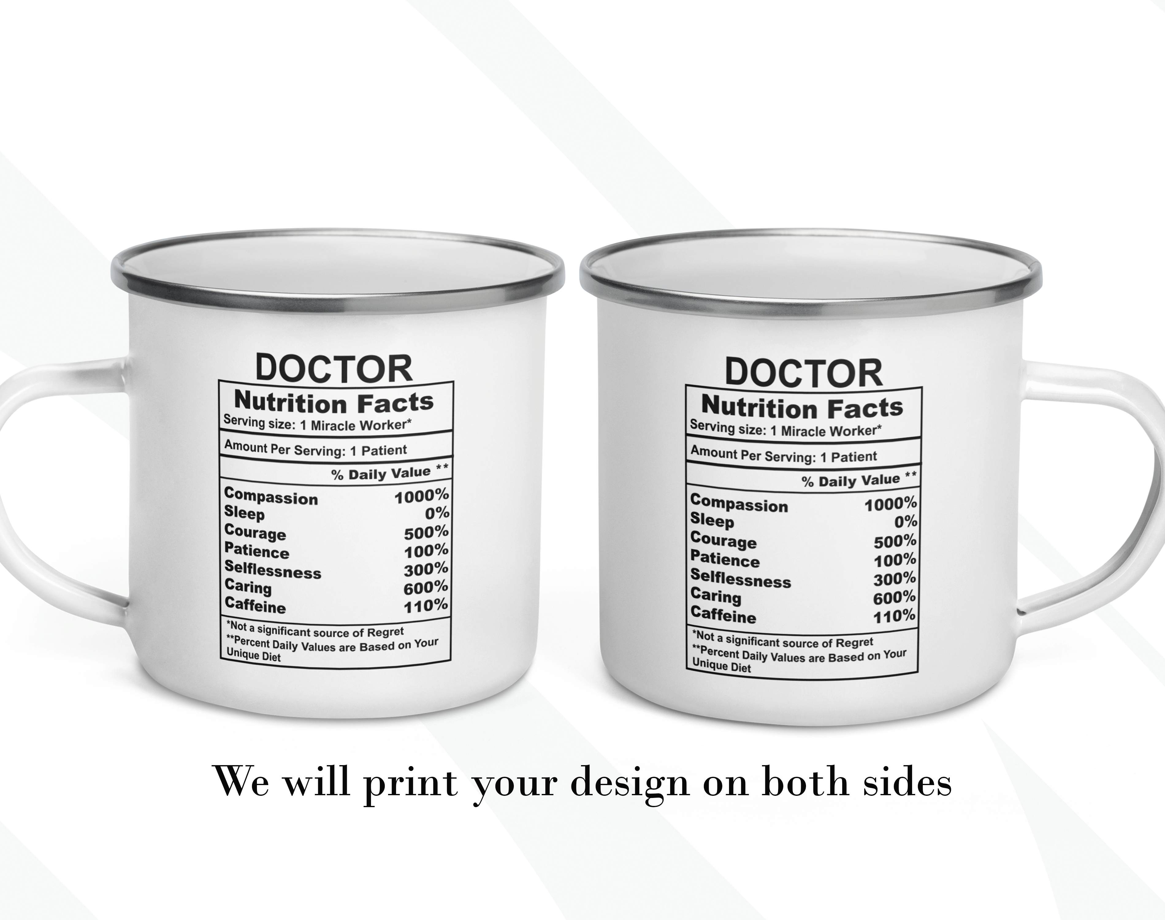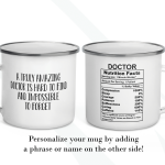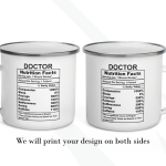 By default, we will print the main design on both sides of your customized gift for doctor mug. However, the real magic happens when you add your personal touch. You can put a name or phrase on the mug’s back, as in the pictures. If you add text to the mug’s back, please let us know your preferred font number (the options are on the pictures). As in the pictures, you can add a name or change the categories and percentages. Please help us by providing as much information as possible in the personalized text box; we will take care of the rest! It’s your customized mug, so you can design your gift for a doctor mug gift as you wish!