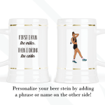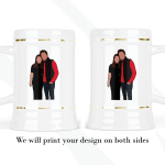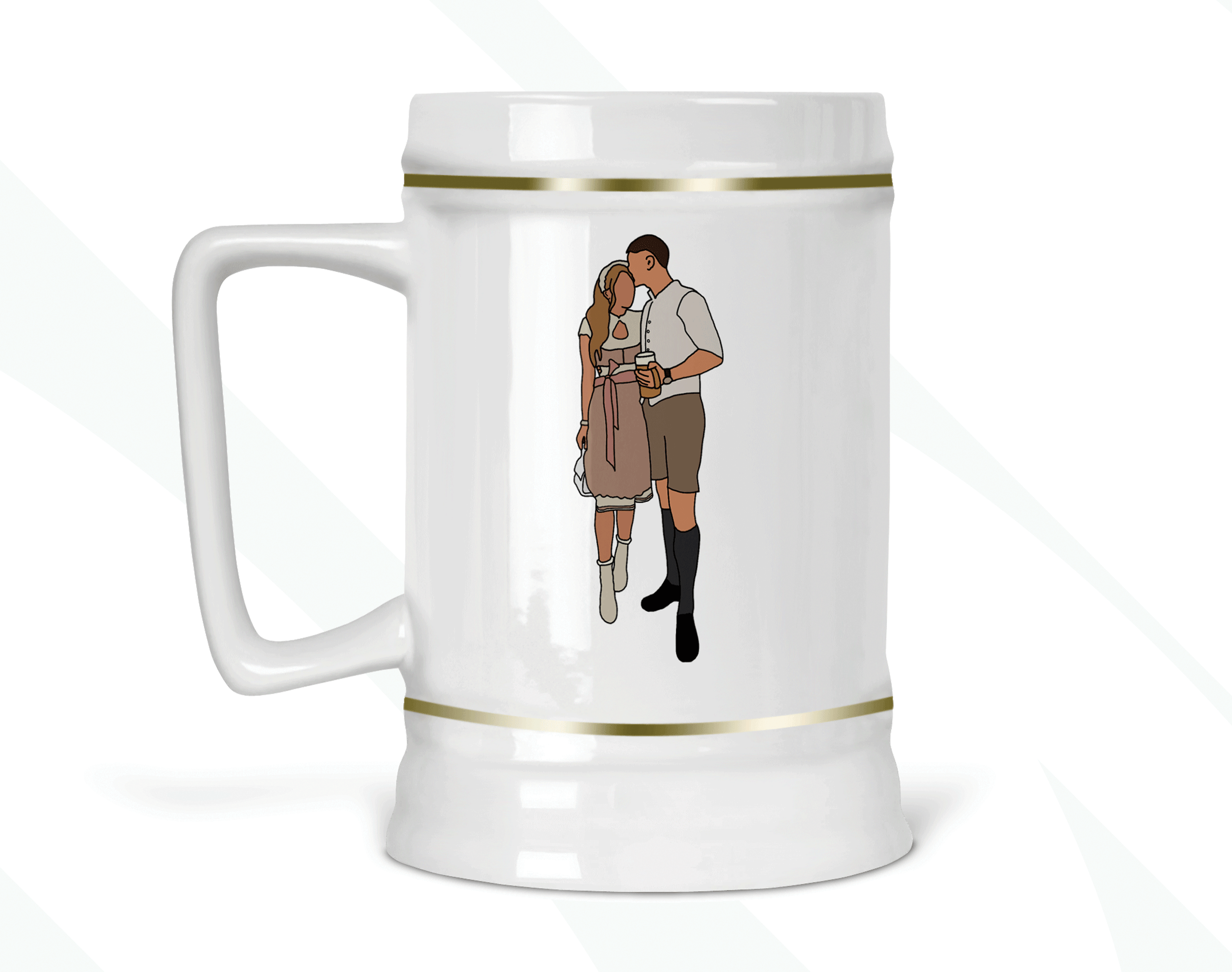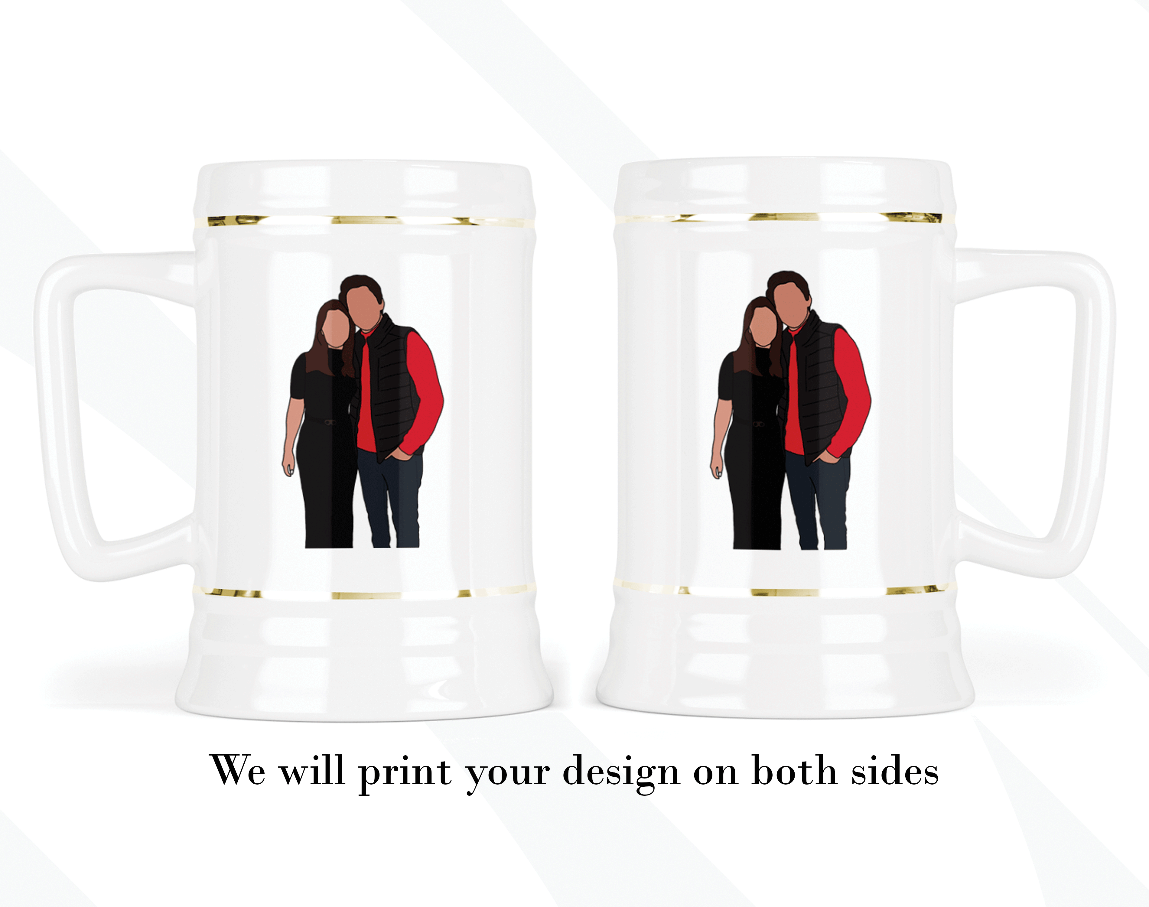 By default, we will print the portrait illustration on both sides. As in the pictures, you can put a name or phrase on the beer stein’s back. Please help us by providing as much information as possible in the personalized text box; we will take care of the rest. If you add text, please let us know your preferred font number (the options are on the pictures). It’s your personalized beer stein, so you can design your portrait illustration beer stein as you wish!