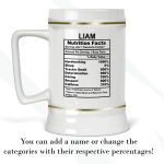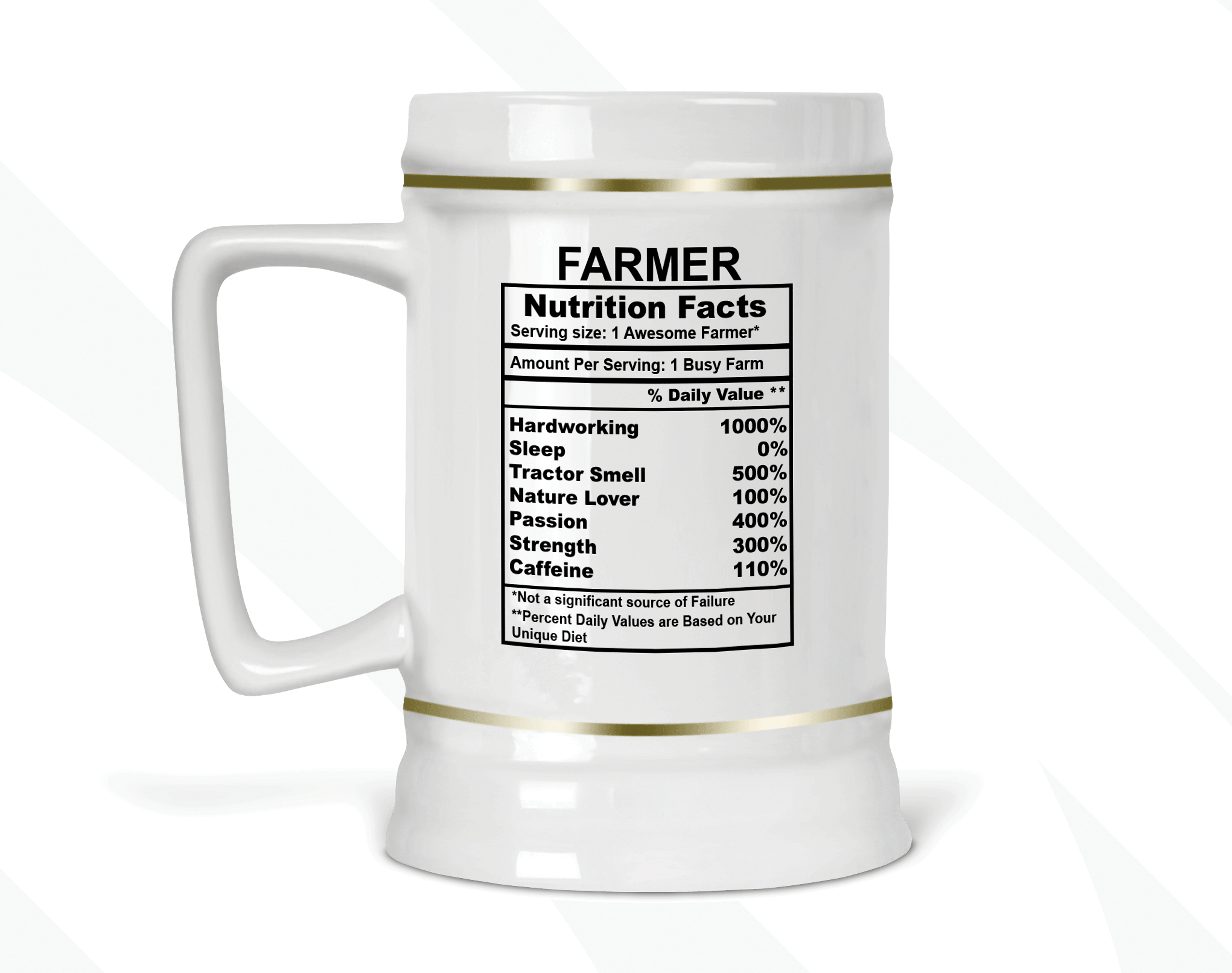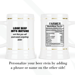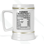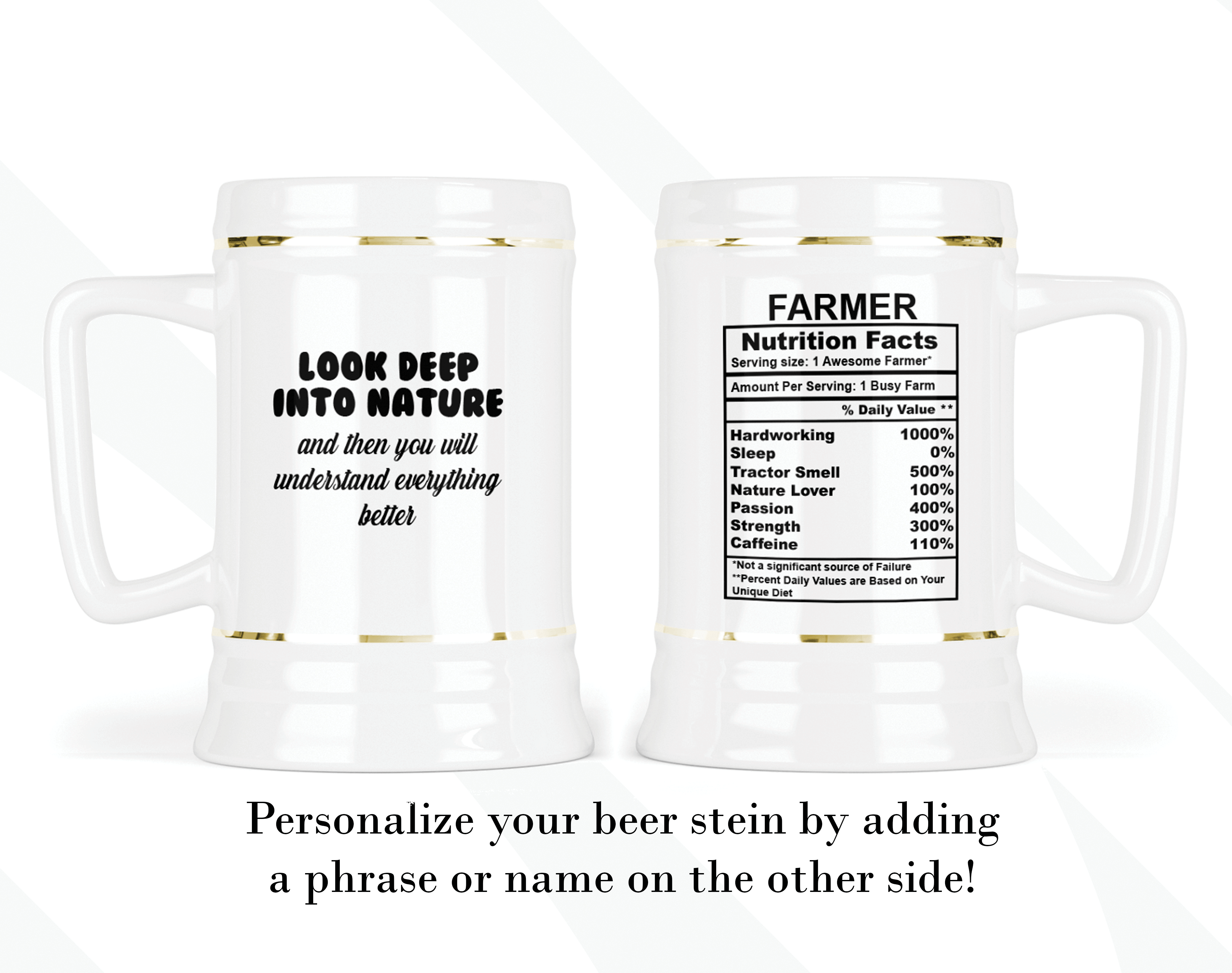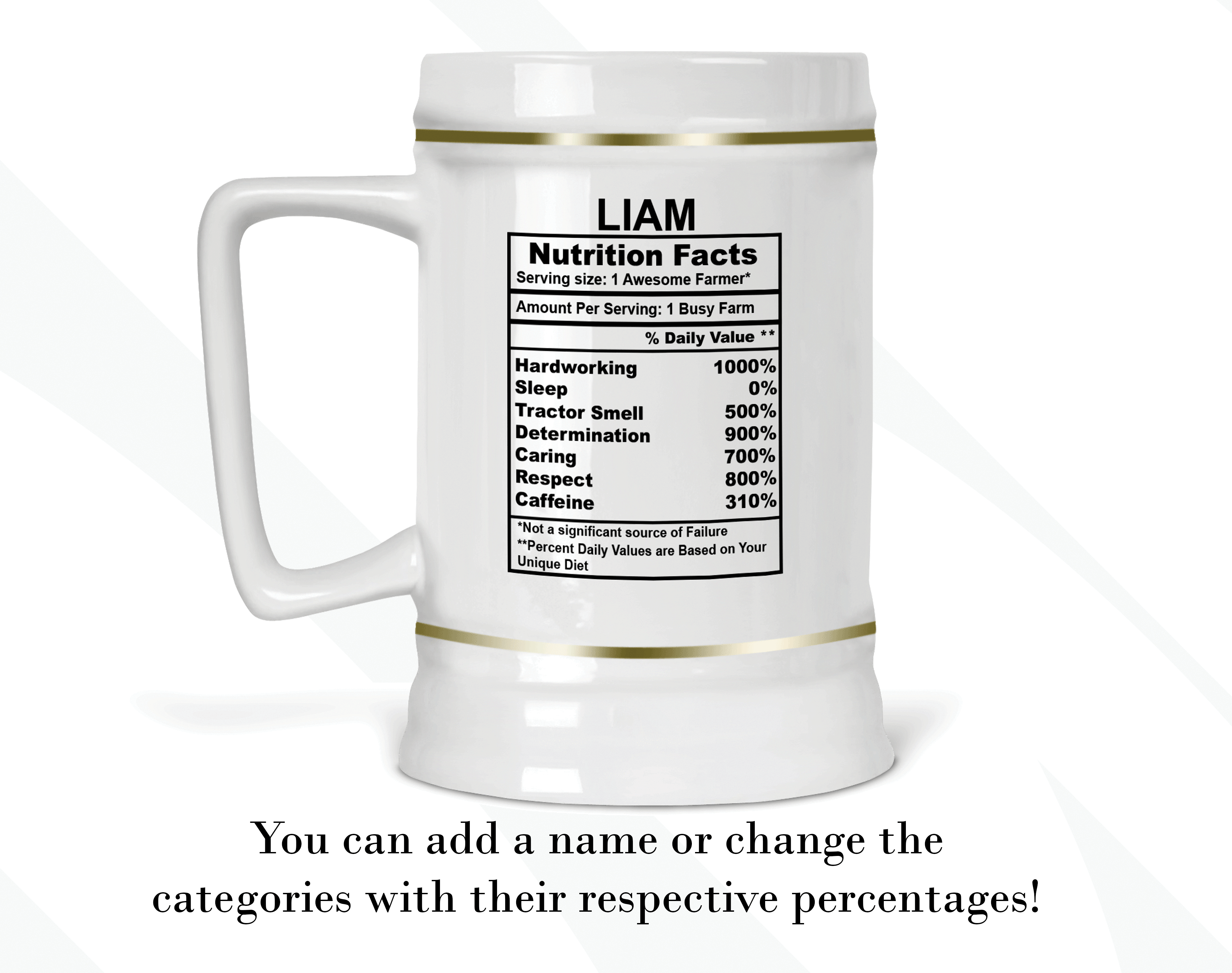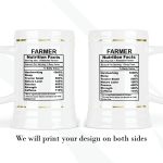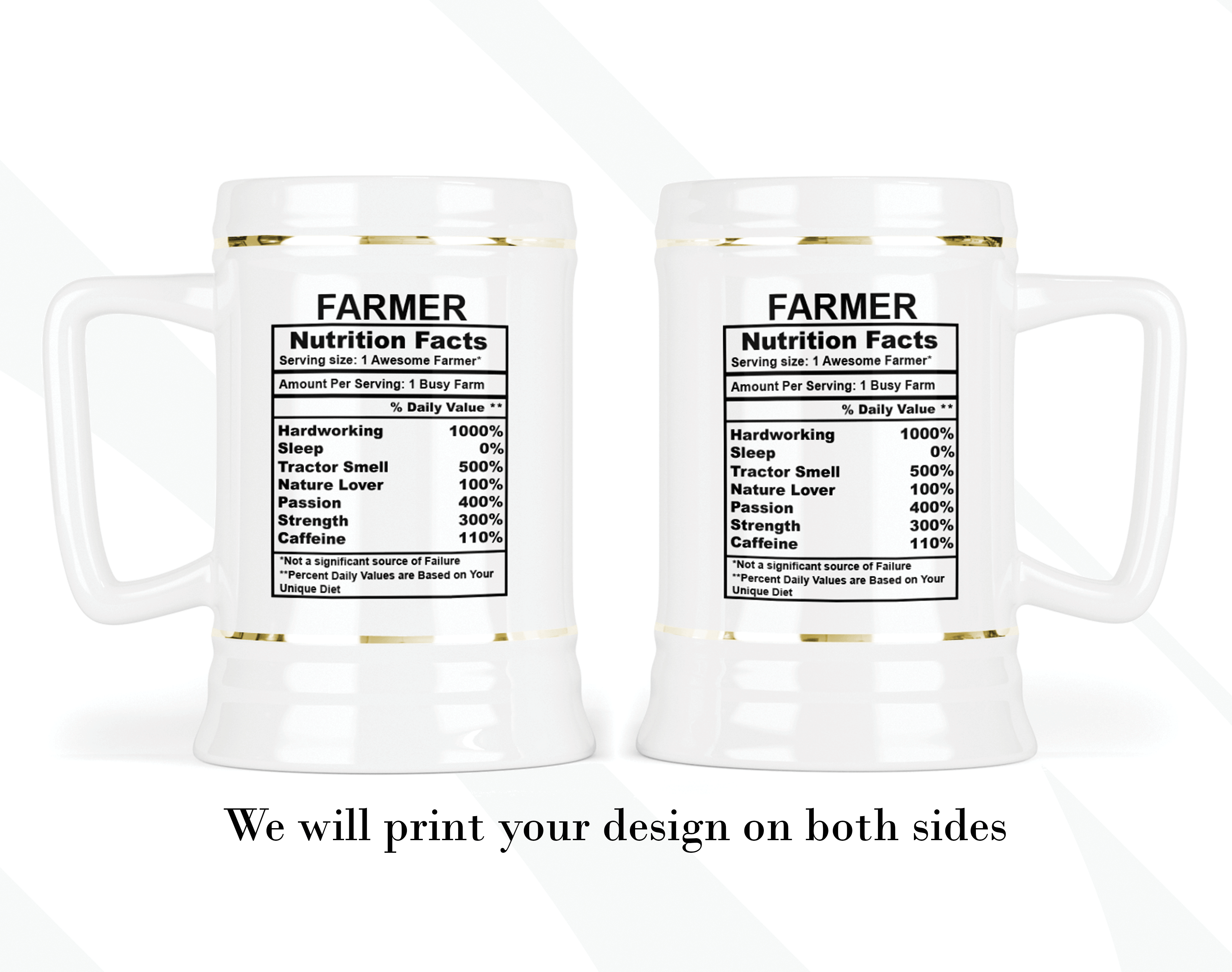By default, we will print the main design on both sides of your farmer gift beer stein. As in the pictures, you can put a name or phrase on the beer stein’s back. If you add text to the beer stein’s back, please let us know your preferred font number (the options are on the pictures). As in the pictures, you can add a name or change the categories and percentages. Please help us by providing as much information as possible in the personalized text box; we will take care of the rest! It’s your customized beer stein, so you can design your farmer’s facts gift as you wish!