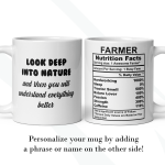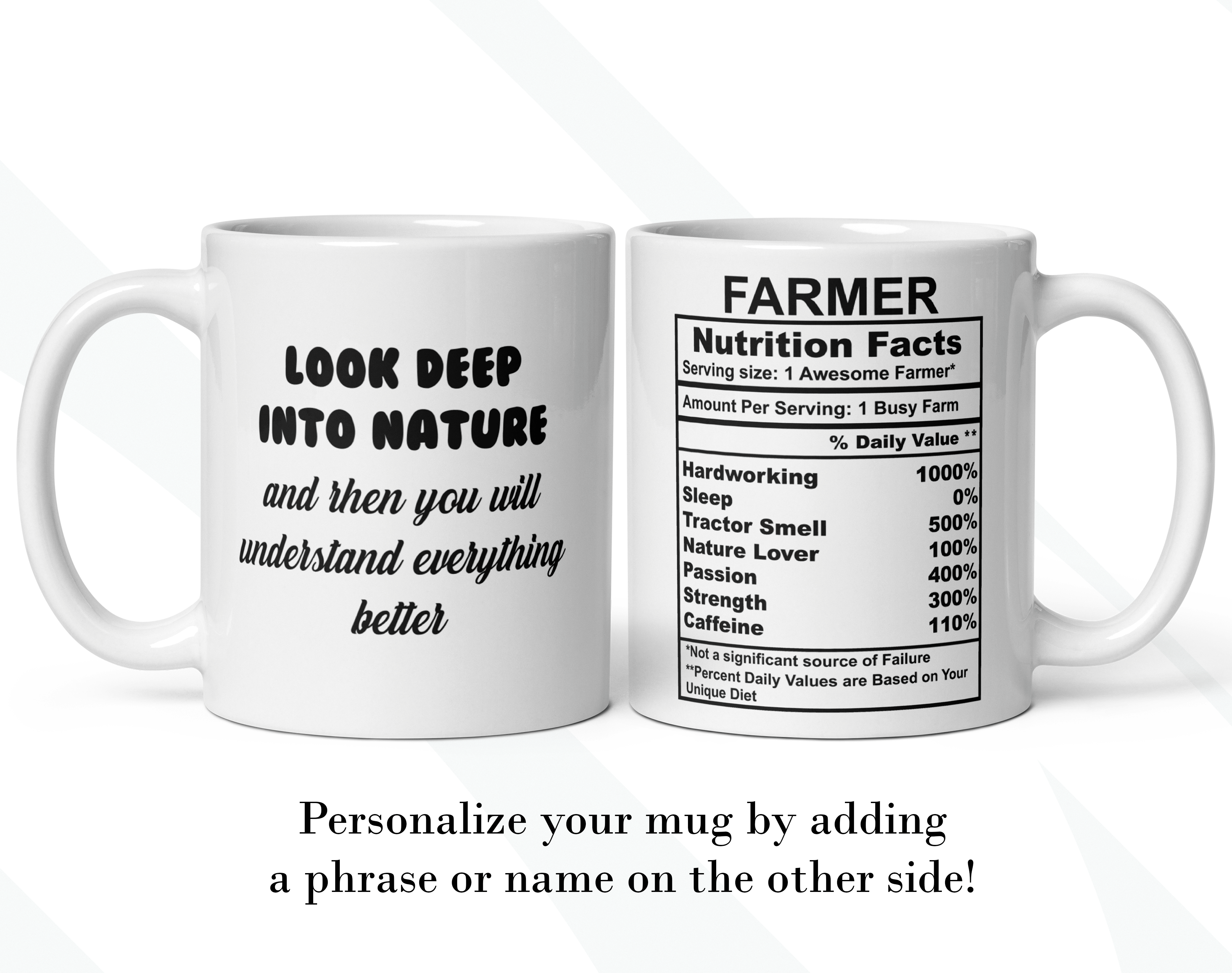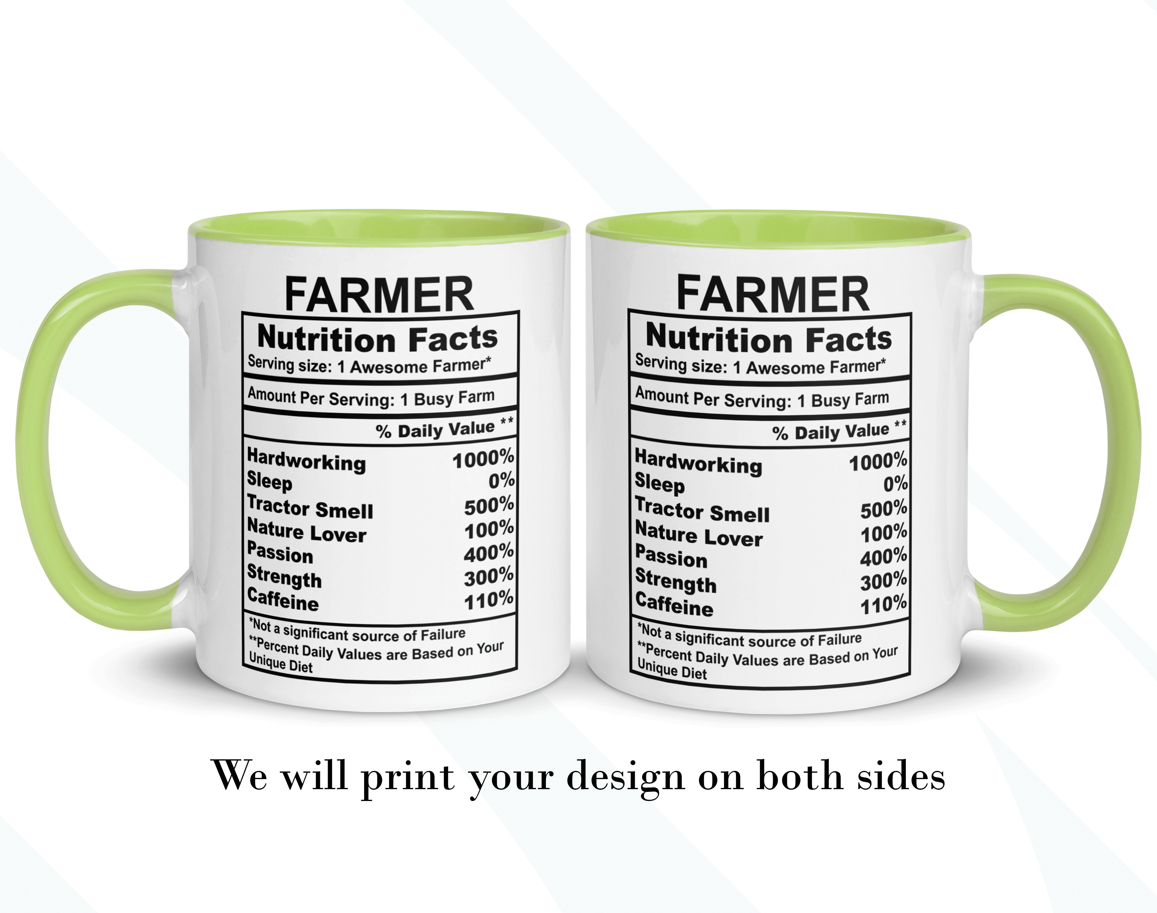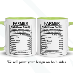 By default, we will print the main design on both sides of your farmer’s mug. As in the pictures, you can put a name or phrase on the mug’s back. If you add text to the mug’s back, please let us know your preferred font number (the options are on the pictures). As in the pictures, you can add a name or change the categories and percentages. Please help us by providing as much information as possible in the personalized text box; we will take care of the rest! It’s your customized mug, so you can design your gift for a farmer boy or girl as you wish!