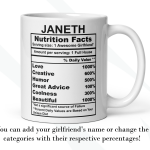 This Girlfriend Nutrition Facts mug is an excellent custom gift for your girlfriend! It will put a big smile on her every time she serves in her tea or coffee mug. This personalized mug could be a perfect anniversary or Valentine’s gift!