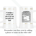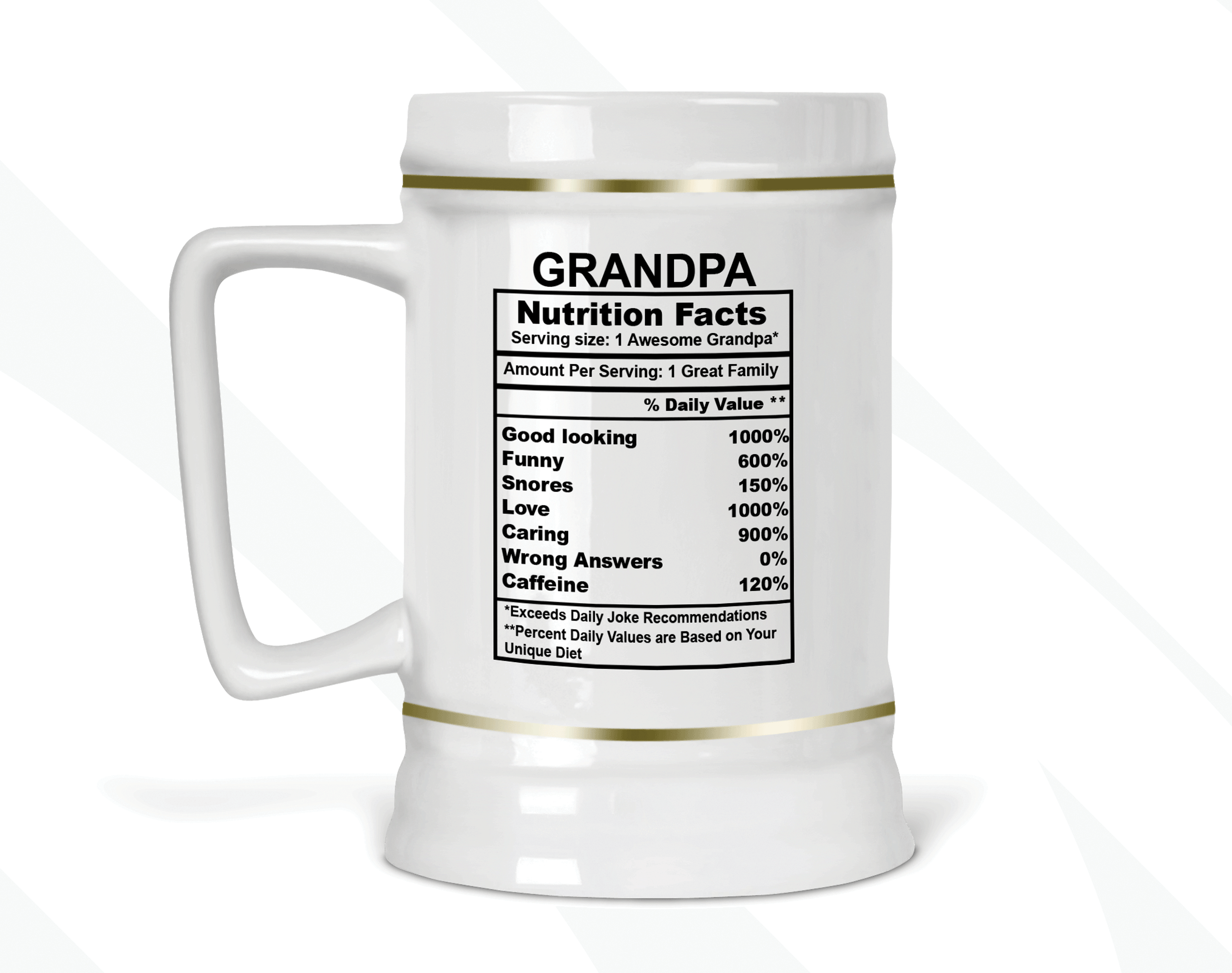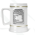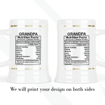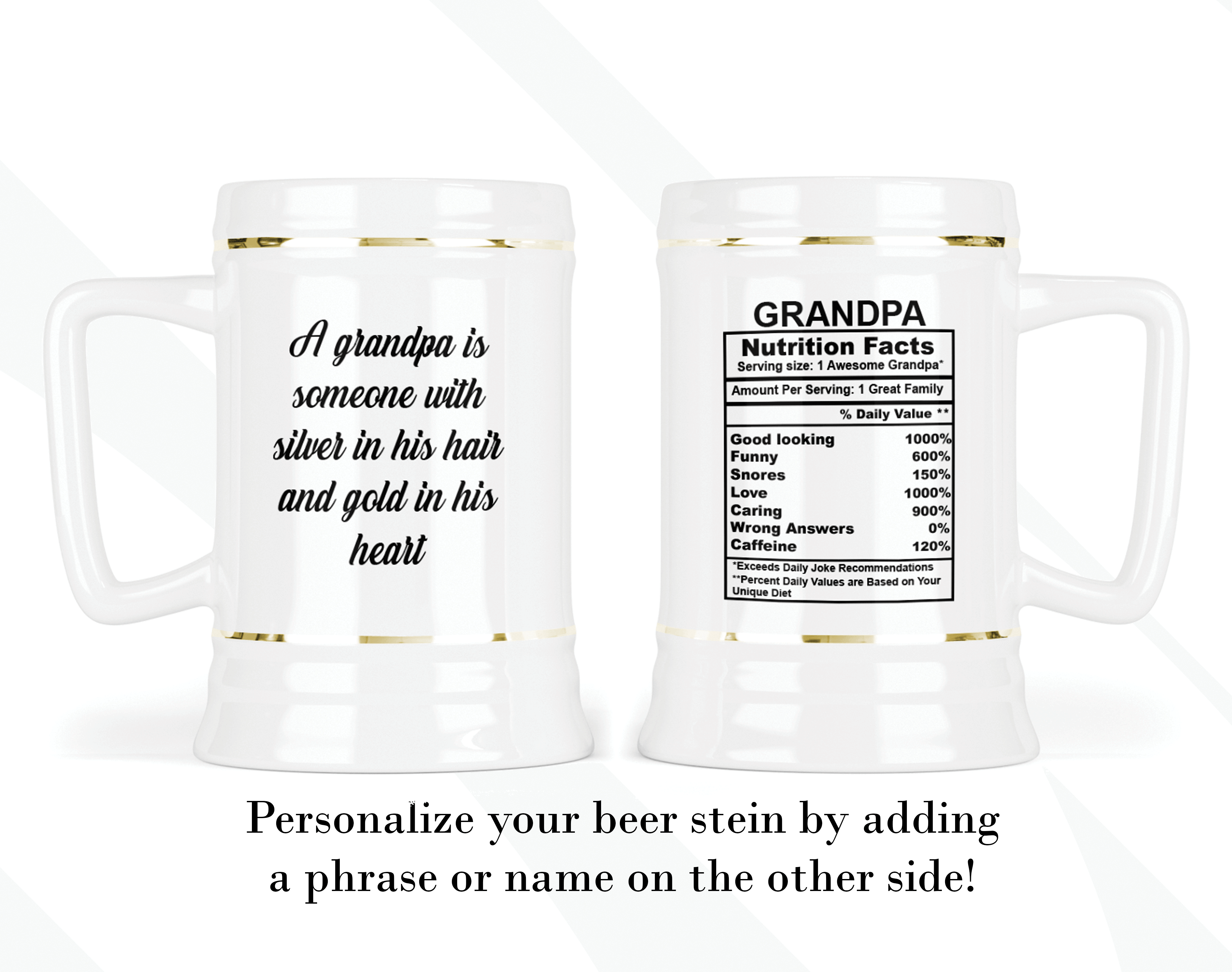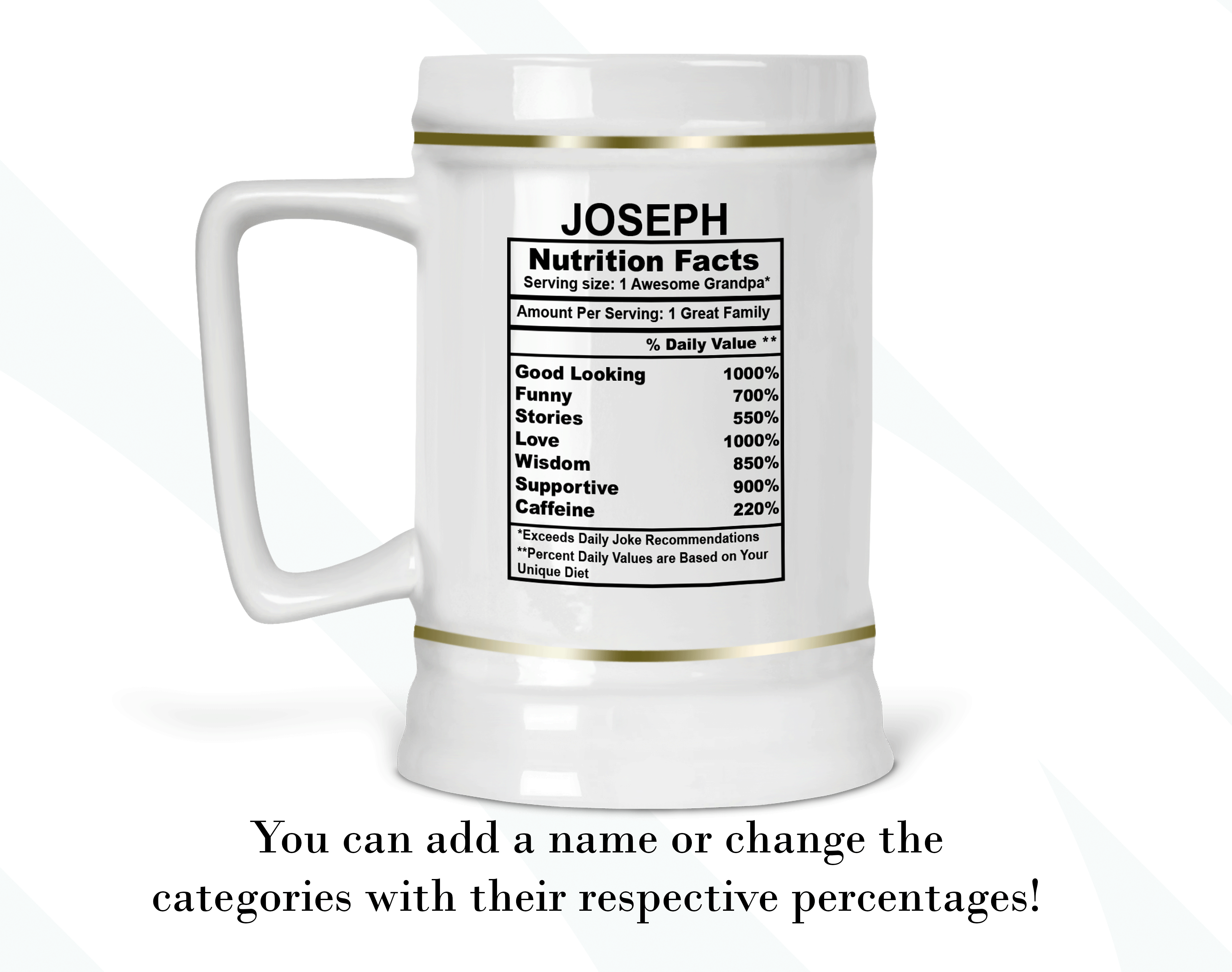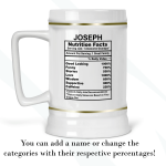 By default, we will print the main design on both sides of your grandpa’s beer stein. As in the pictures, you can put a name or phrase on the beer stein’s back. If you add text to the beer stein’s back, please let us know your preferred font number (the options are on the pictures). As in the pictures, you can add a name or change the categories and percentages. Please help us by providing as much information as possible in the personalized text box; we will take care of the rest! It’s your customized beer stein, so you can design your gift for your grandfather as you wish!