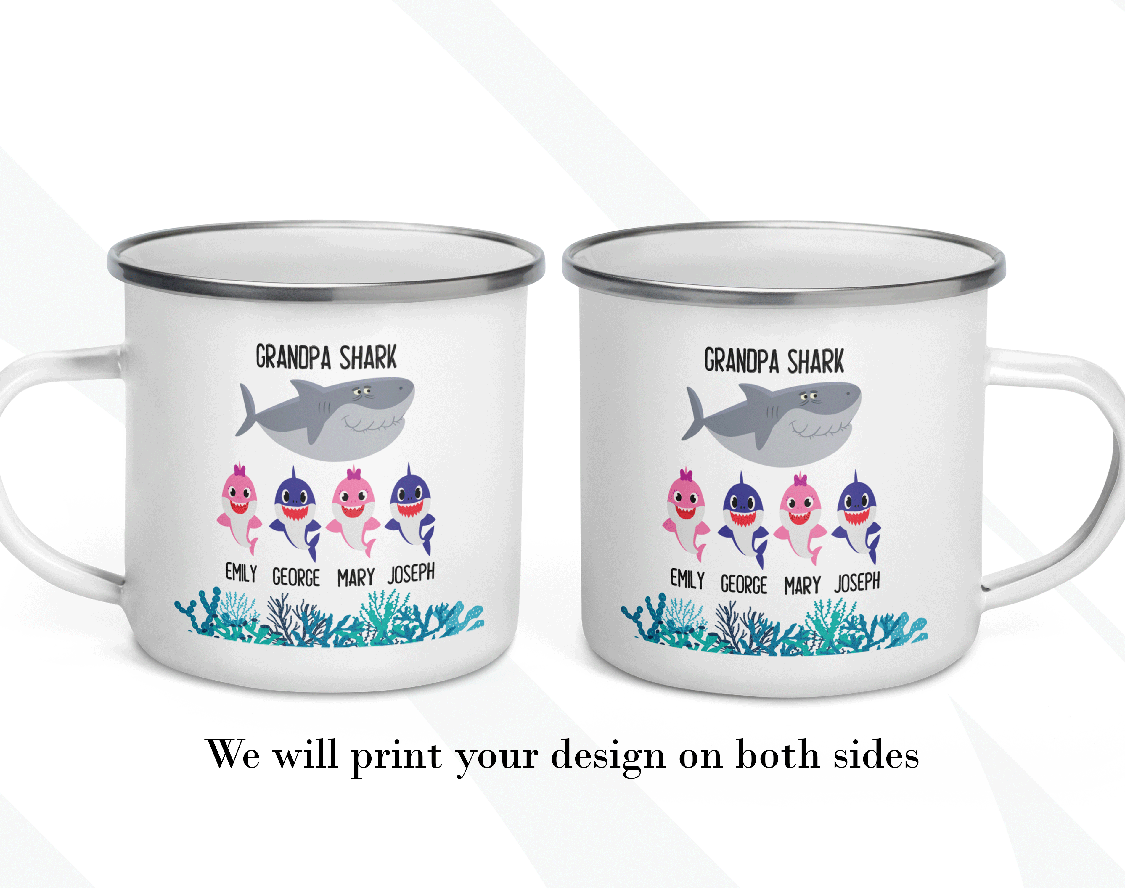 The baby shark gift is a customized mug with a baby shark and the name given to each grandson(s) and granddaughter(s). By default, we will print your custom mug on both sides. You can put a name or phrase on the mug’s back, as in the pictures. Please help us by providing each child’s name and shark color in the personalized text box; we will take care of the rest. If you add text, please let us know your preferred font number (the options are on the pictures). This grandpa shark mug is your perfect gift for grandpa, so you get to design it as you wish!