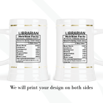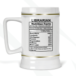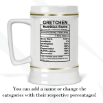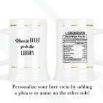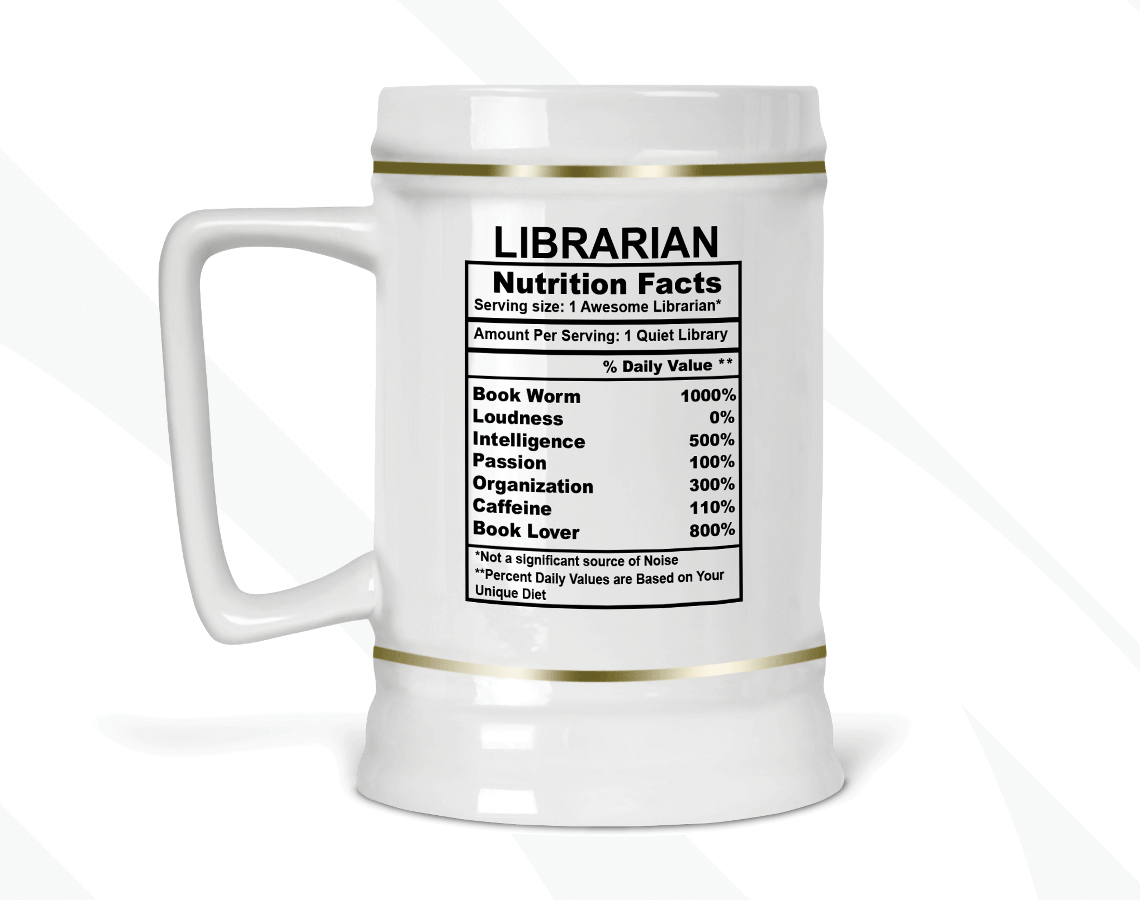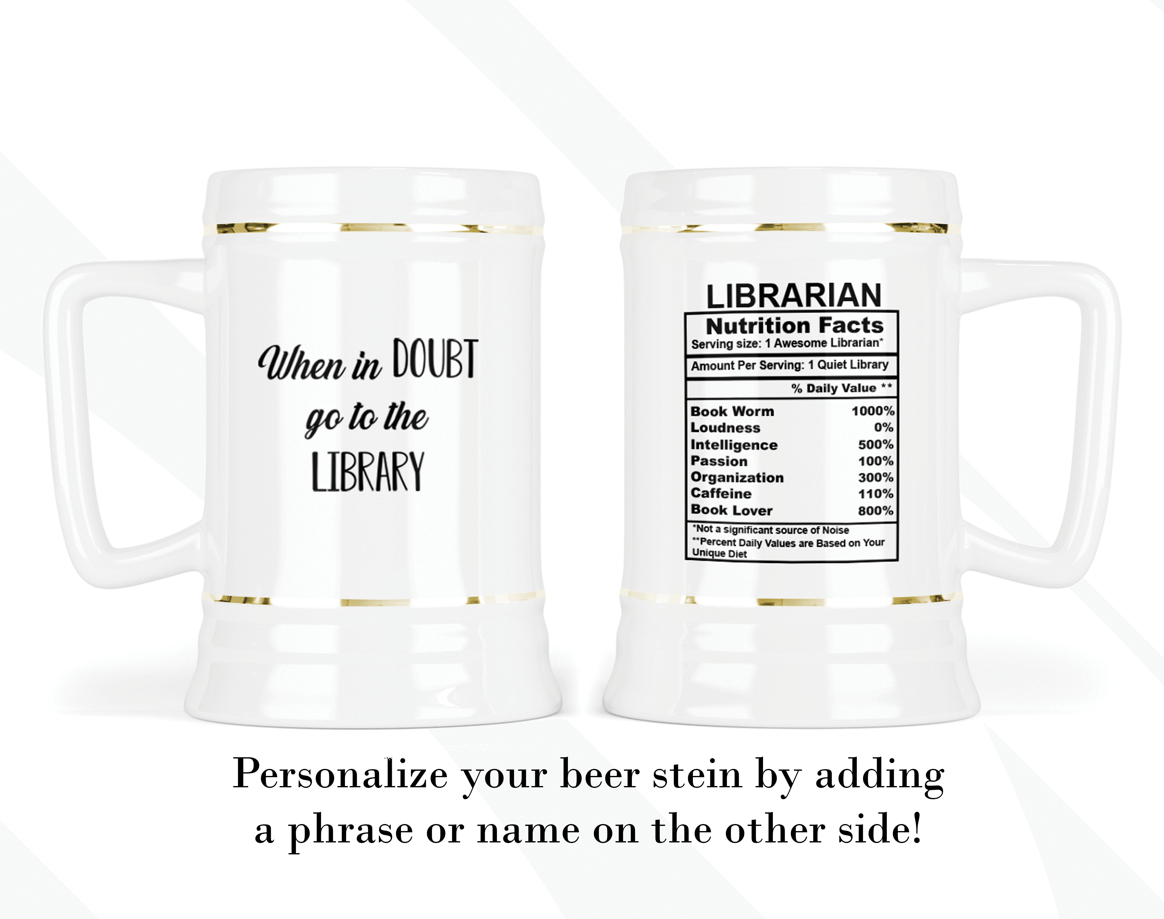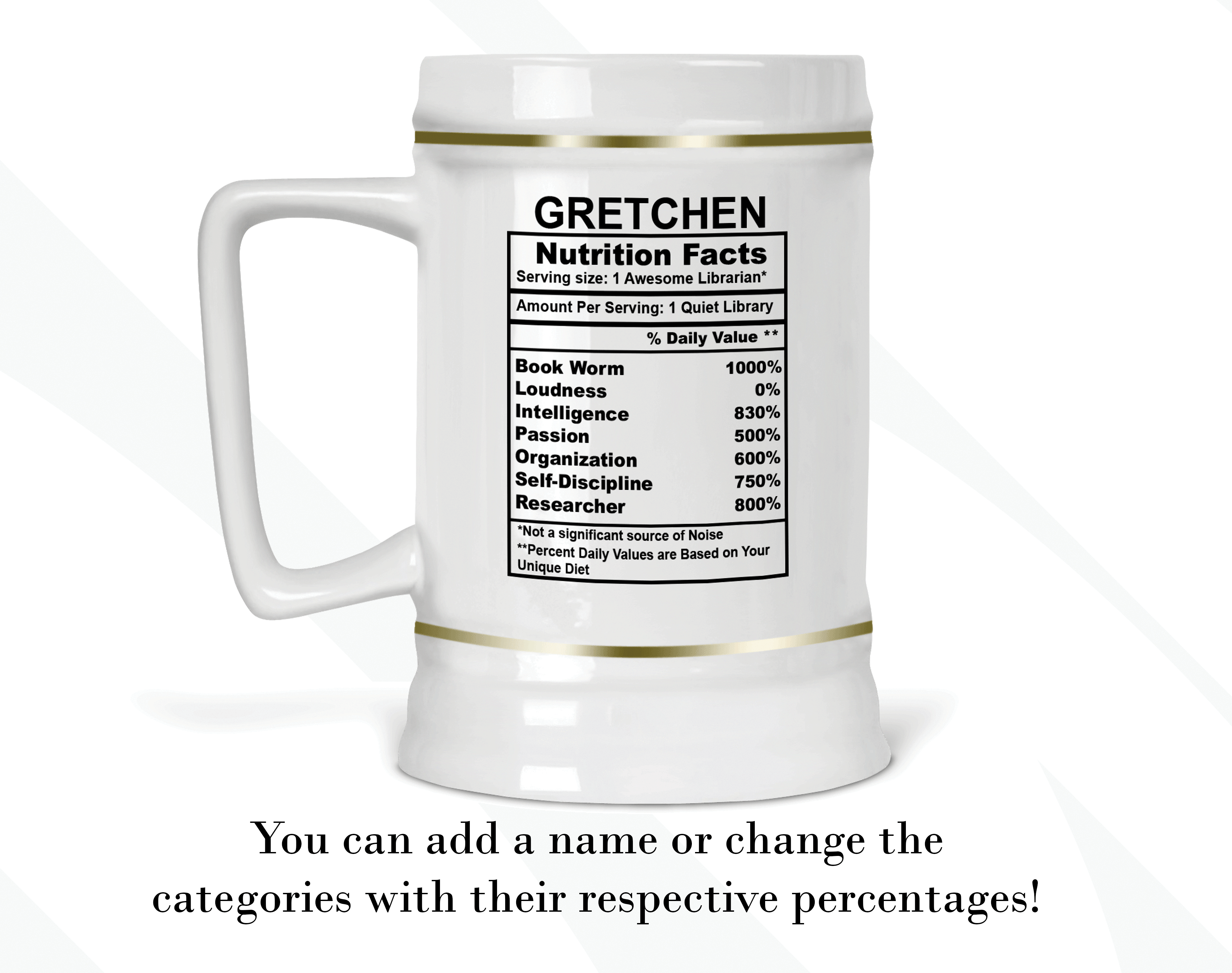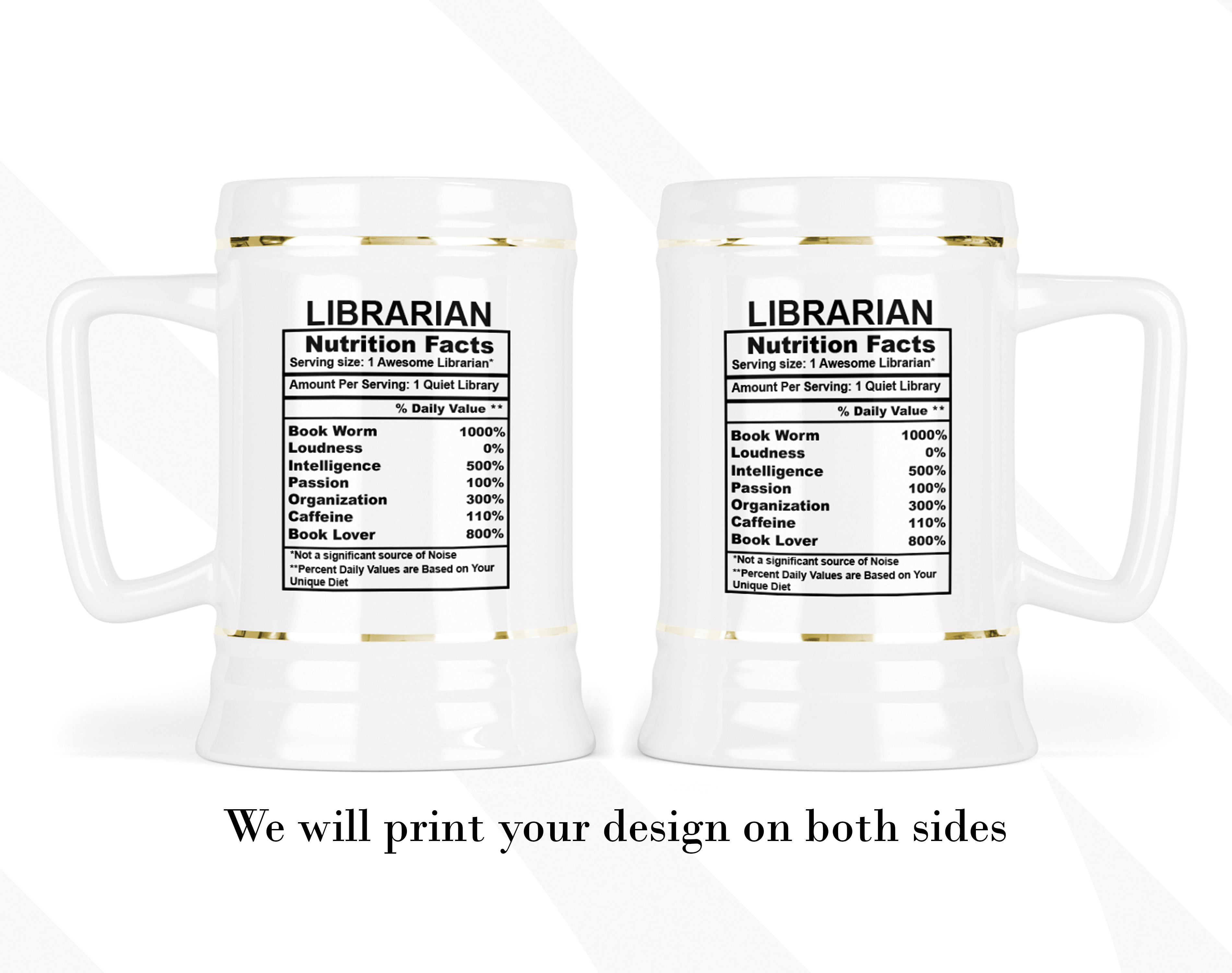 By default, we will print the main design on both sides of your librarian’s beer stein. As in the pictures, you can put a name or phrase on the beer stein’s back. If you add text to the beer stein’s back, please let us know your preferred font number (the options are on the pictures). As in the pictures, you can add a name or change the categories and percentages. Please help us by providing as much information as possible in the personalized text box; we will take care of the rest! It’s your customized beer stein, so you can design your librarian’s gift as you wish!