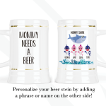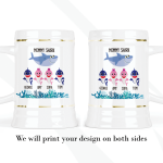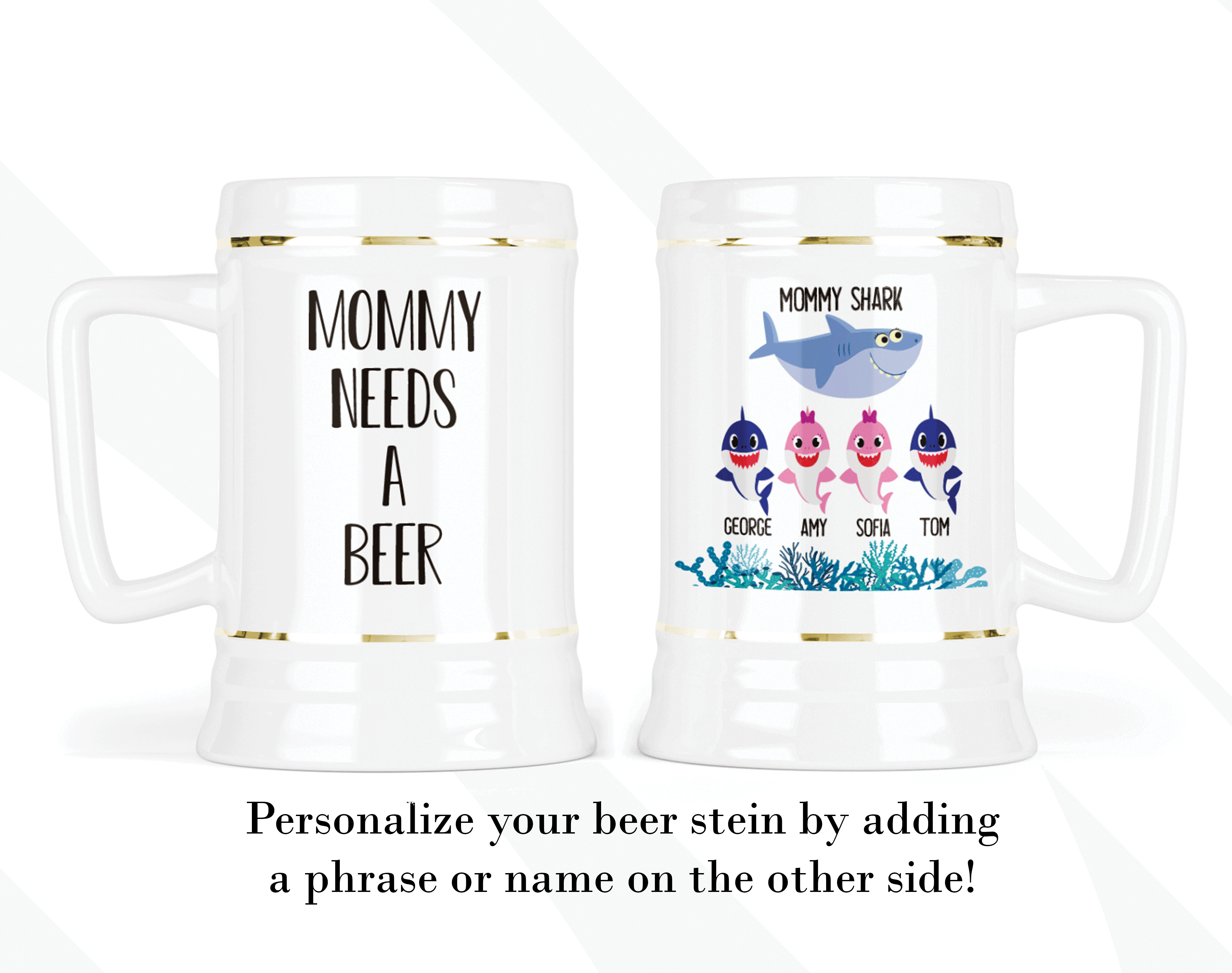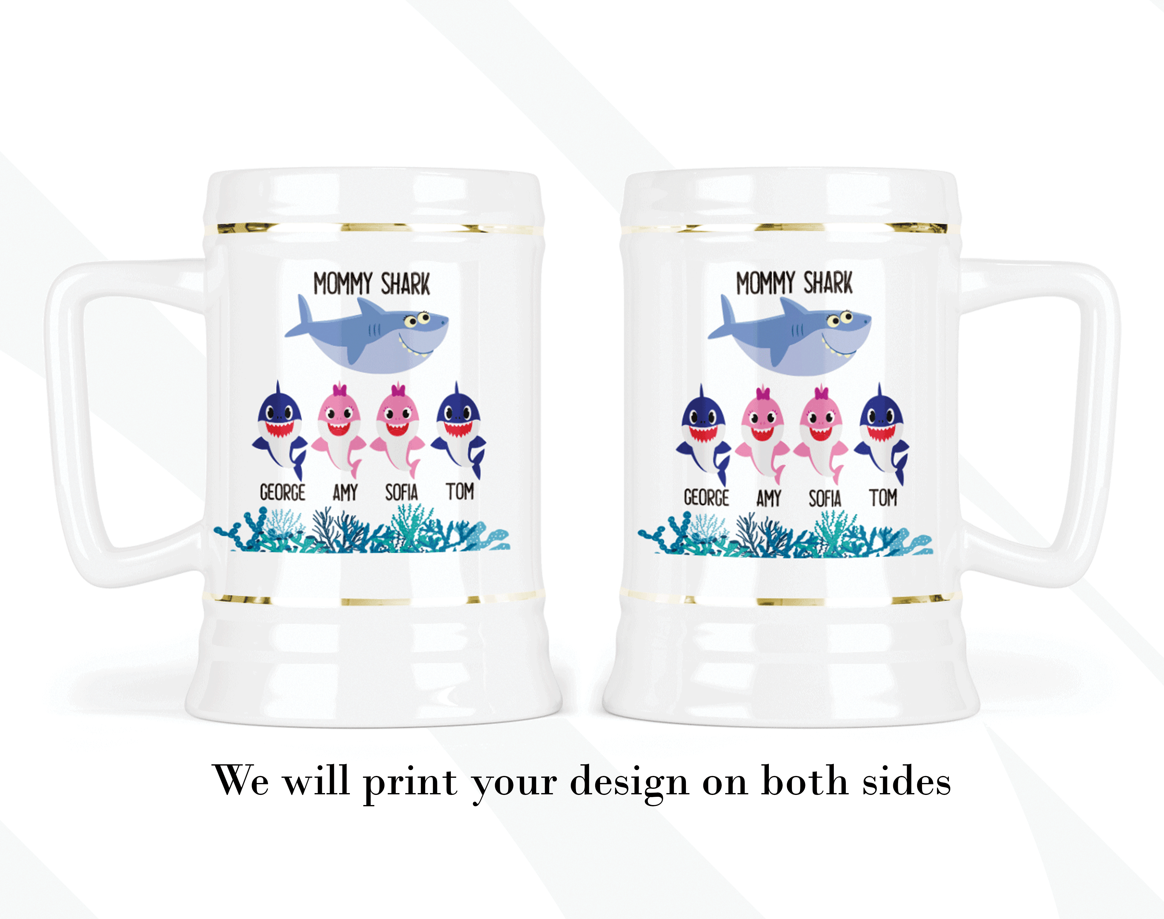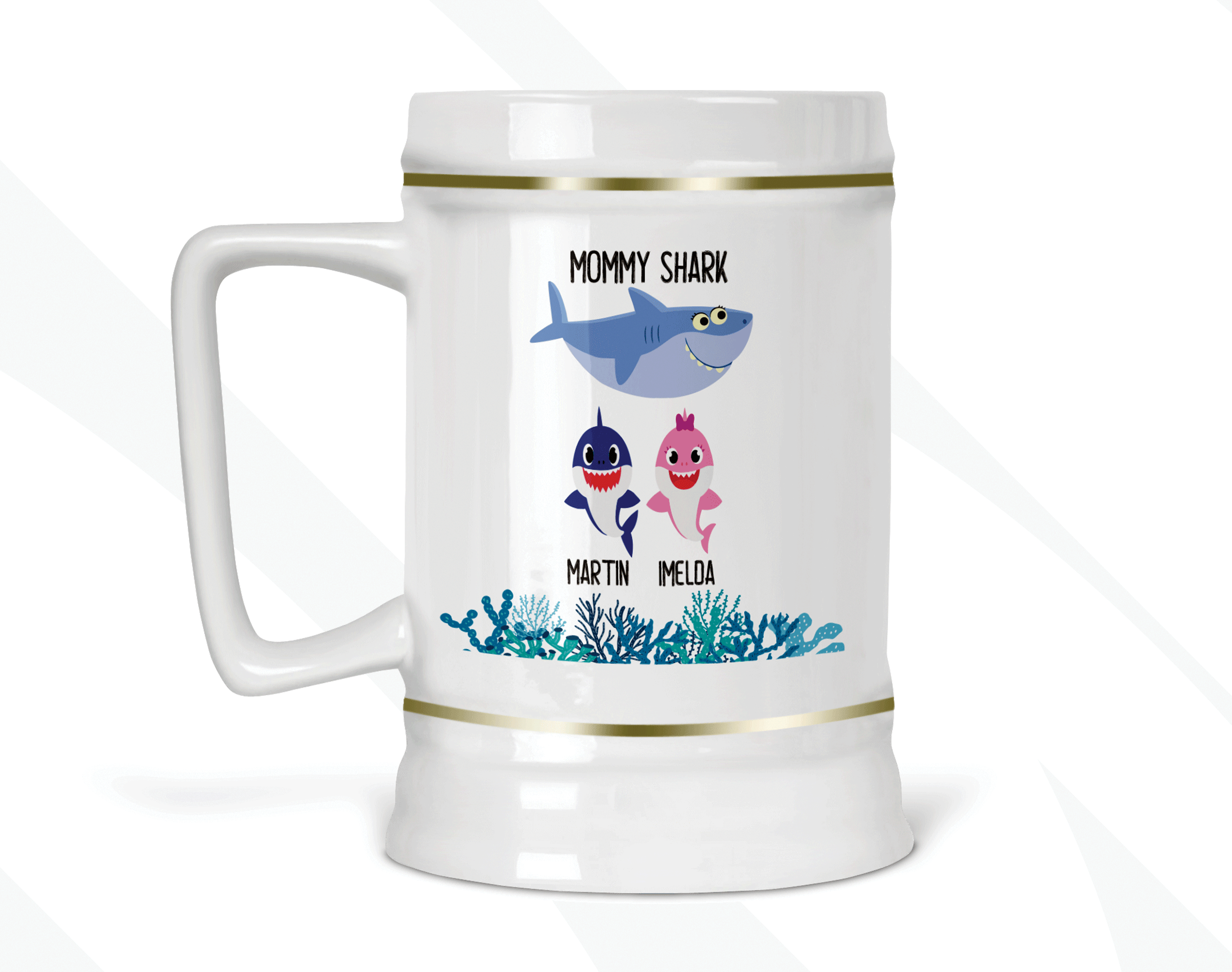 This Mommy Shark gift is a personalized beer stein with a baby shark and the name given to each child. Please provide us with the name and the color you want for each baby shark. We will print your customized beer stein design on both sides. As in the pictures, you can put a name or phrase on the beer stein’s back. If you add text to the beer stein’s back, please let us know your preferred font number (the options are on the pictures). Please help us by providing as much information as possible in the personalized text box; we will take care of the rest! This mommy shark stein is a unique gift, so you can design your gift for mom as you wish!