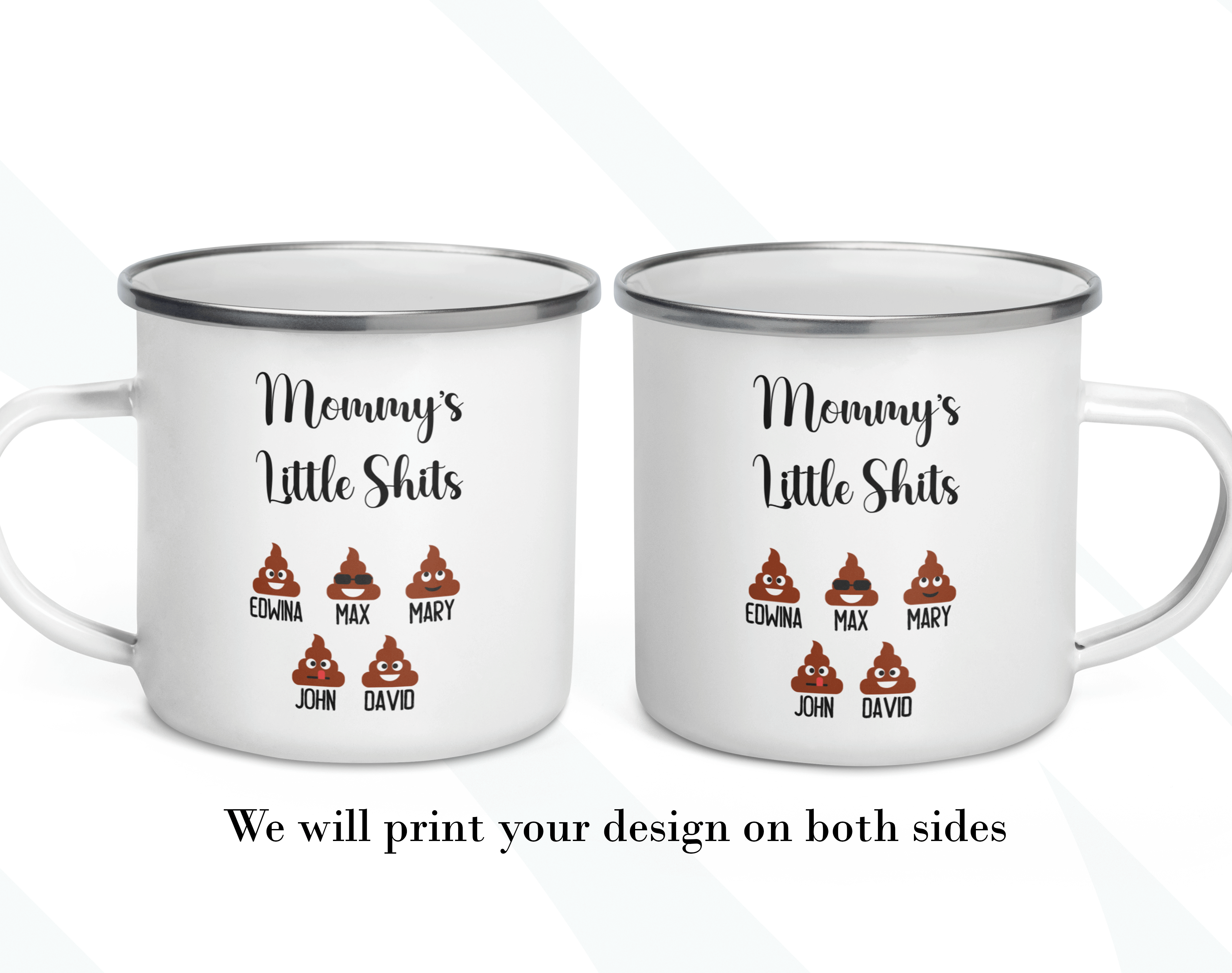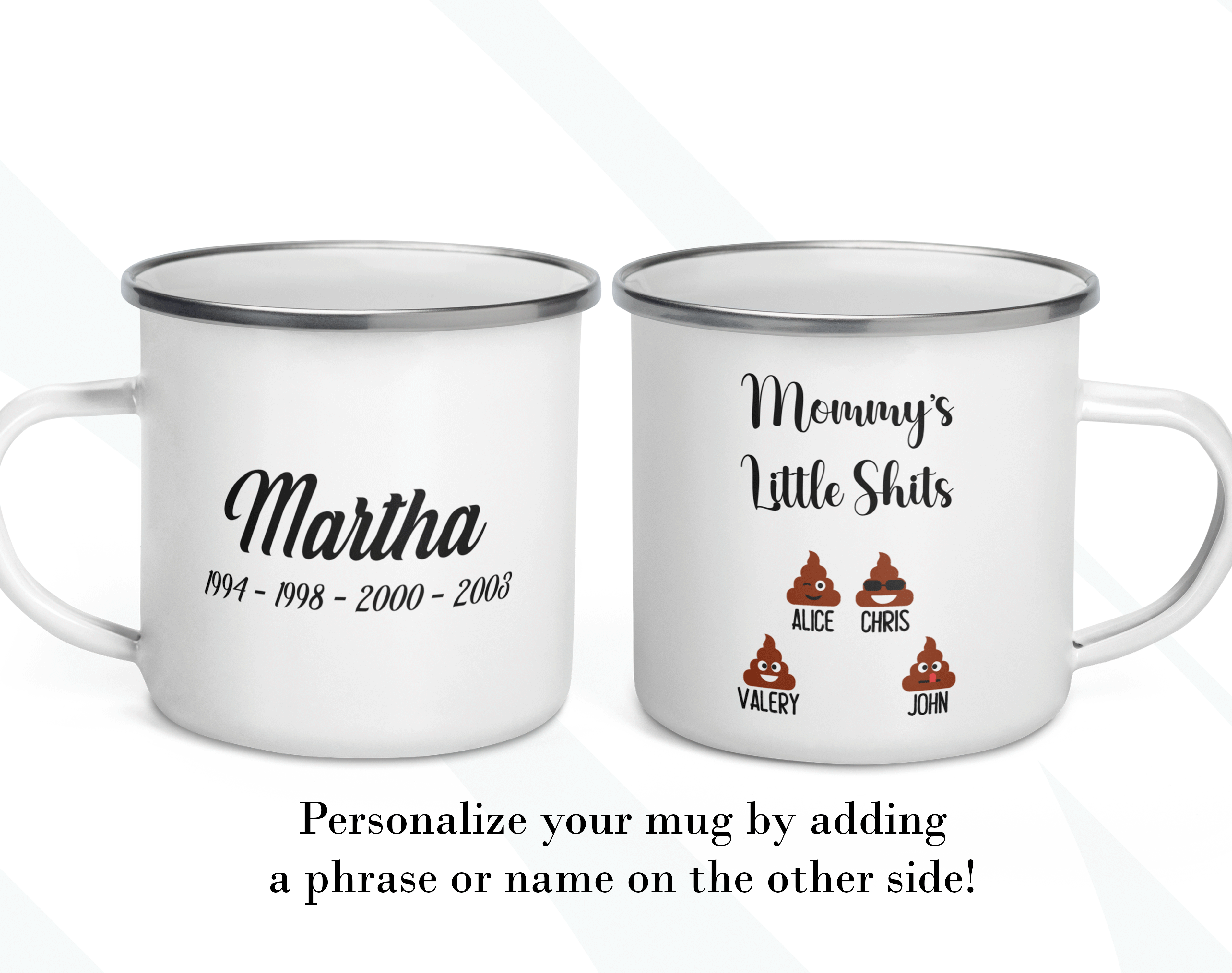 By default, we will print your personalized mug on both sides. You can add to your custom gift a name, phrase, or both, on the mug’s back, as in the pictures. If you want to do it that way, please provide us with as much information as possible in the personalized text box. Please, type the name(s) followed by the emoji option in the personalized text box. We will take care of the rest! It’s your customized mug, so you get to design your gift for mom as you wish!