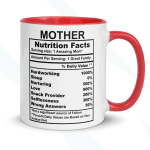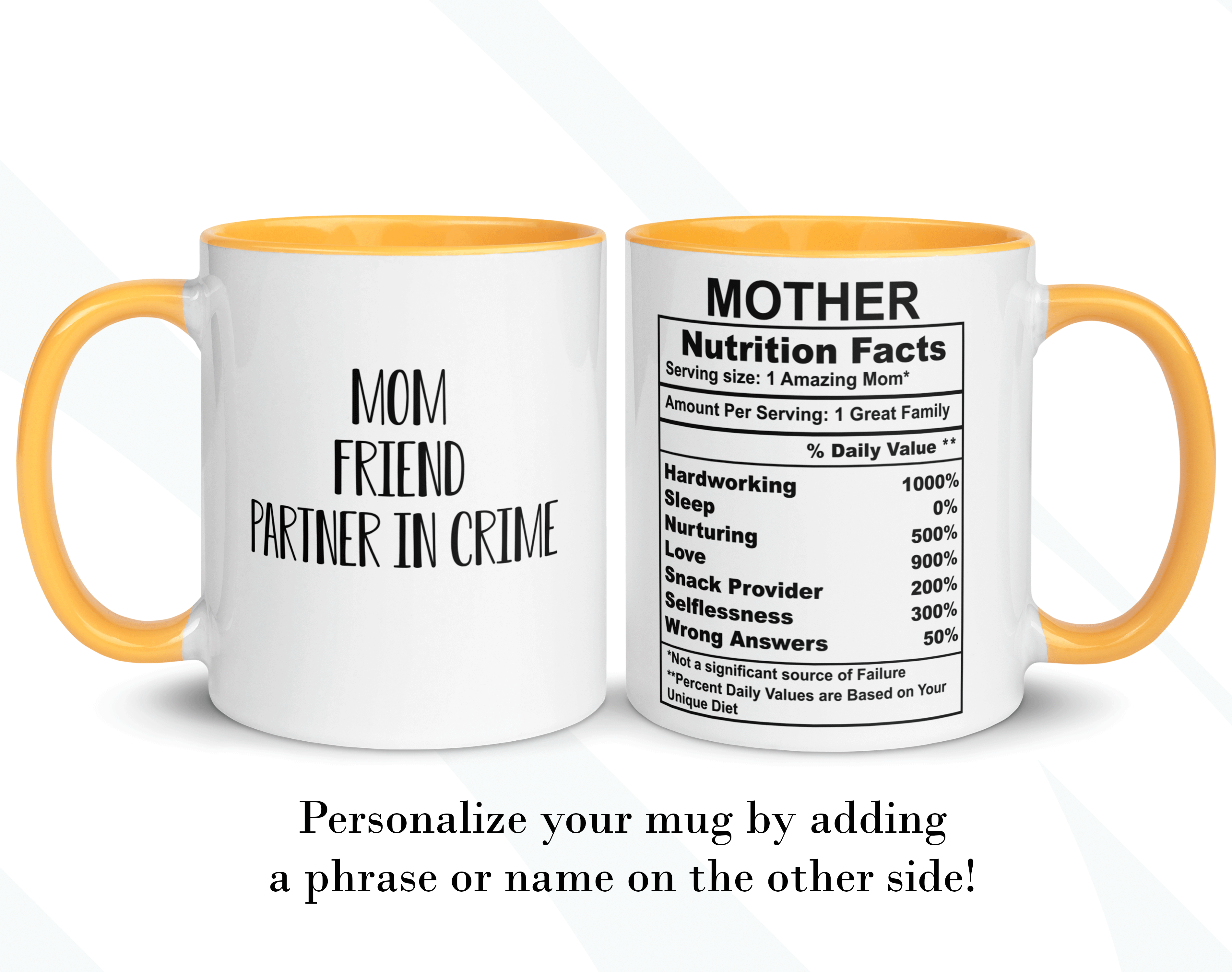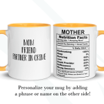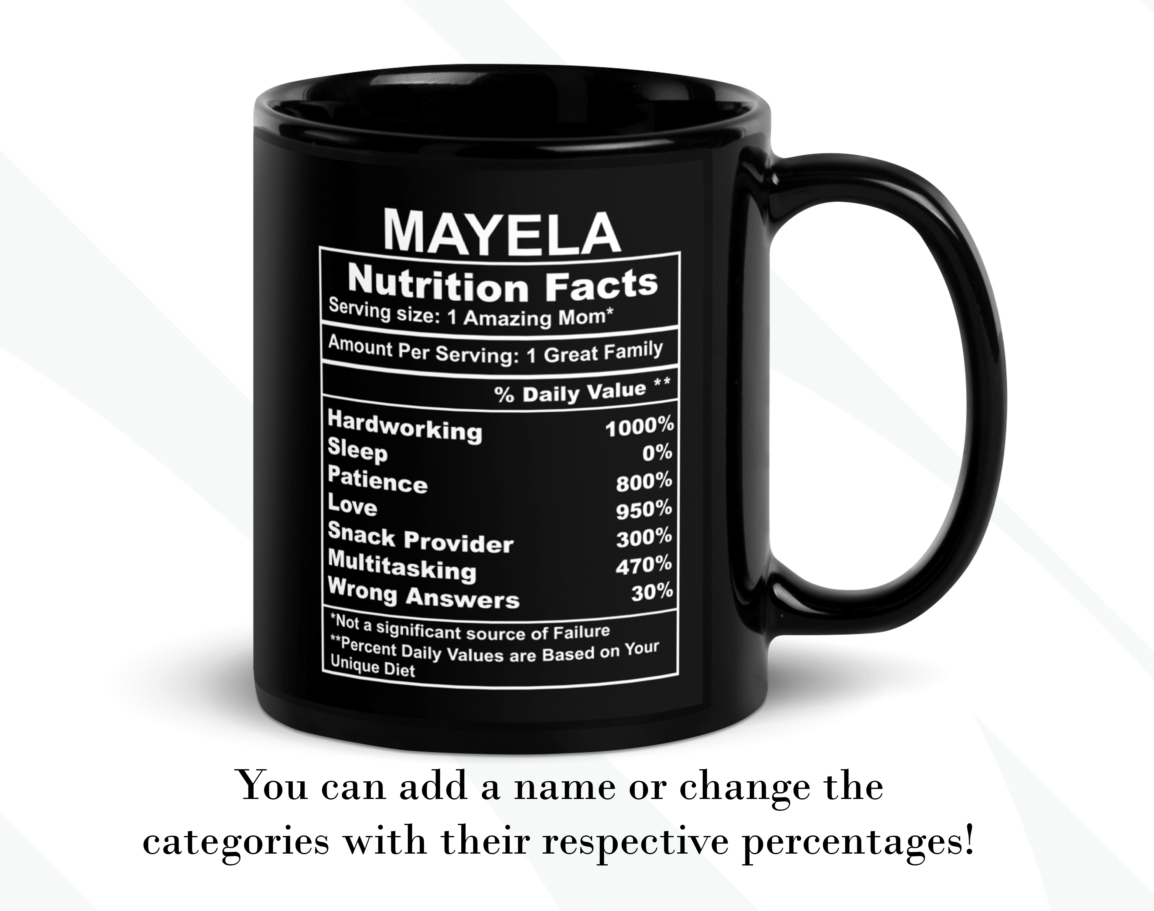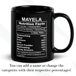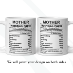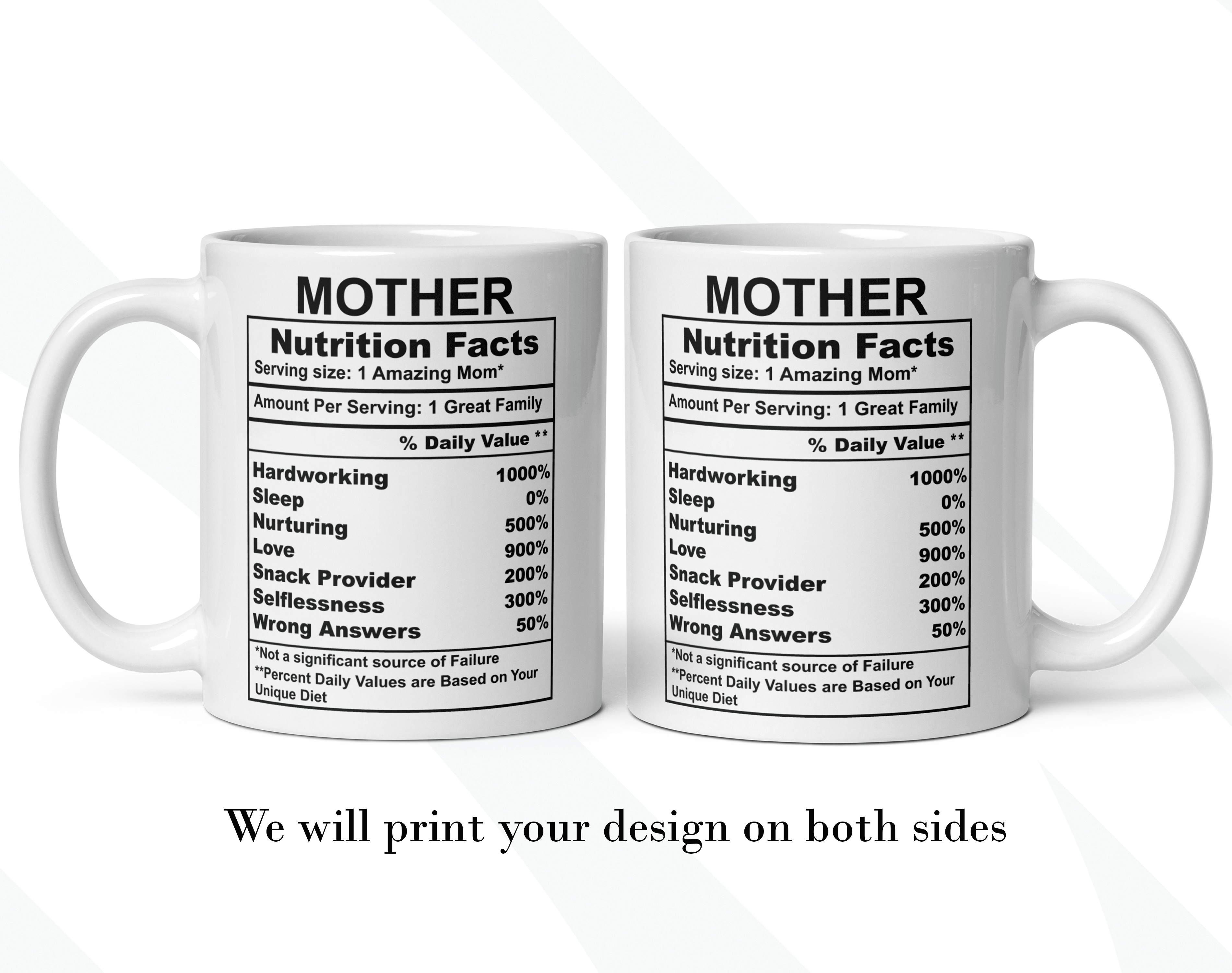 By default, we will print the main design on both sides of your mother’s mug. As in the pictures, you can put a name or phrase on the mug’s back. If you add text to the mug’s back, please let us know your preferred font number (the options are on the pictures). As in the pictures, you can add a name or change the categories and percentages. Please help us by providing as much information as possible in the personalized text box; we will take care of the rest! It’s your customized mug, so you can design your gift for Mom as you wish!