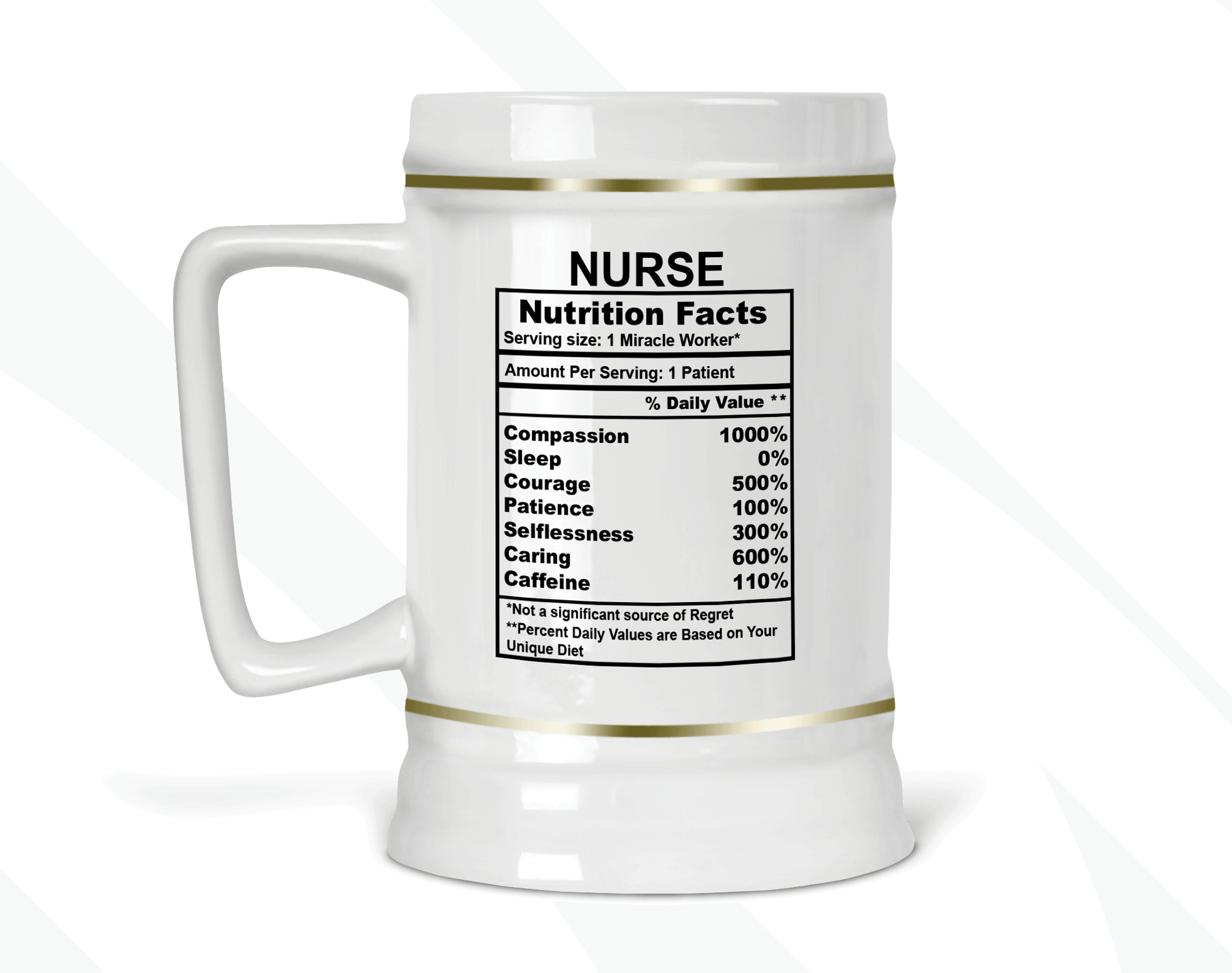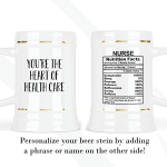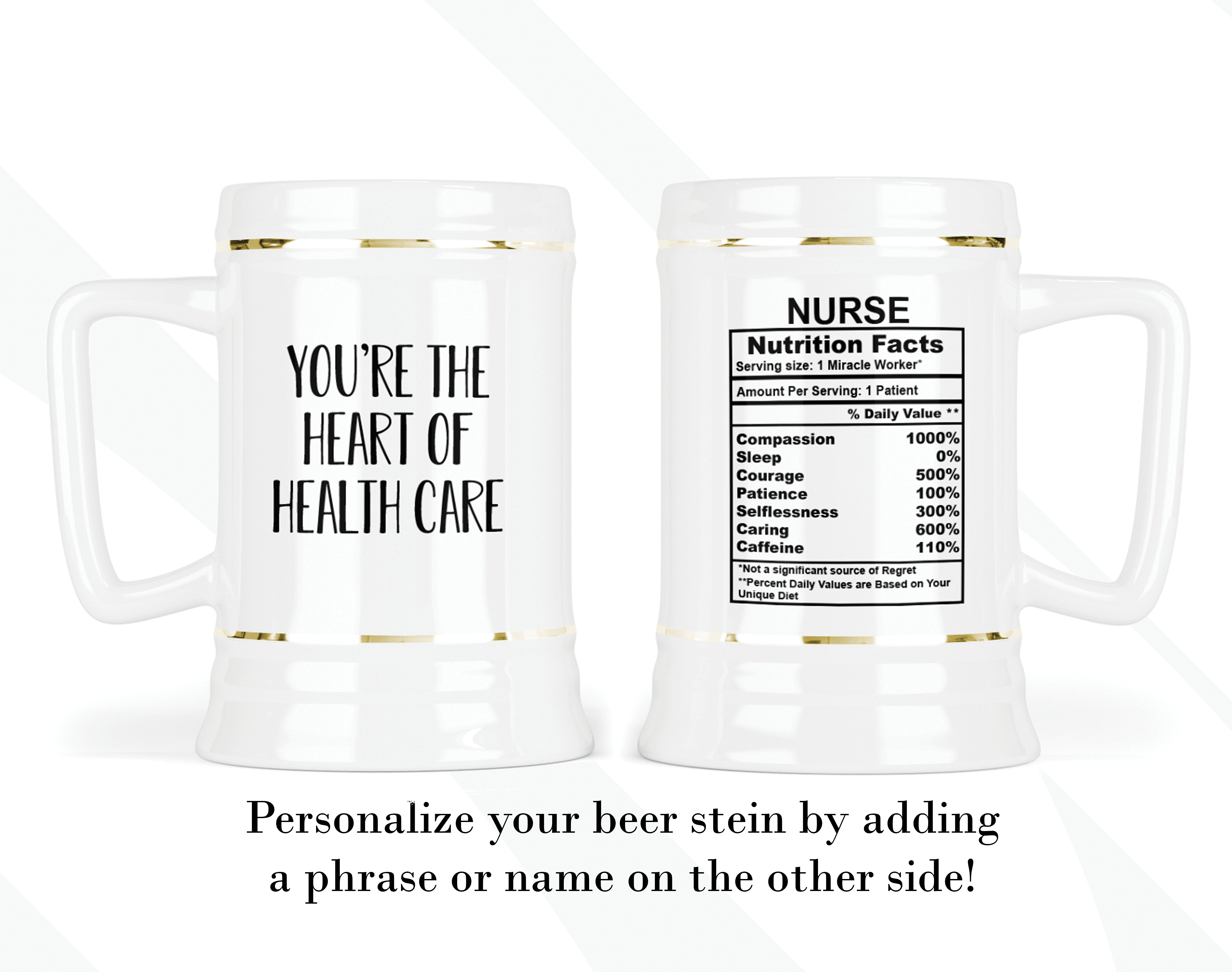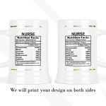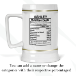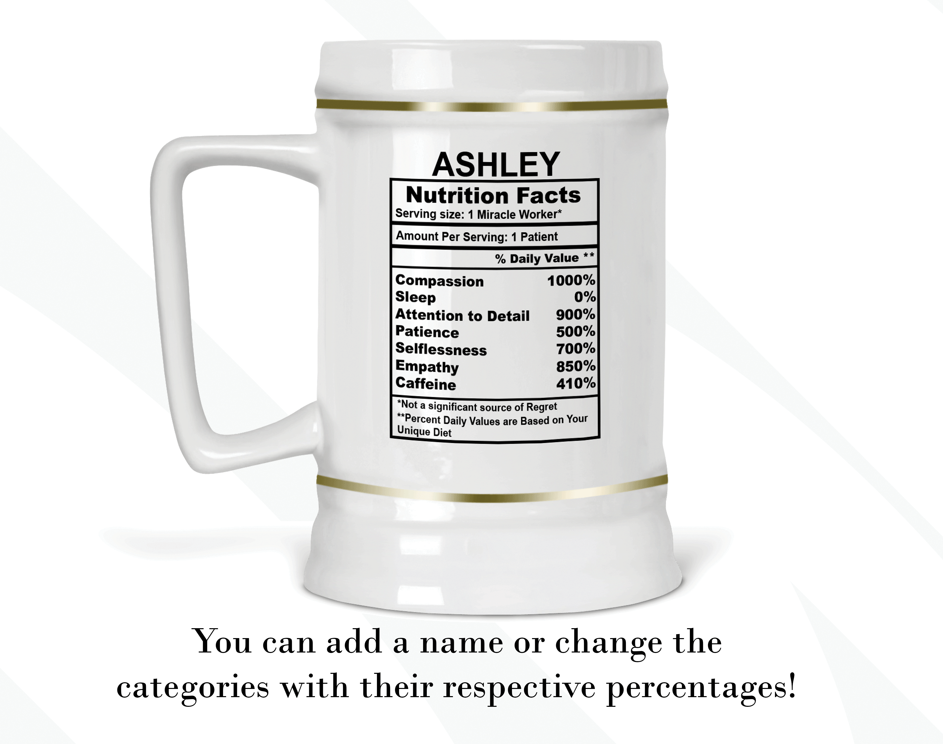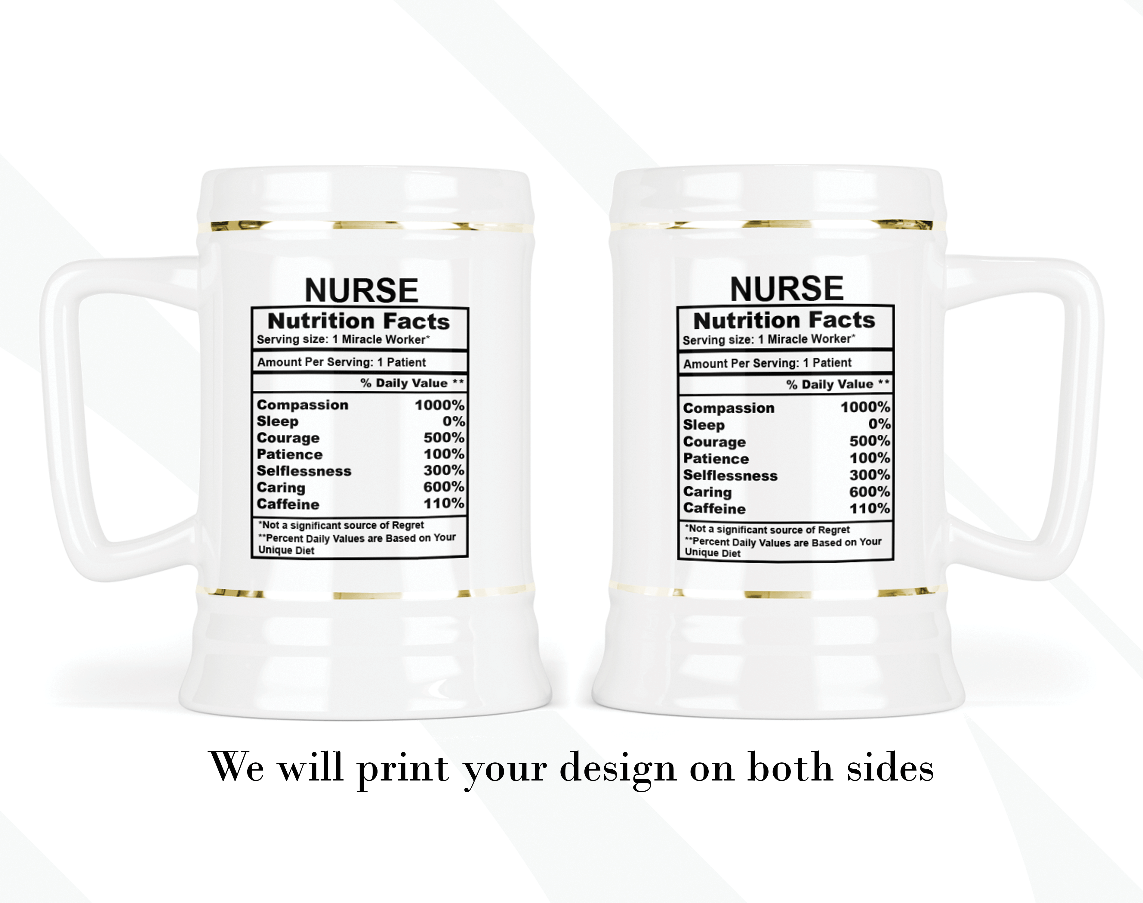 By default, we will print the main design on both sides of your nurse beer stein. As in the pictures, you can put a name or phrase on the beer stein’s back. If you add text to the beer stein’s back, please let us know your preferred font number (the options are on the pictures). As in the pictures, you can add a name or change the categories and percentages. Please help us by providing as much information as possible in the personalized text box; we will take care of the rest! It’s your customized beer stein, so you can design your nurse gift as you wish!