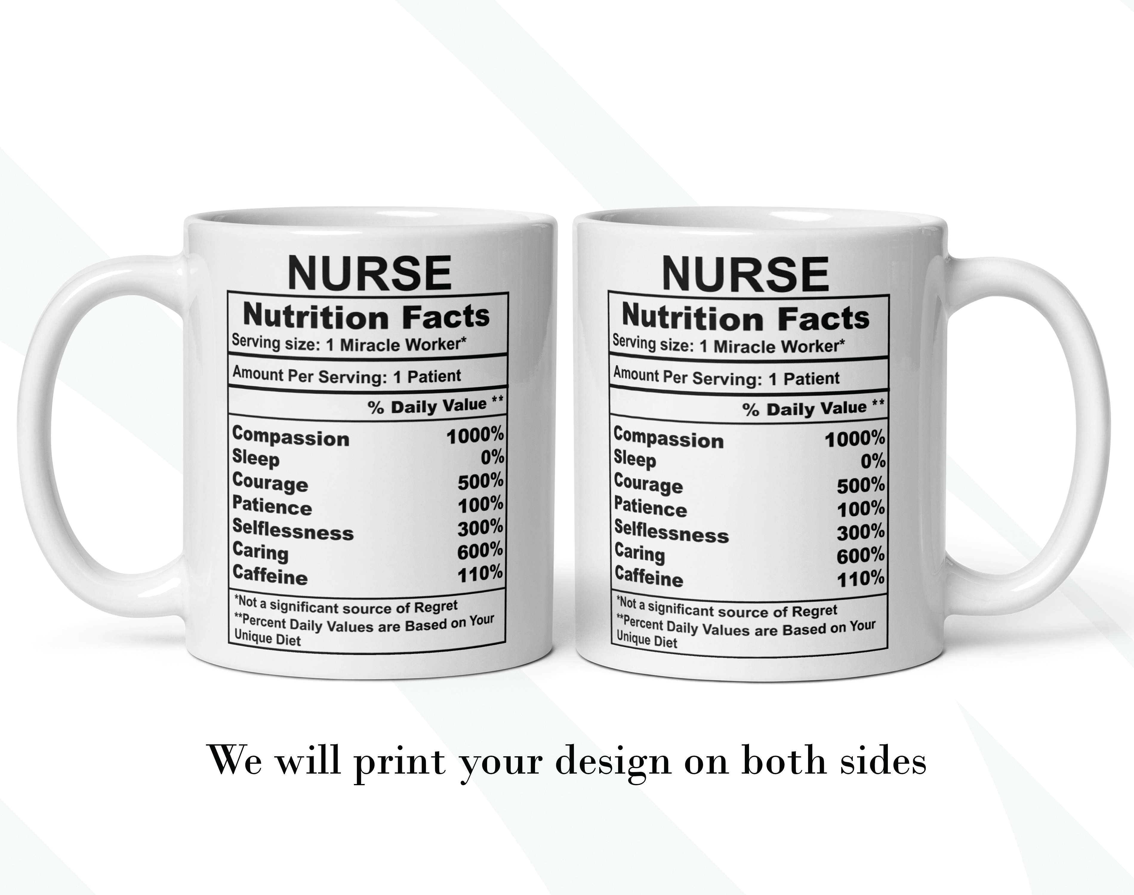 By default, we will print the main design on both sides of your nurse mug. You can put a name or phrase on the mug’s back, as in the pictures. If you add text to the mug’s back, please let us know your preferred font number (the options are on the pictures). As in the pictures, you can add a name or change the categories and percentages. Please help us by providing as much information as possible in the personalized text box; we will take care of the rest! It’s your customized mug, so you can design your nurse gift as you wish!