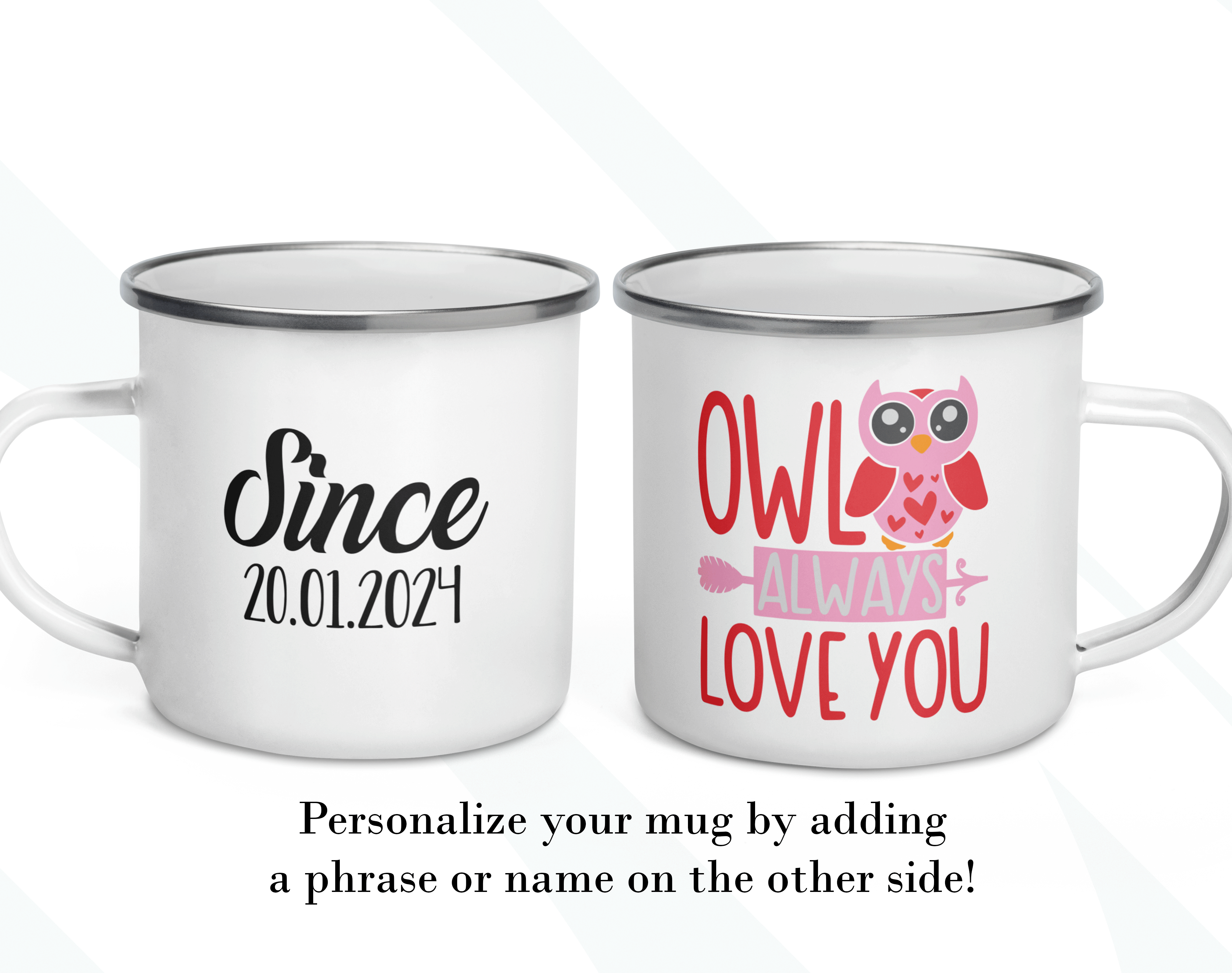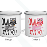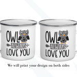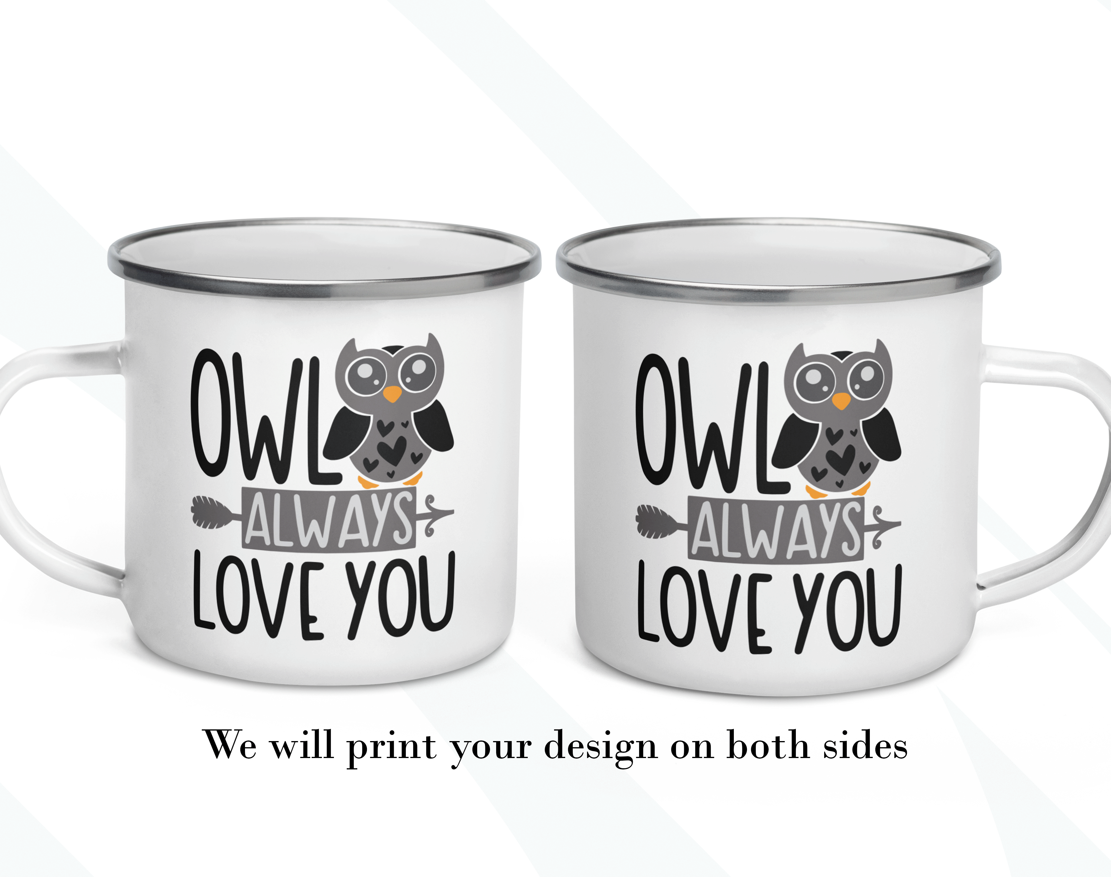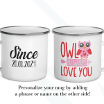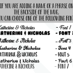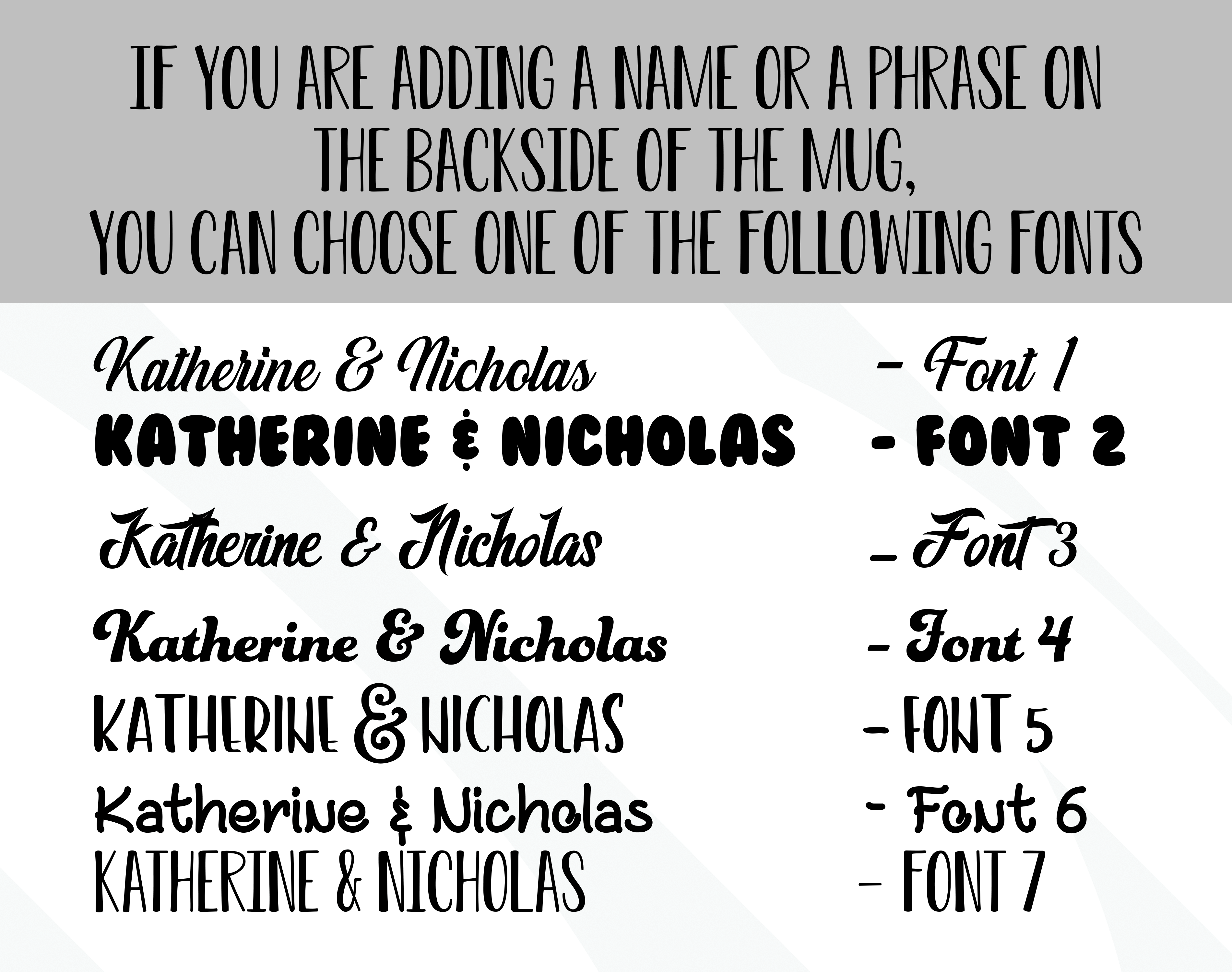 By default, we will print your chosen design on both sides. You can put a name or phrase on the mug’s back, as in the pictures. Please help us by providing as much information as possible in the personalized text box; we will take care of the rest. If you add text, please let us know your preferred font number (the options are on the pictures). It’s your personalized mug, so you can design your custom mug as you wish!