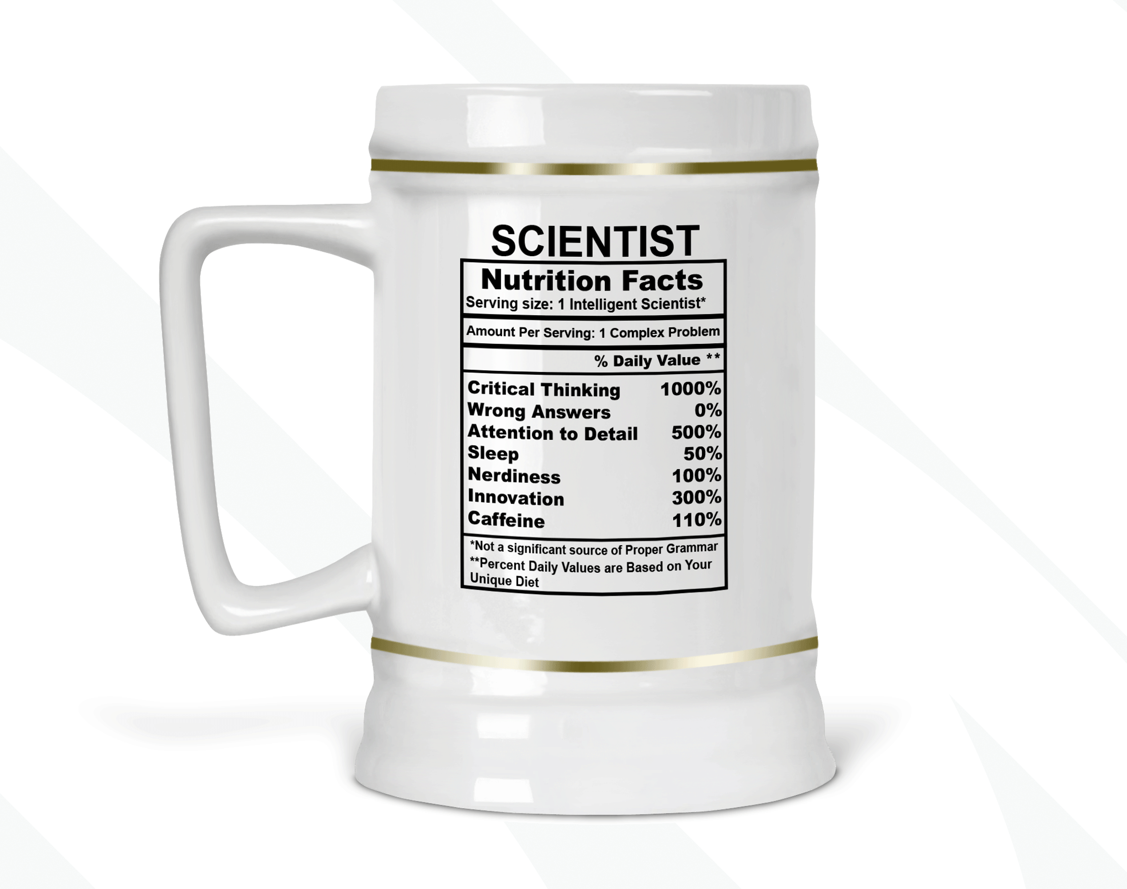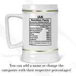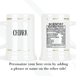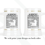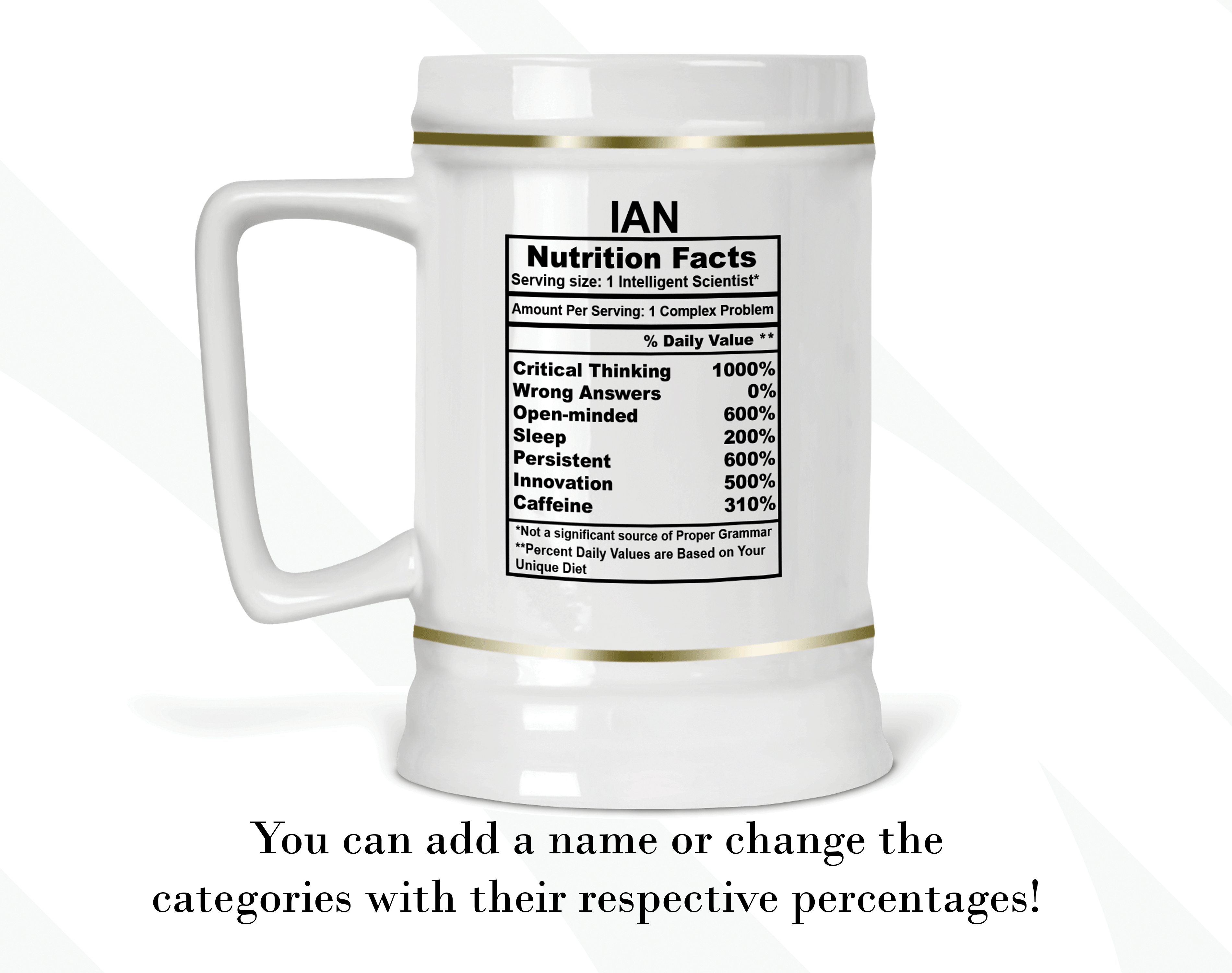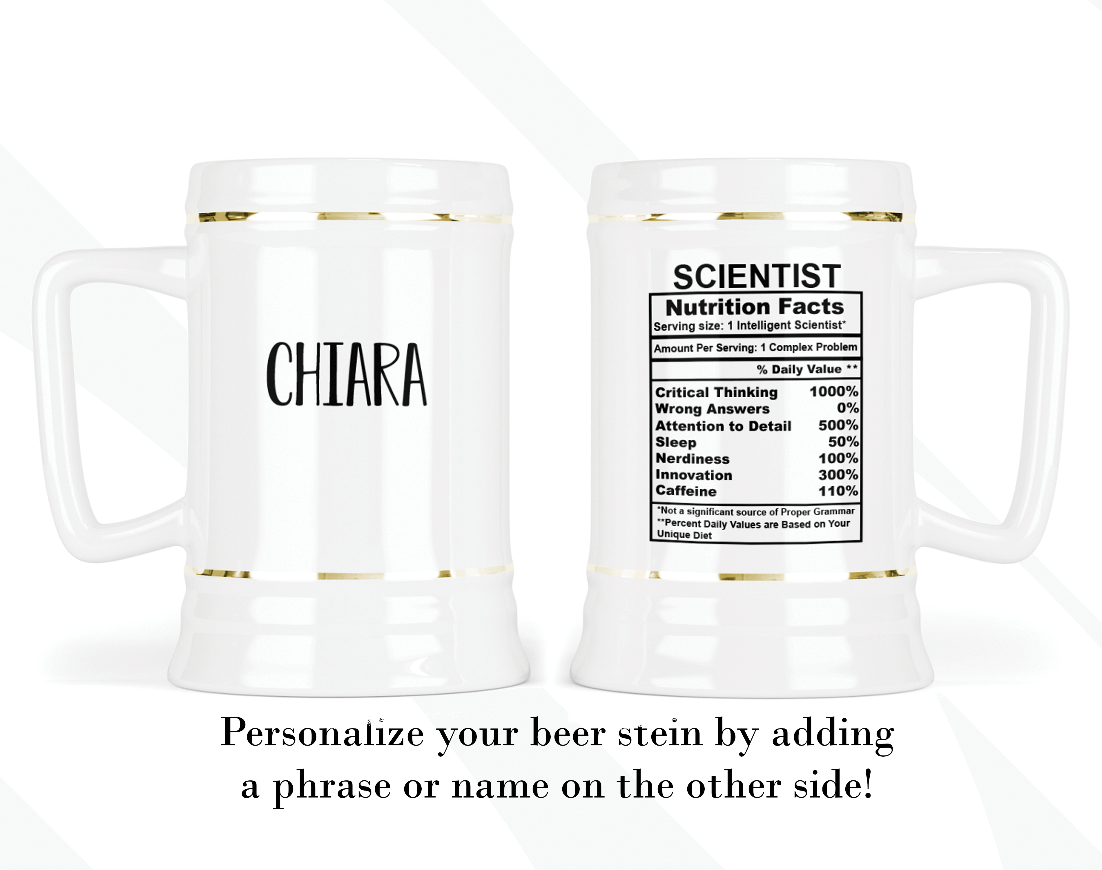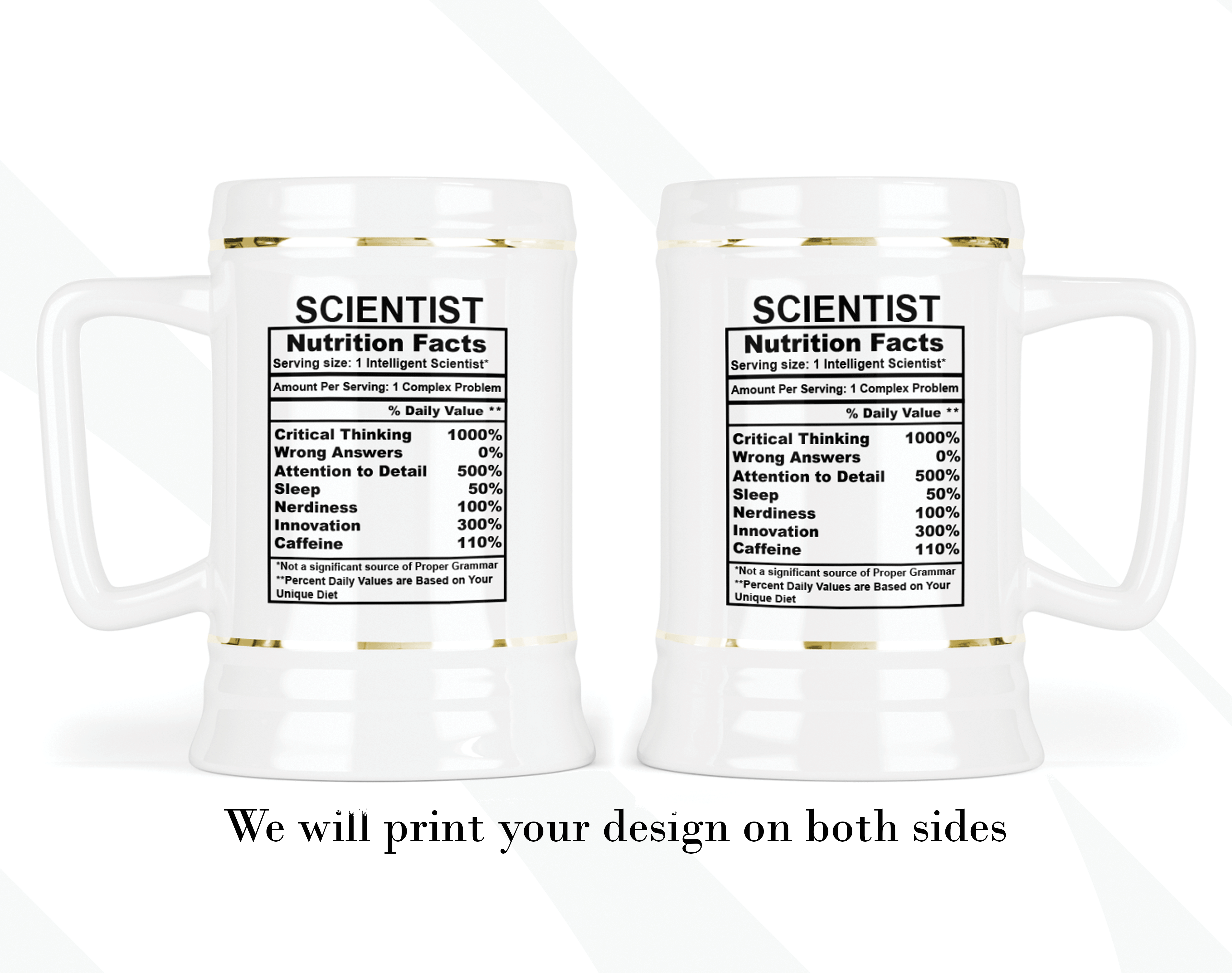 By default, we will print the main design on both sides of your scientist’s beer stein. As in the pictures, you can put a name or phrase on the beer stein’s back. If you add text to the beer stein’s back, please let us know your preferred font number (the options are on the pictures). As in the pictures, you can add a name or change the categories and percentages. Please help us by providing as much information as possible in the personalized text box; we will take care of the rest! It’s your customized beer stein, so you can design your scientist gift as you wish!