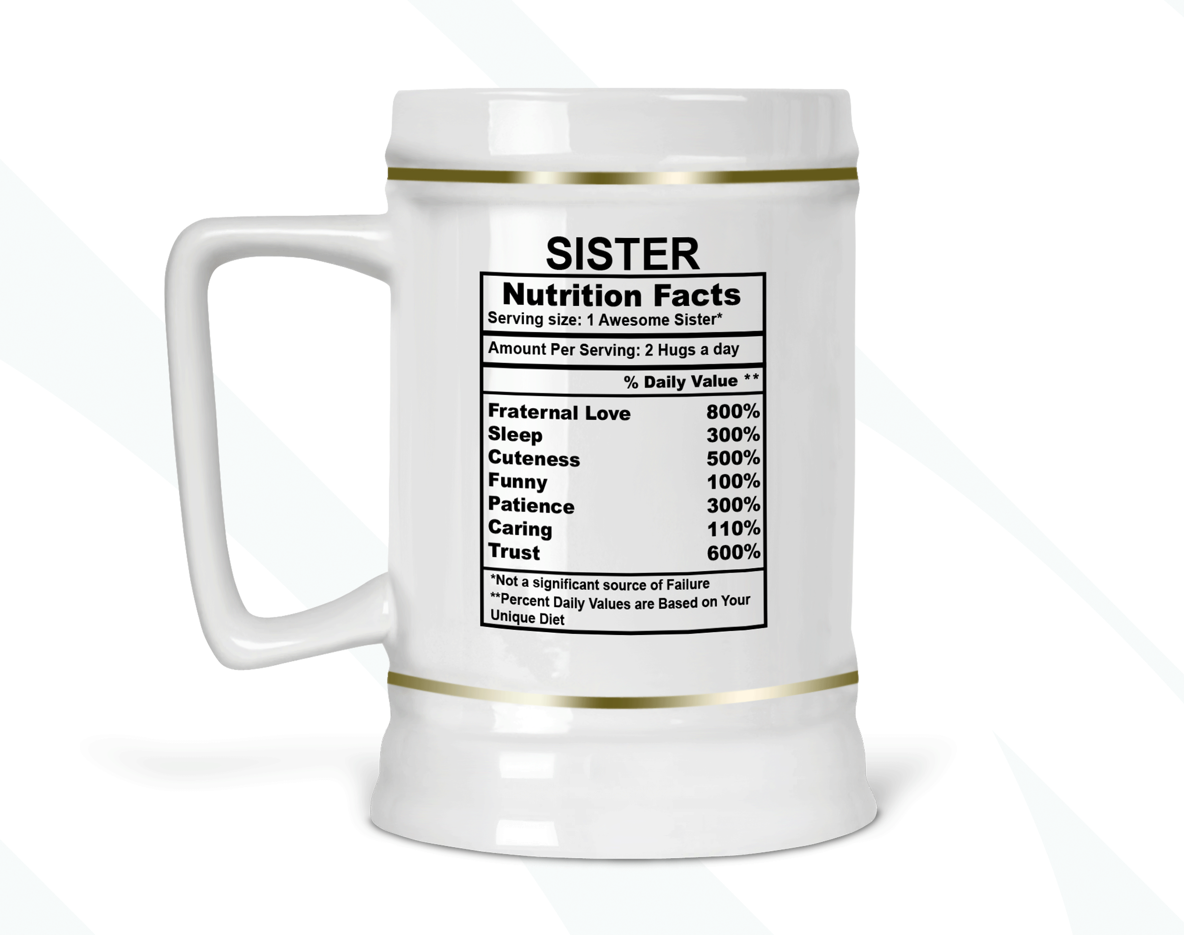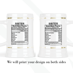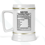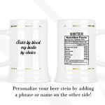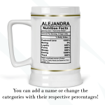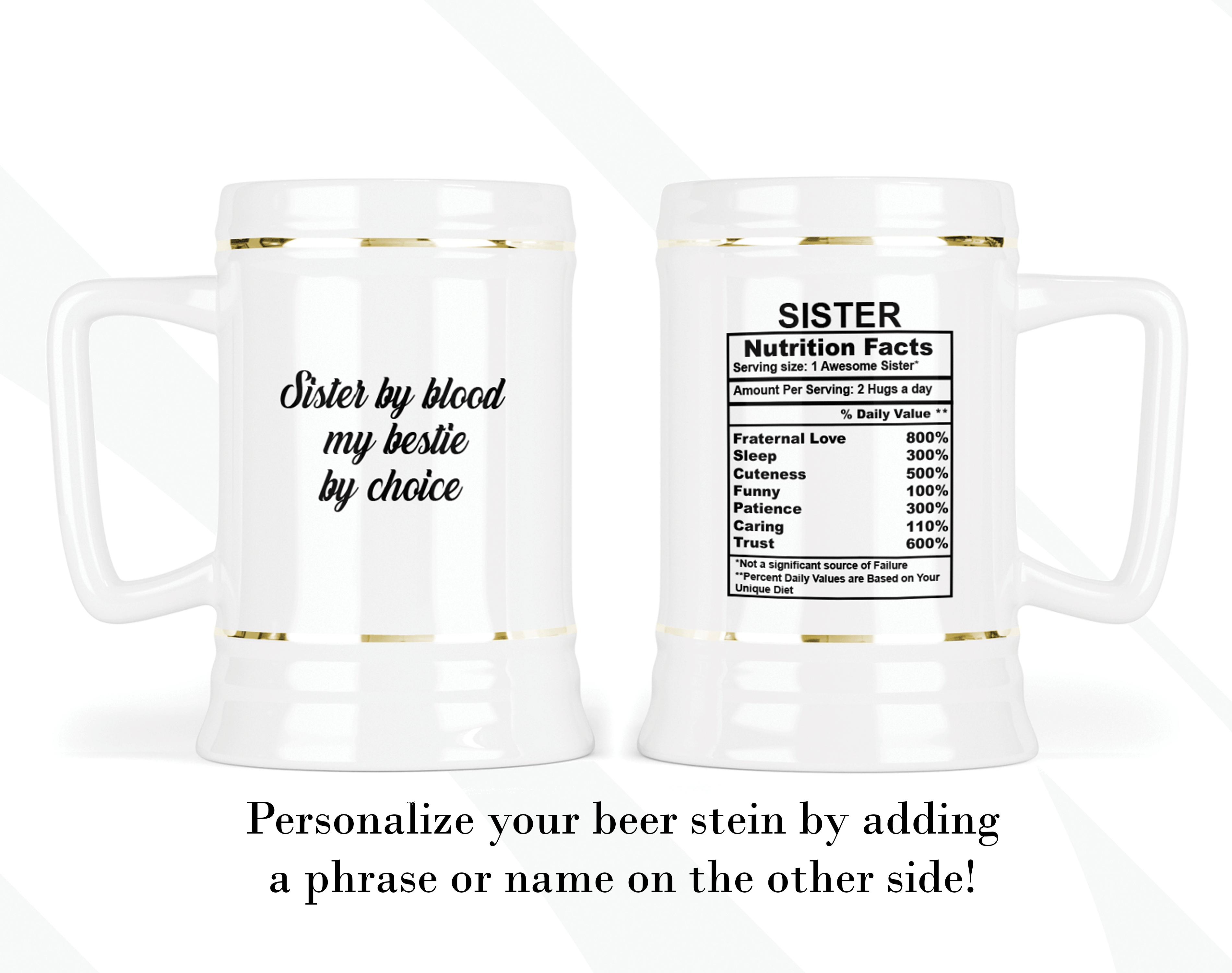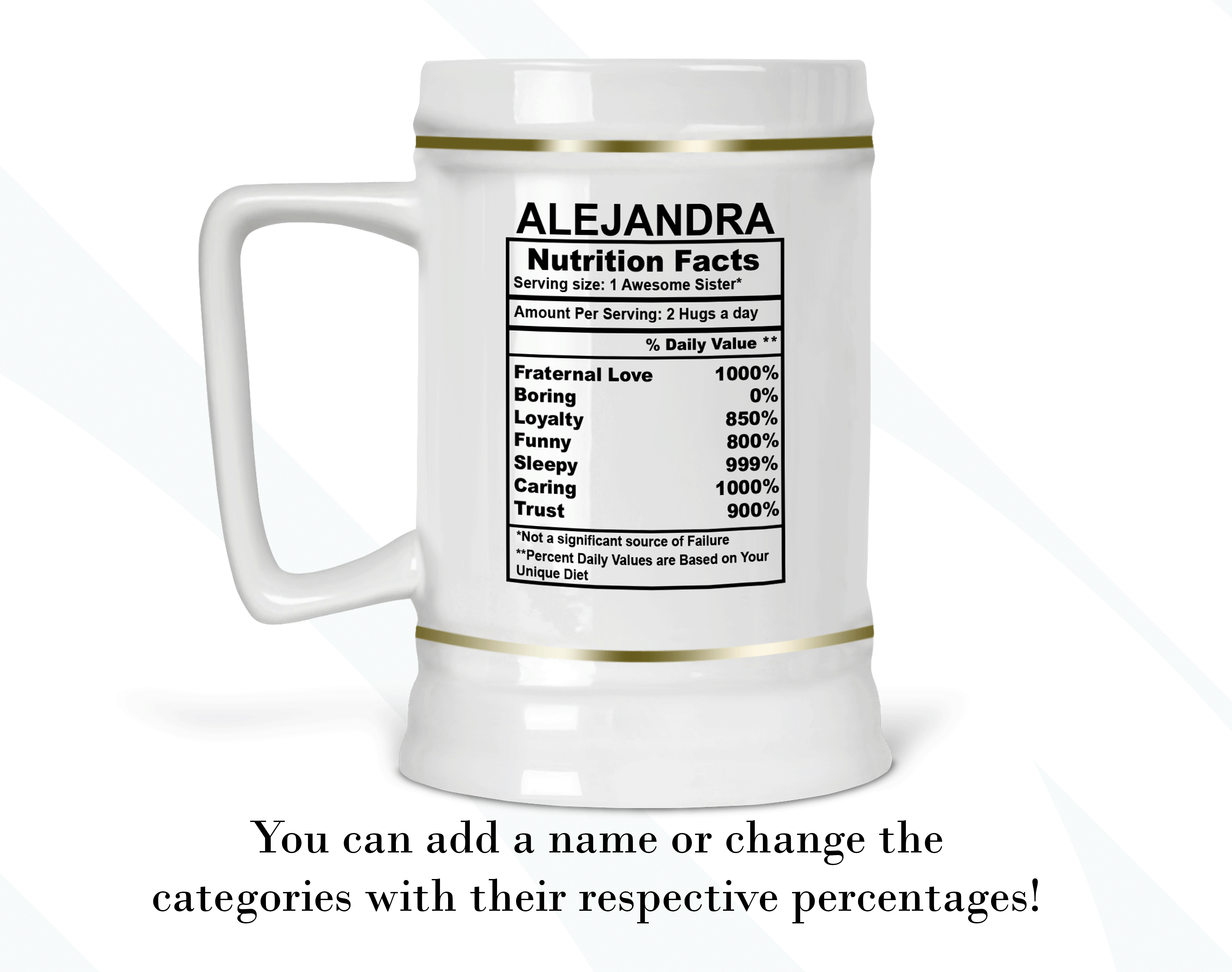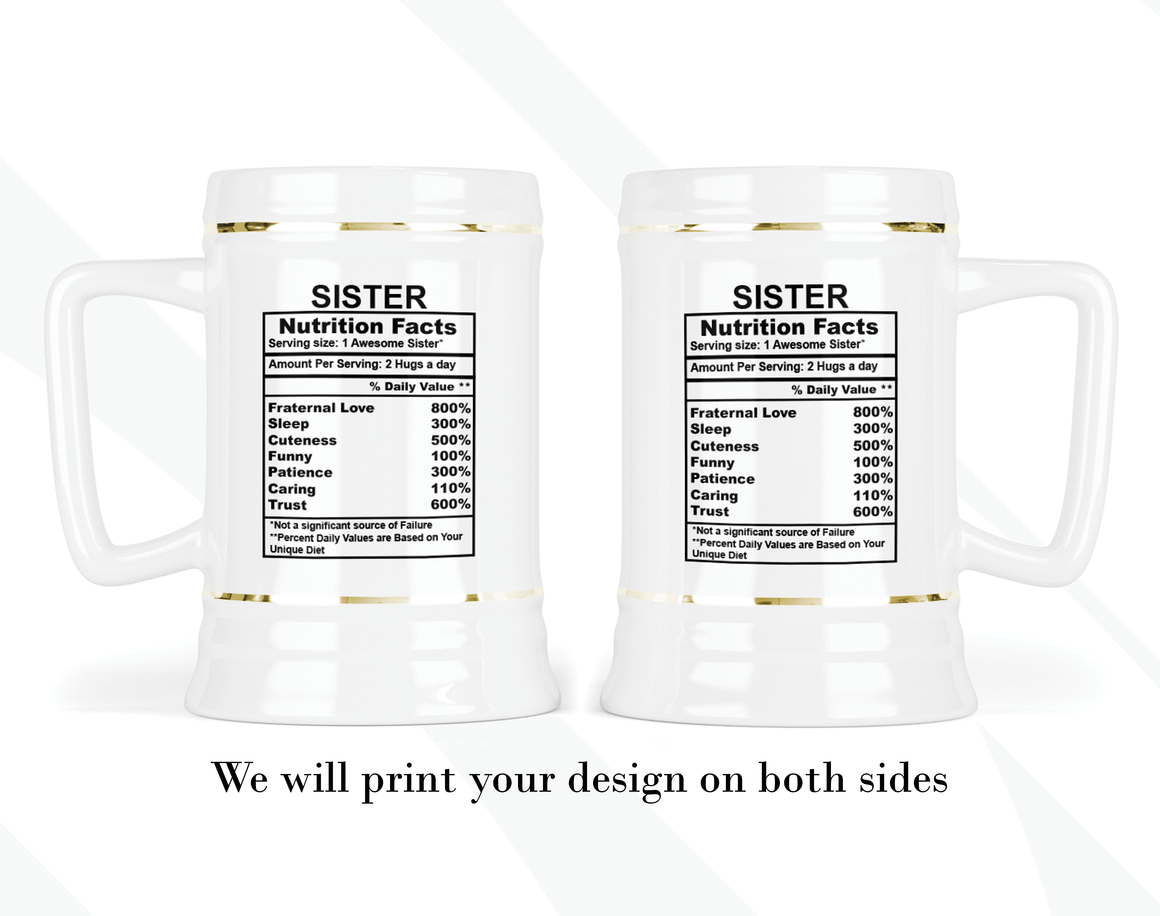 By default, we will print the main design on both sides of your sister beer stein. As in the pictures, you can put a name or phrase on the beer stein’s back. If you add text to the beer stein’s back, please let us know your preferred font number (the options are on the pictures). As in the pictures, you can add a name or change the categories and percentages. Please help us by providing as much information as possible in the personalized text box; we will take care of the rest! It’s your customized beer stein, so you can design your sister’s gift as you wish!
