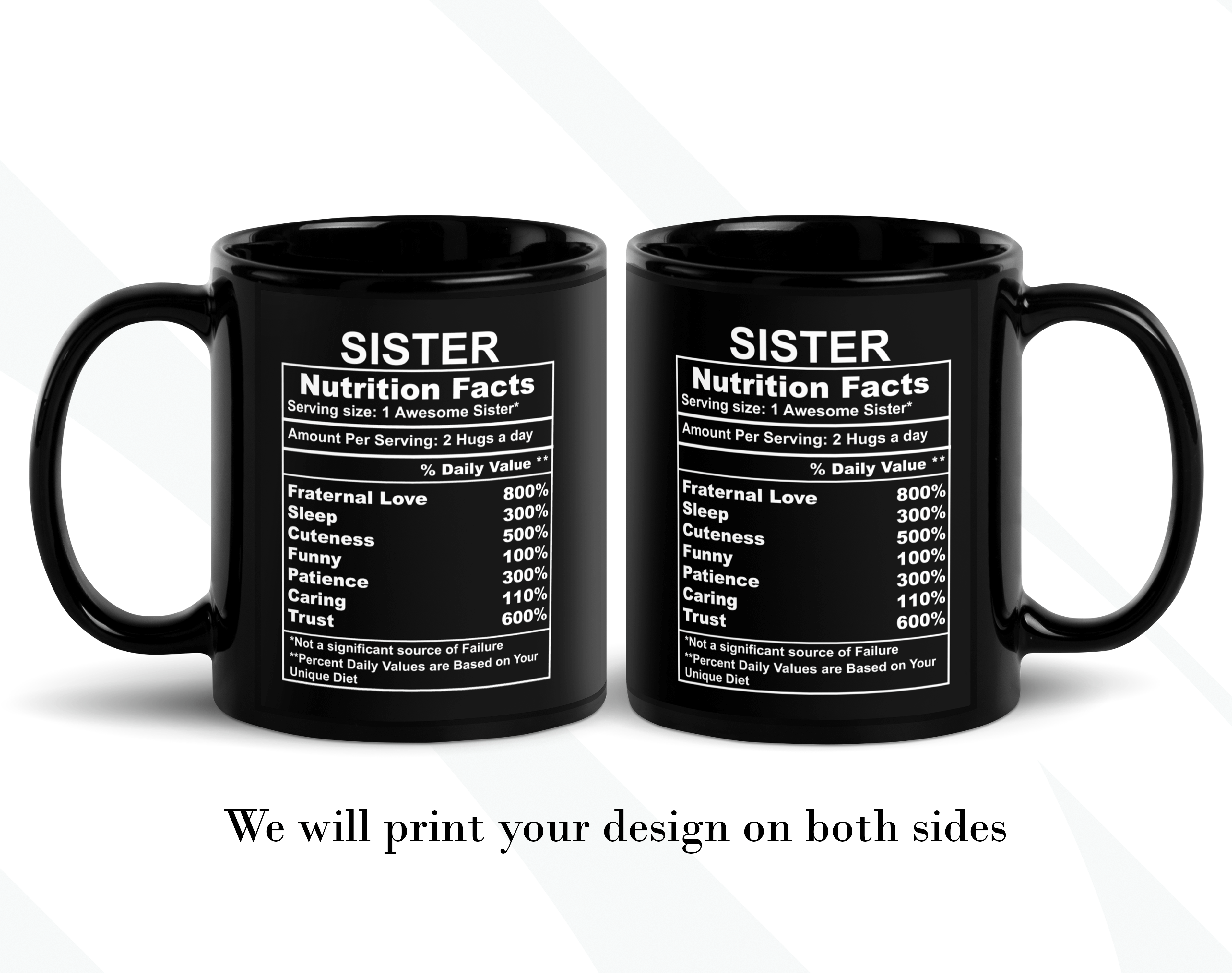By default, we will print the main design on both sides of your sister mug. You can put a name or phrase on the mug’s back, as in the pictures. If you add text to the mug’s back, please let us know your preferred font number (the options are on the pictures). As in the pictures, you can add a name or change the categories and percentages. Please help us by providing as much information as possible in the personalized text box; we will take care of the rest! It’s your customized mug, so you can design your BFF gift as you wish!