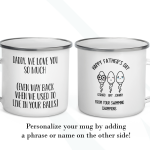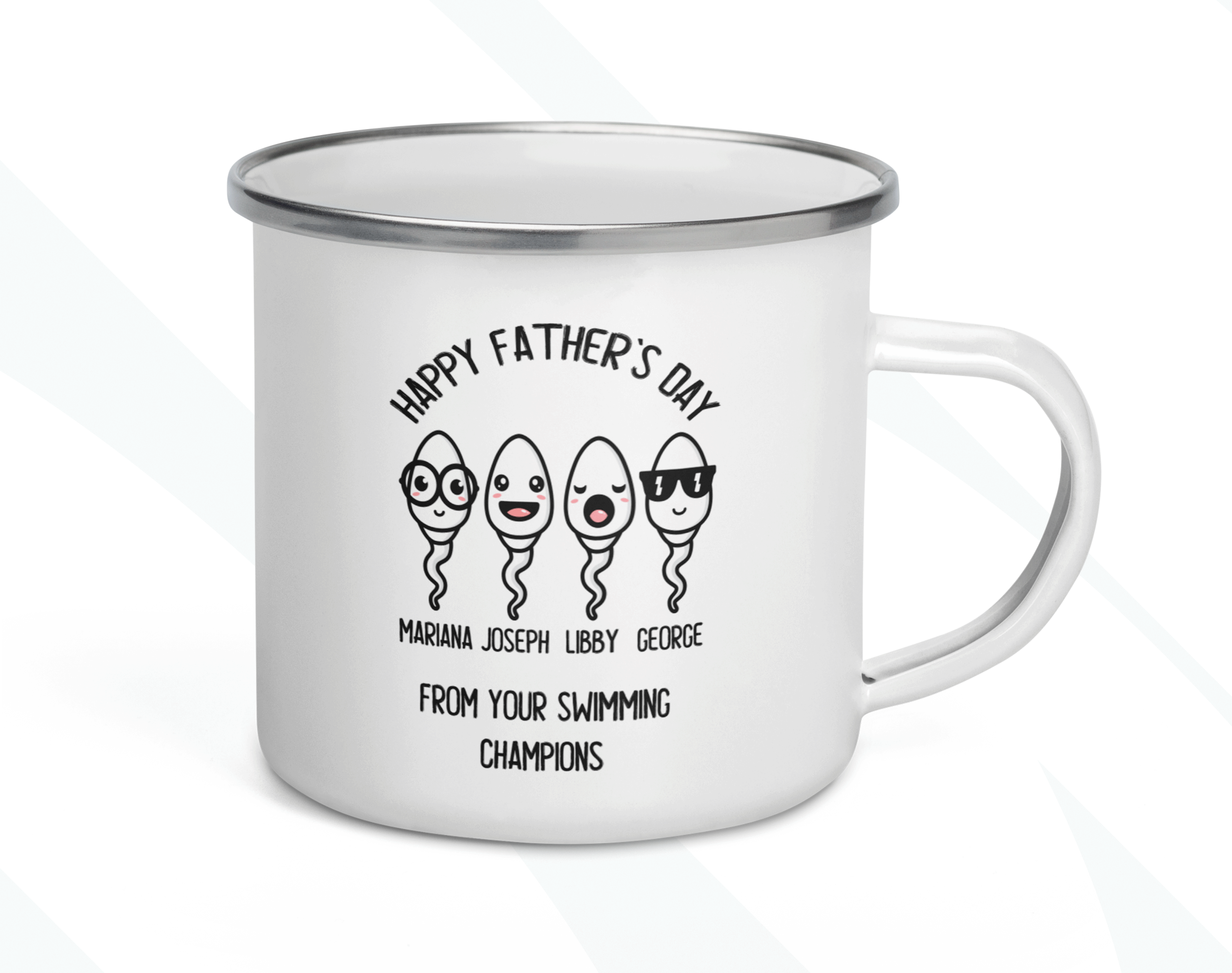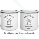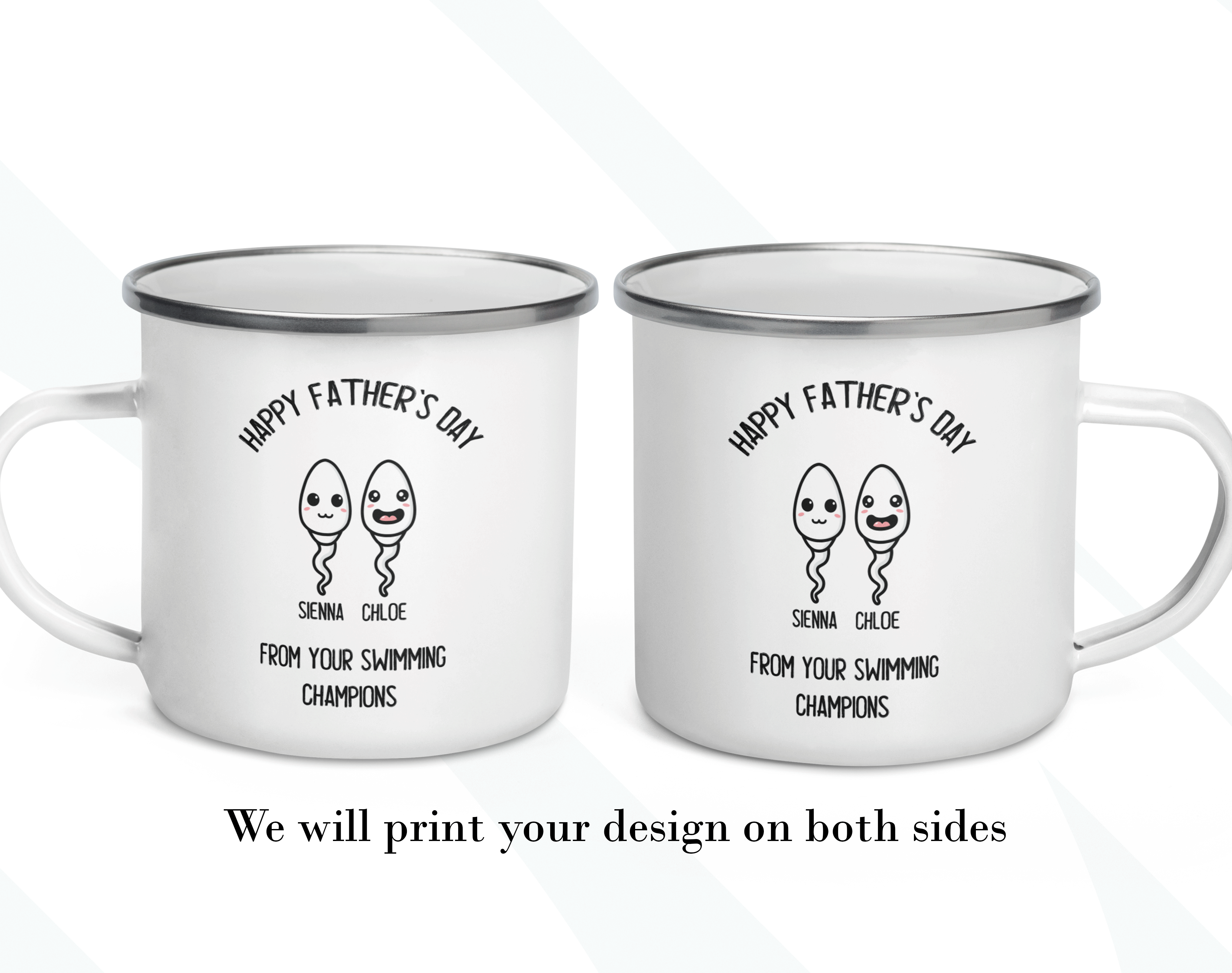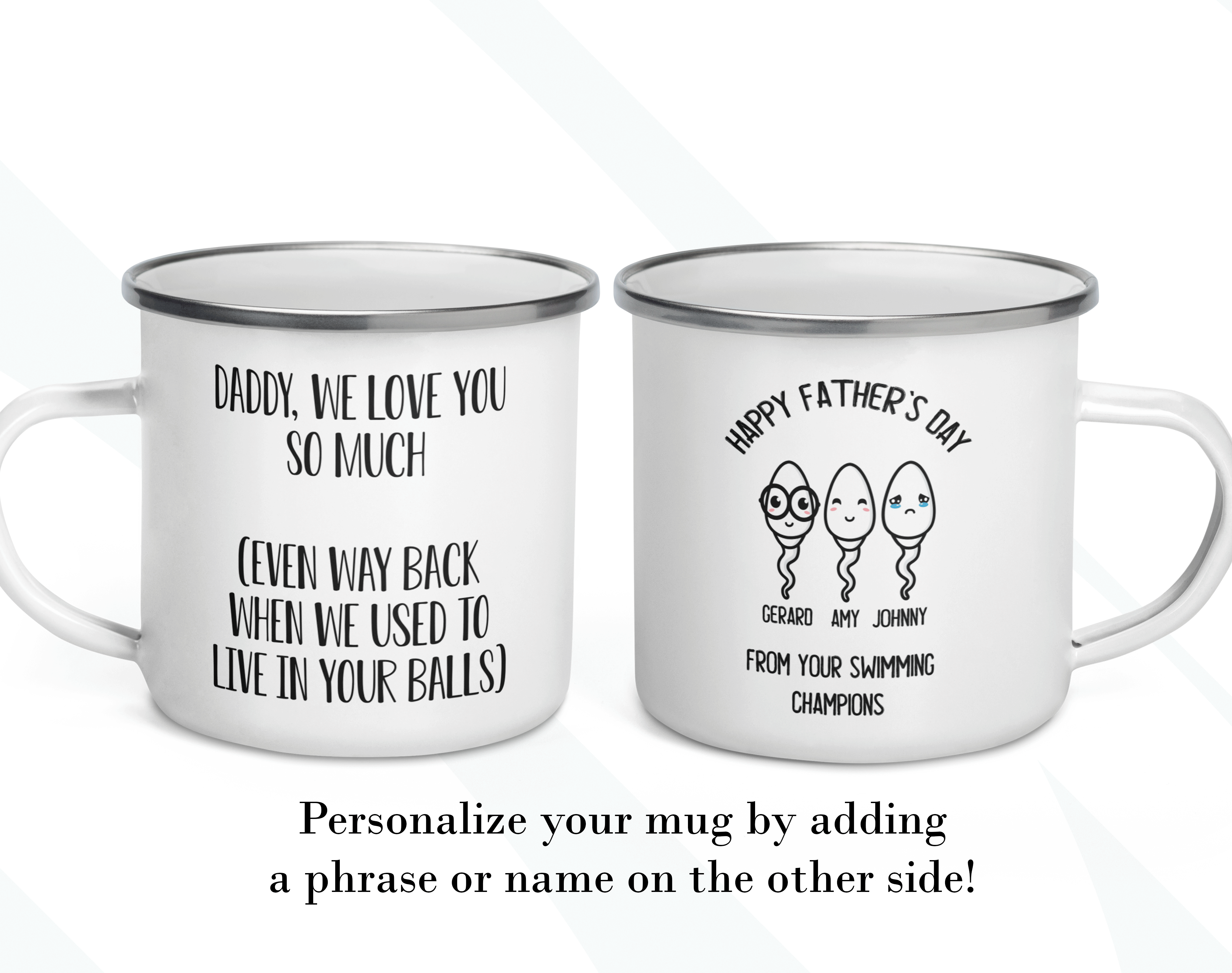 By default, we will print your funny sperm mug on both sides. This Father’s Day gift is a customized mug with a custom sperm design and the name given to each child. You choose the little sperm you want for each of your children according to their personality. Please write each child’s name on the personalized box next to the number of the little sperm you want for each. You can put a name or phrase on the mug’s back, as in the pictures. If you add text to the mug’s back, please let us know your preferred font number (the options are on the pictures). Please help us by providing as much information as possible in the personalized text box; we will take care of the rest! This sperm mug is your perfect gift, so you can design your gift for Dad as you wish!