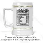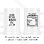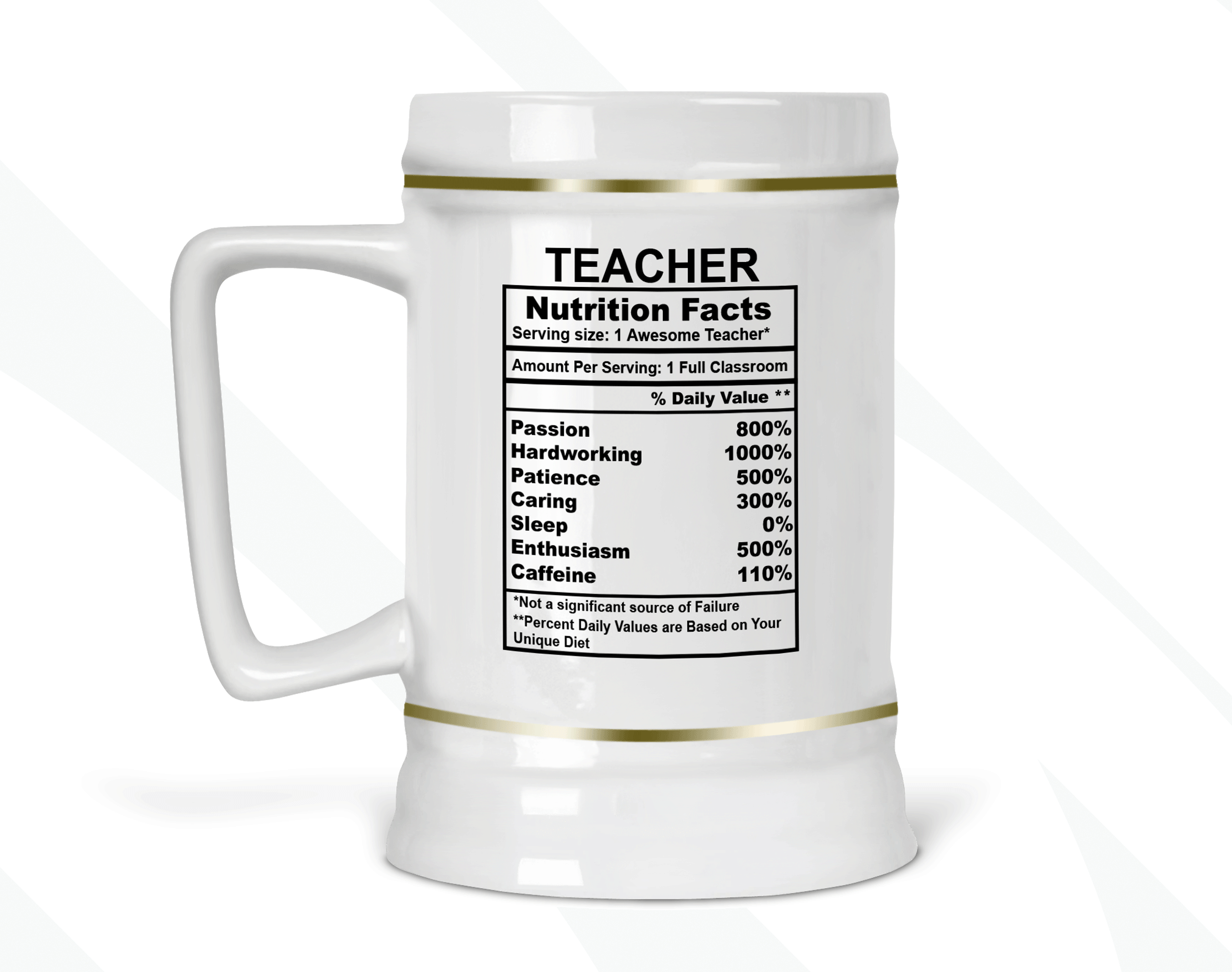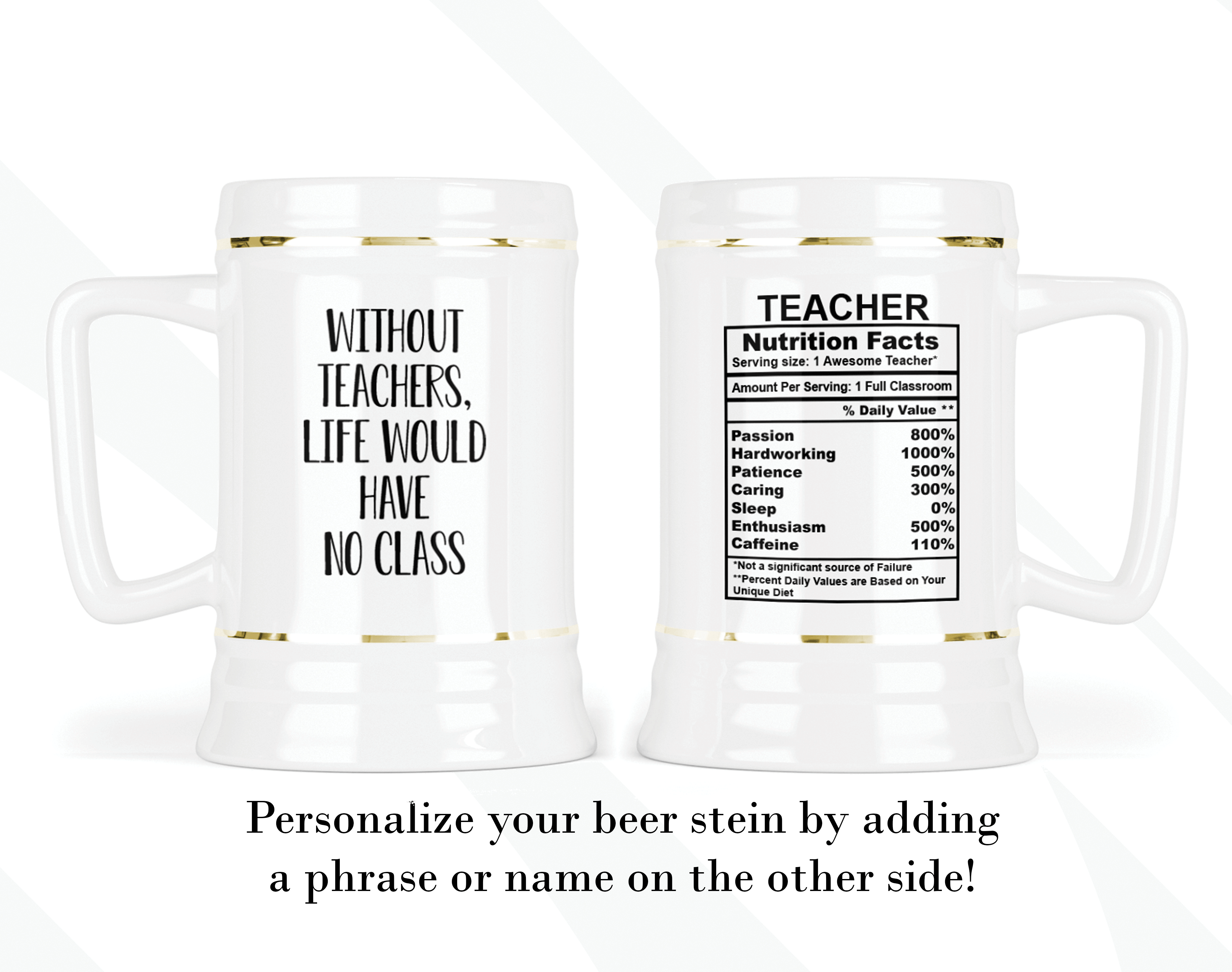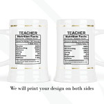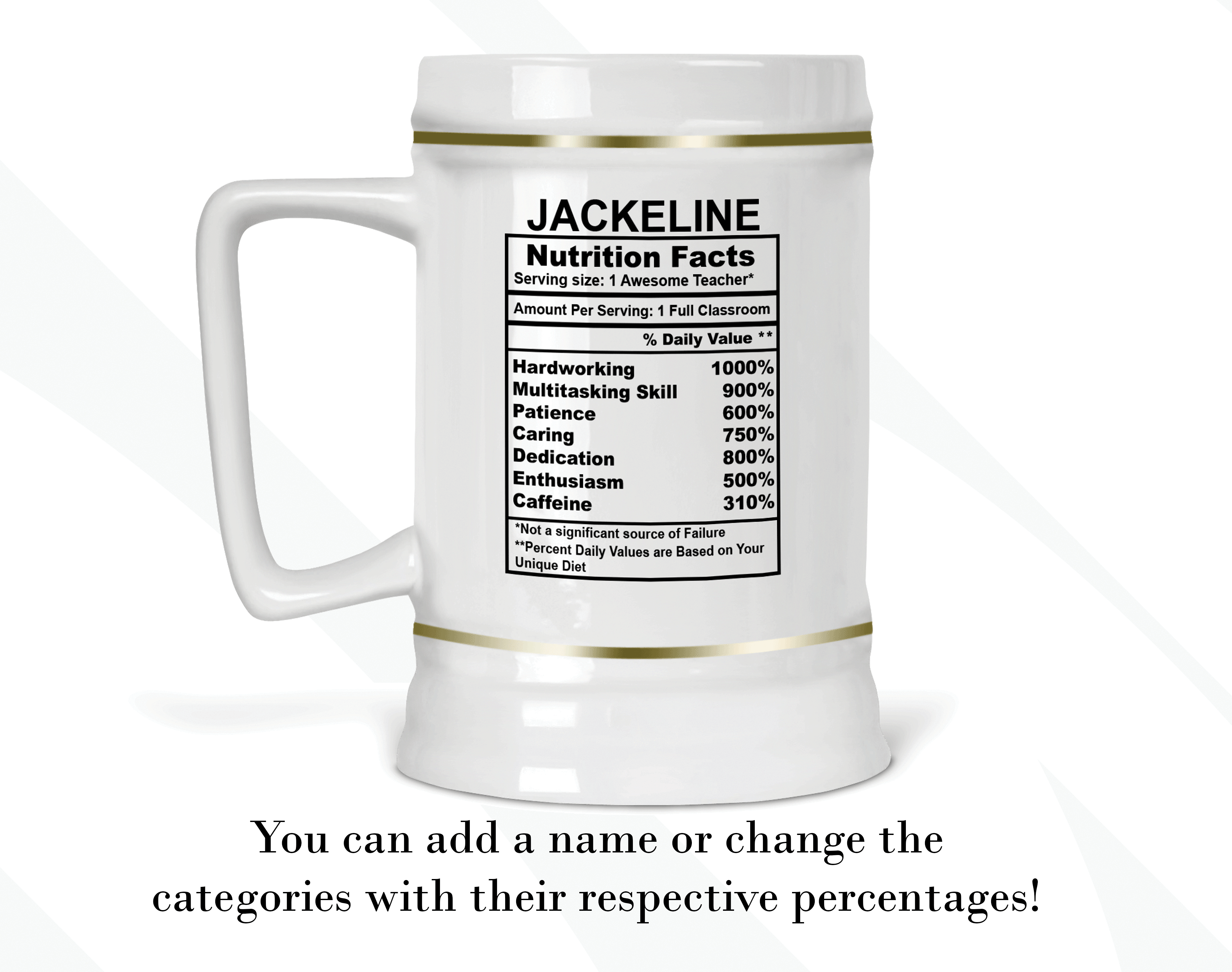 By default, we will print the main design on both sides of your teacher beer stein. As in the pictures, you can put a name or phrase on the beer stein’s back. If you add text to the beer stein’s back, please let us know your preferred font number (the options are on the pictures). As in the pictures, you can add a name or change the categories and percentages. Please help us by providing as much information as possible in the personalized text box; we will take care of the rest! It’s your customized beer stein, so you can design your teacher’s gift as you wish!