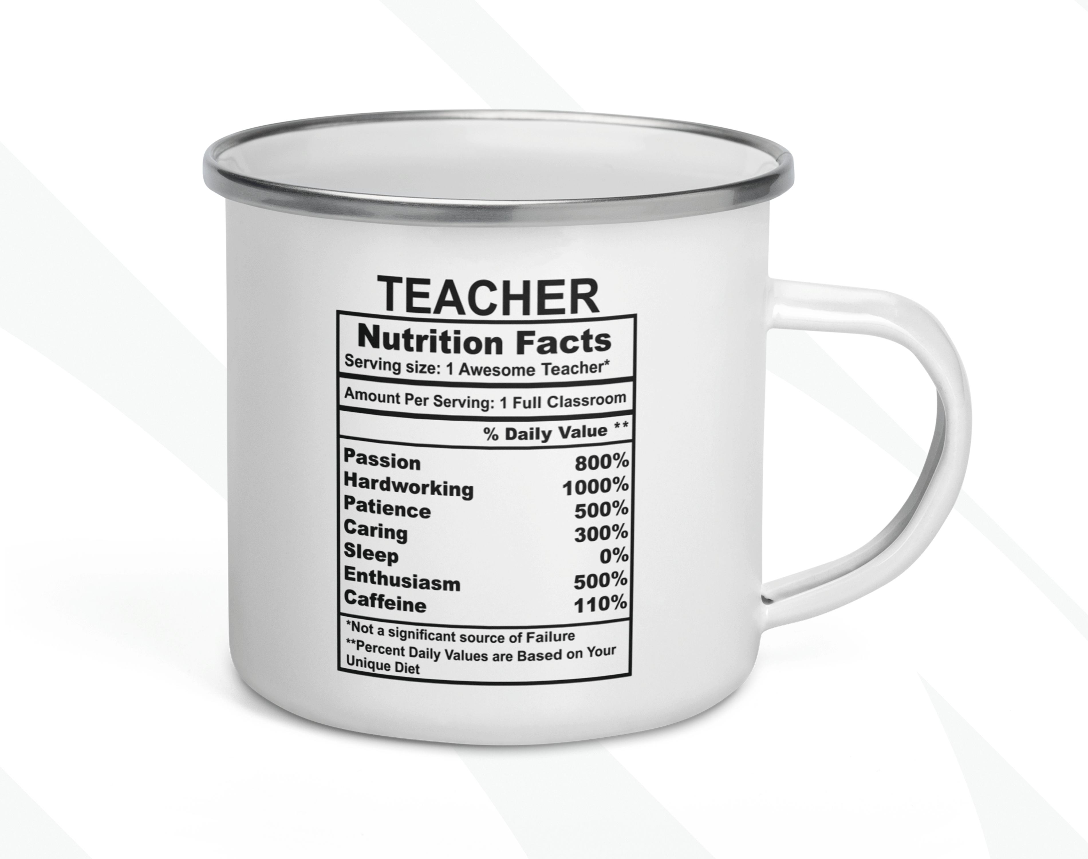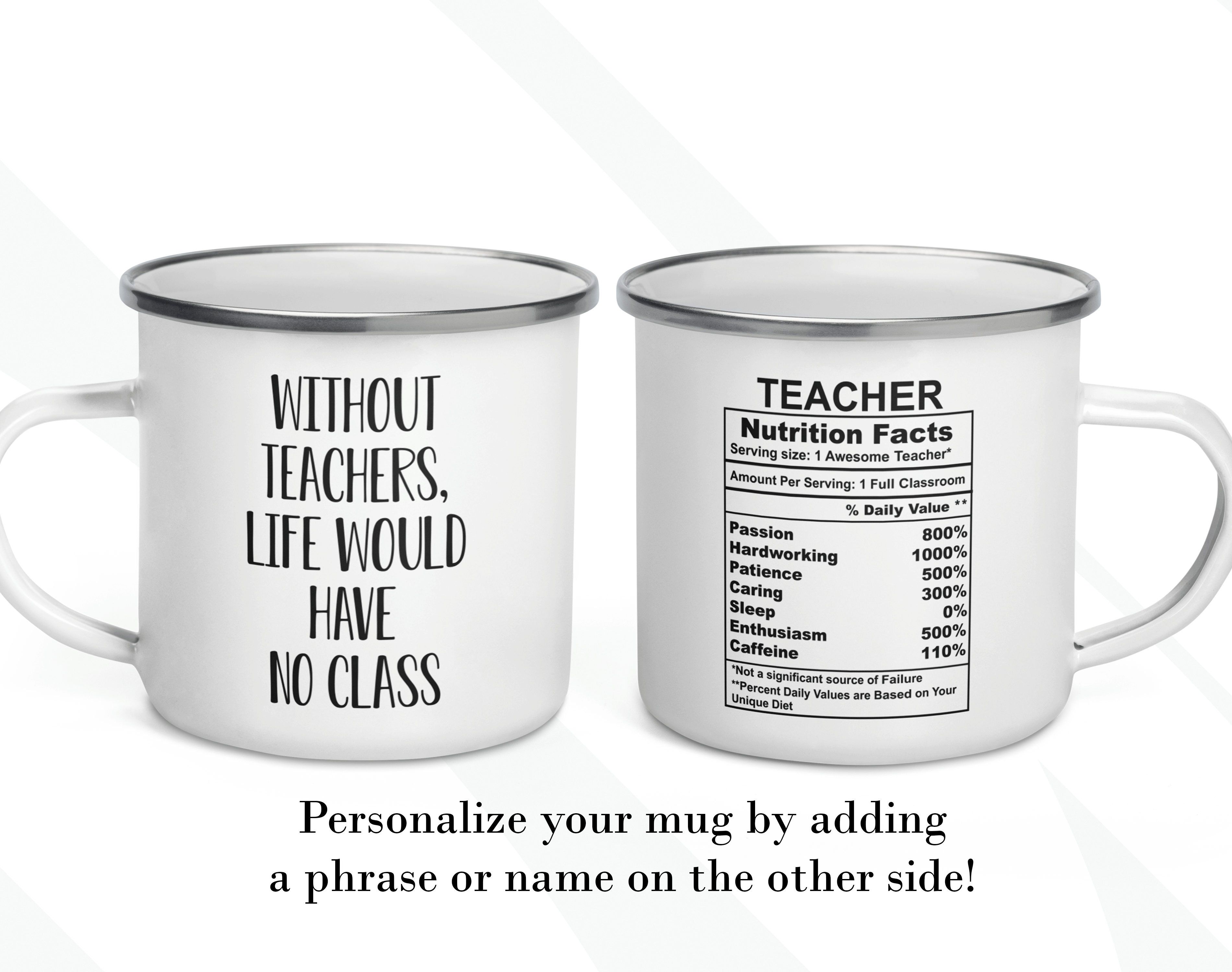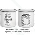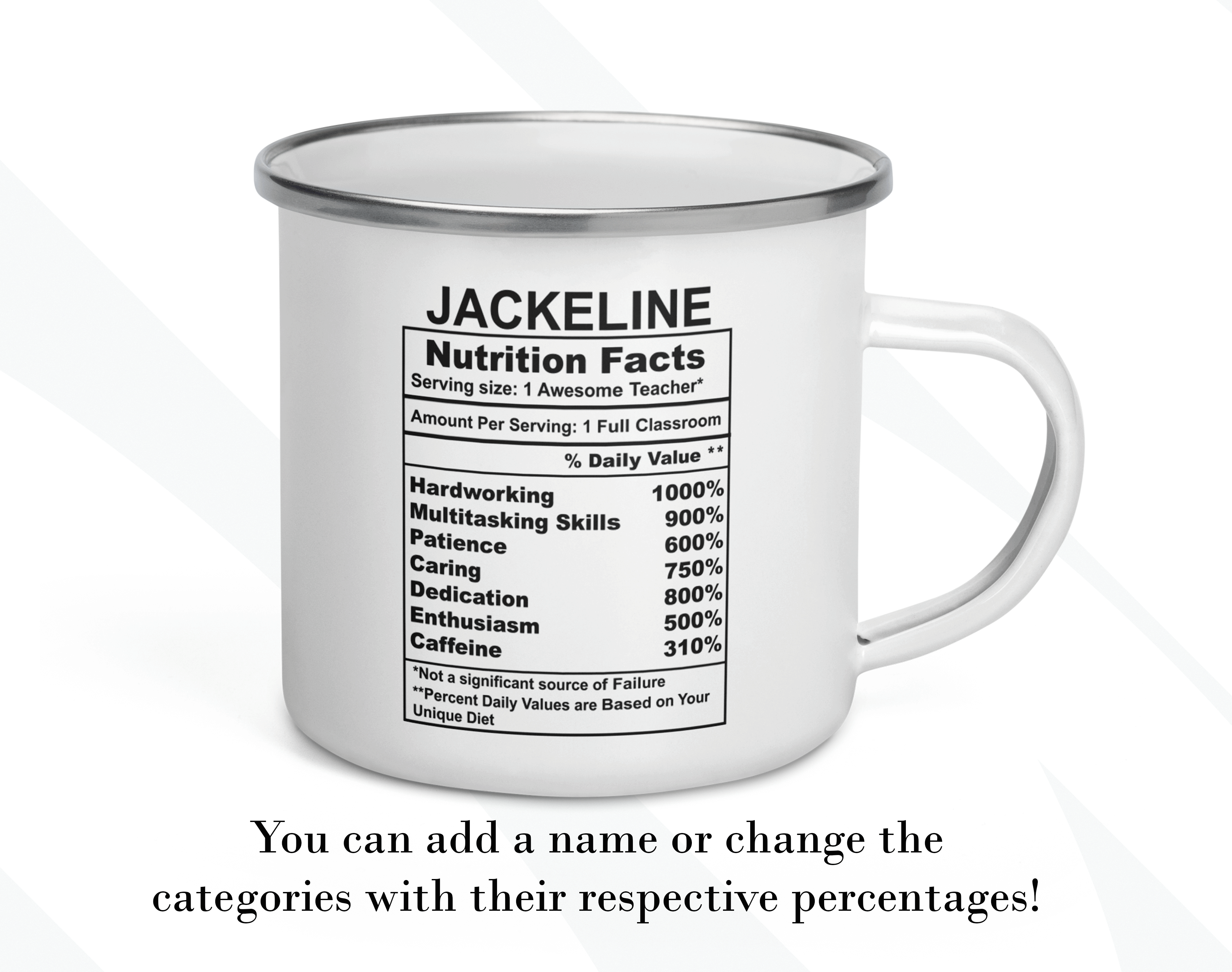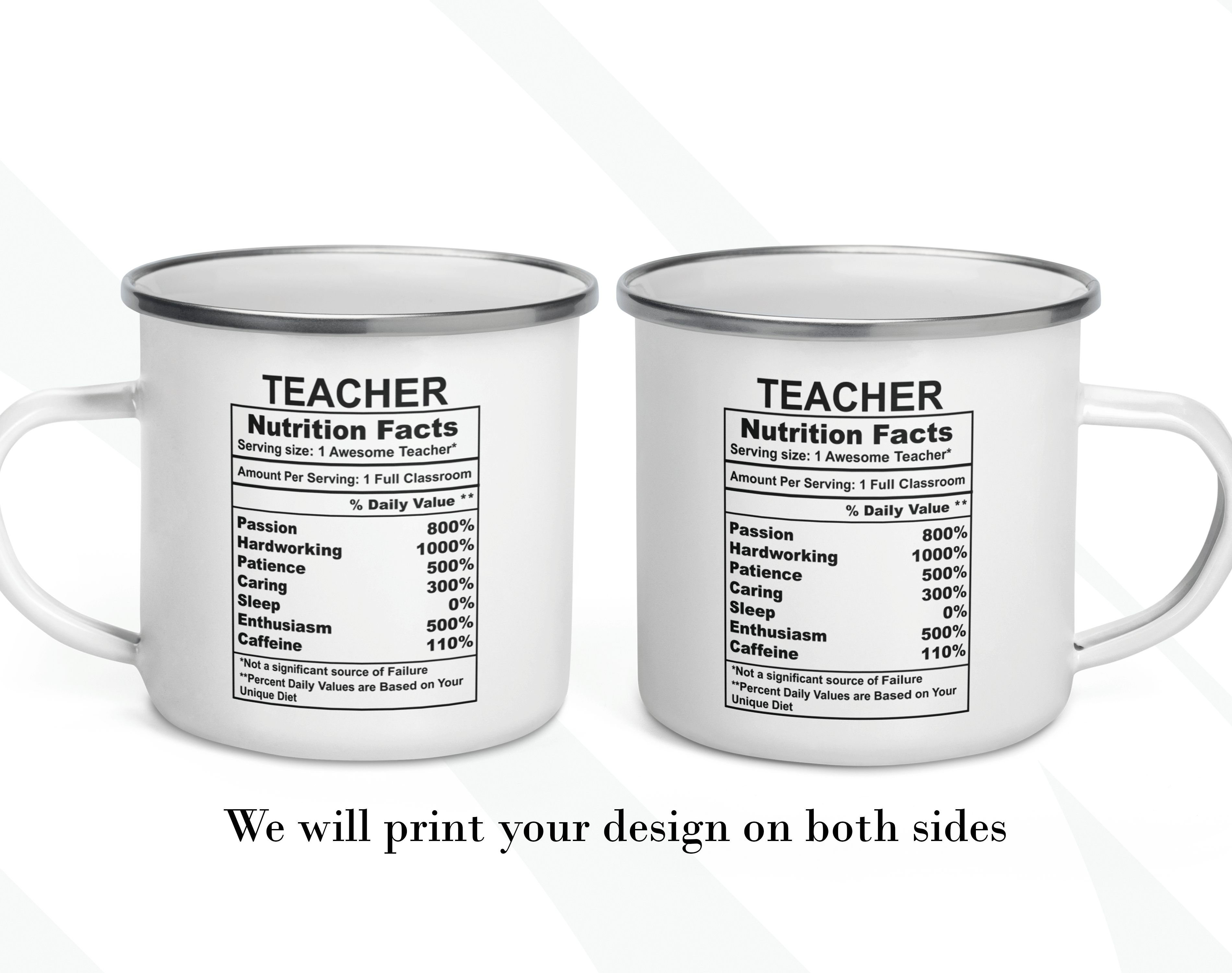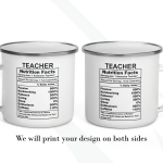 By default, we will print the main design on both sides of your teacher’s mug. You can put a name or phrase on the mug’s back, as in the pictures. If you add text to the mug’s back, please let us know your preferred font number (the options are on the pictures). As in the pictures, you can add a name or change the categories and percentages. Please help us by providing as much information as possible in the personalized text box; we will take care of the rest! It’s your customized mug, so you can design your teacher gift as you wish!