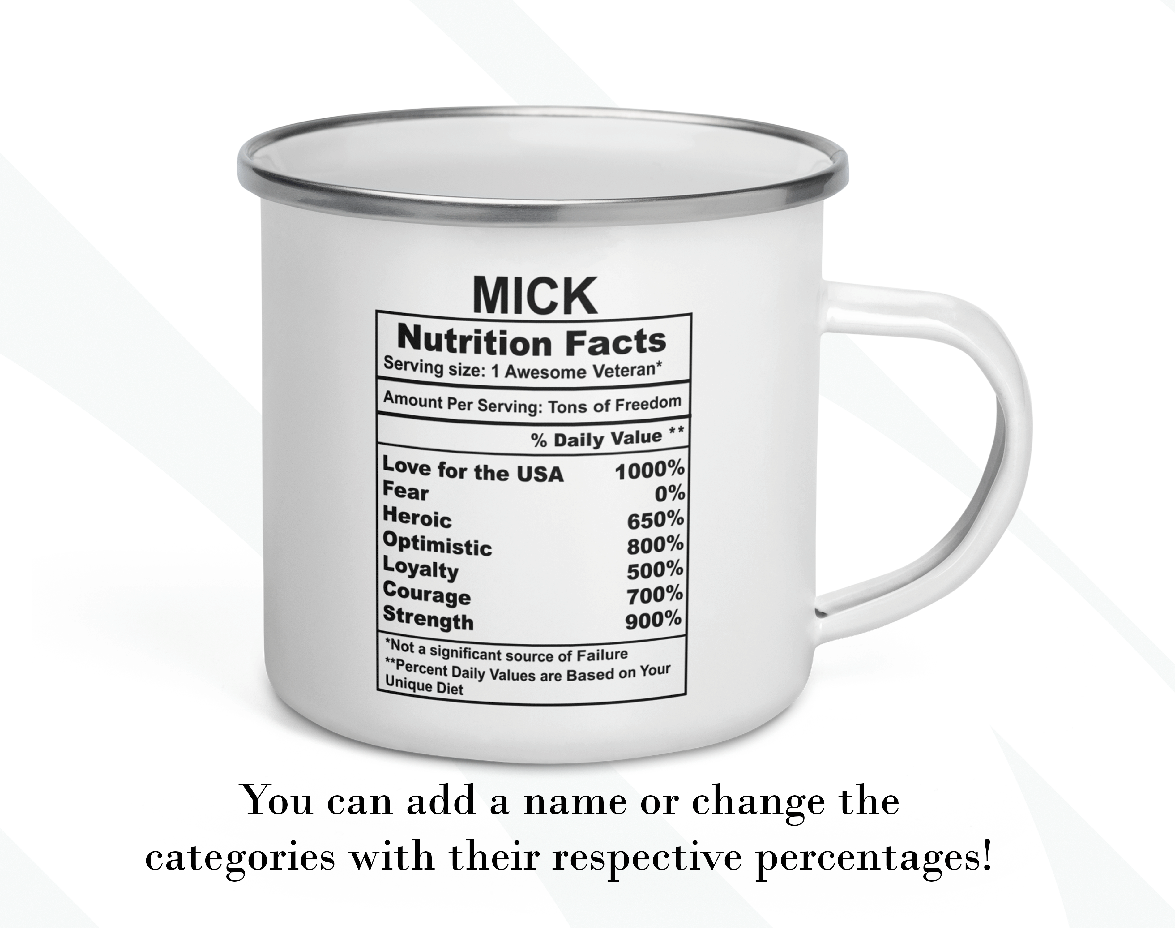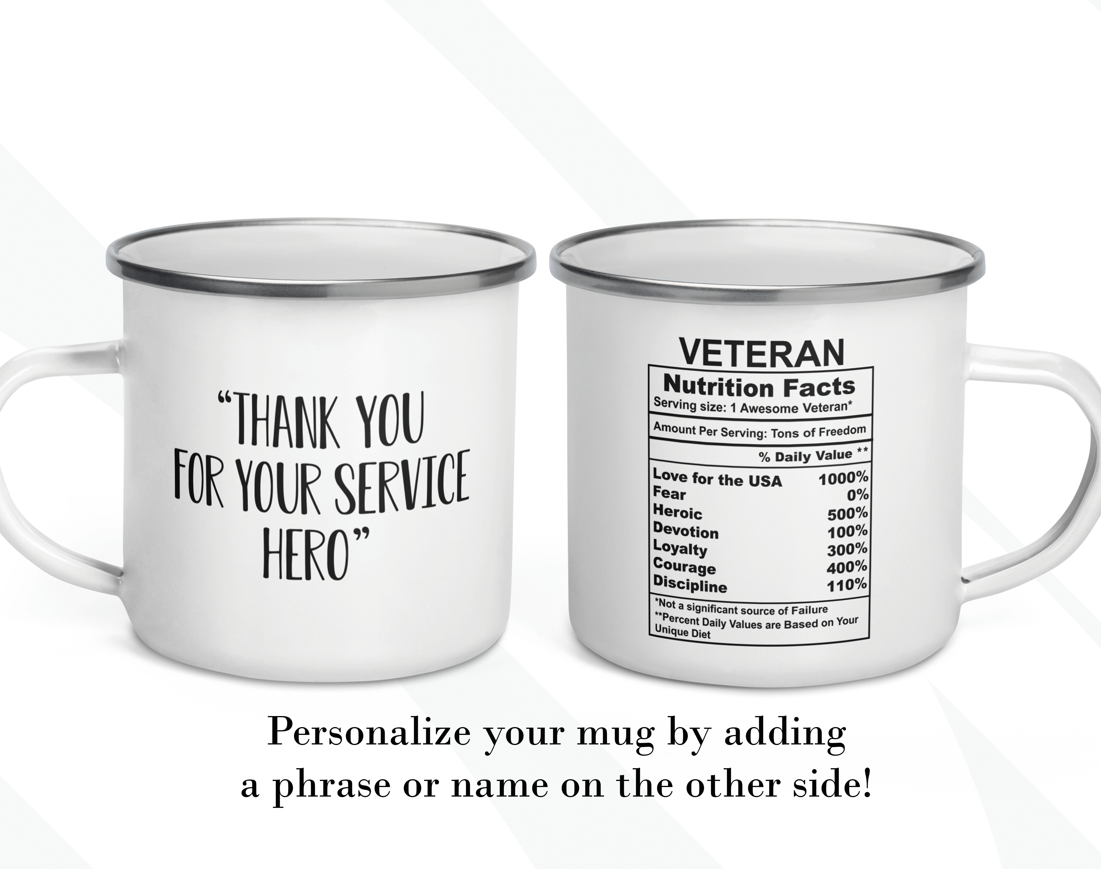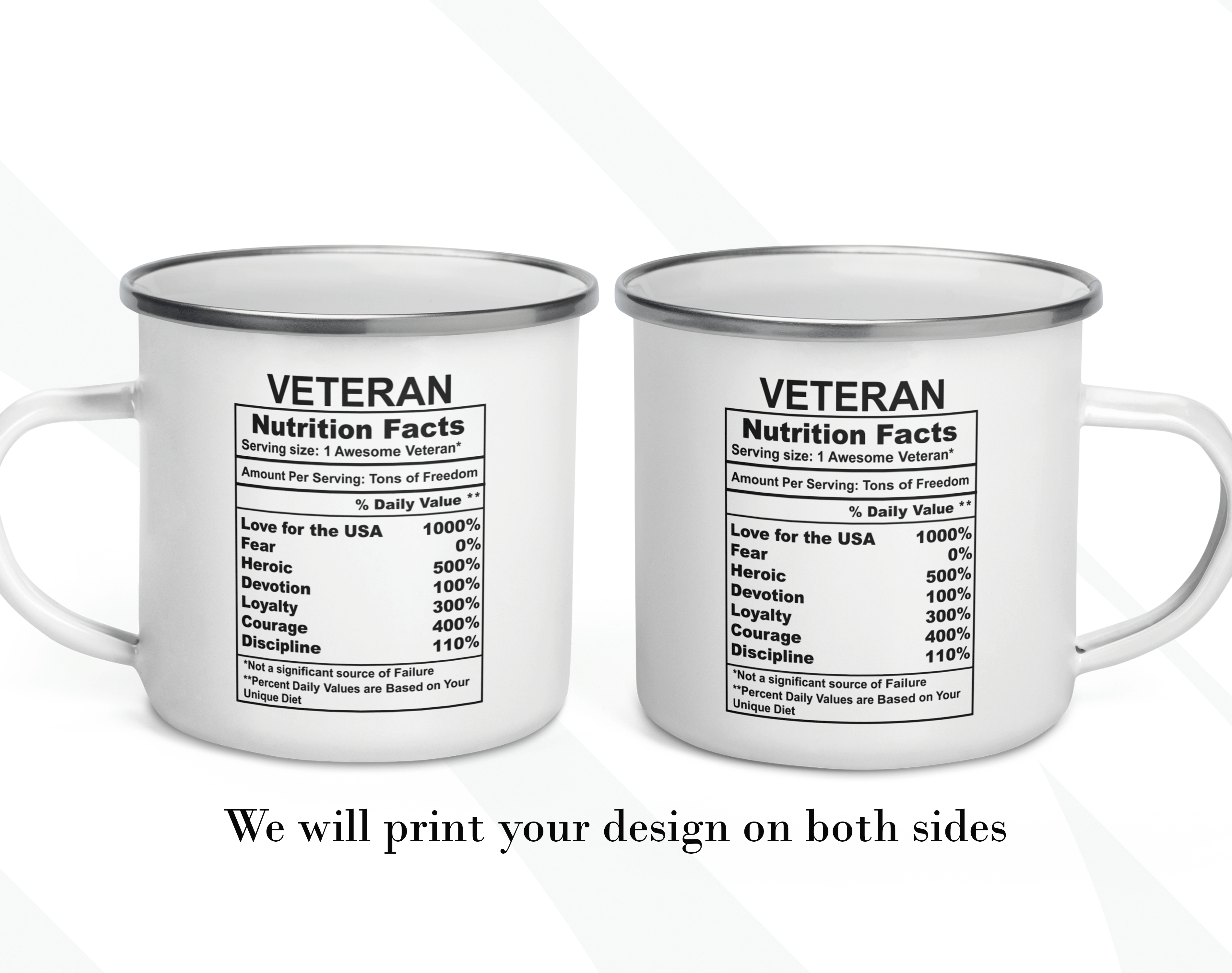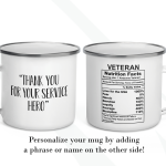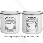 By default, we will print the main design on both sides of your veteran’s mug. You can put a name or phrase on the mug’s back, as in the pictures. If you add text to the mug’s back, please let us know your preferred font number (the options are on the pictures). As in the pictures, you can add a name or change the categories and percentages. Please help us by providing as much information as possible in the personalized text box; we will take care of the rest! It’s your customized mug, so you can design your veteran gift as you wish!