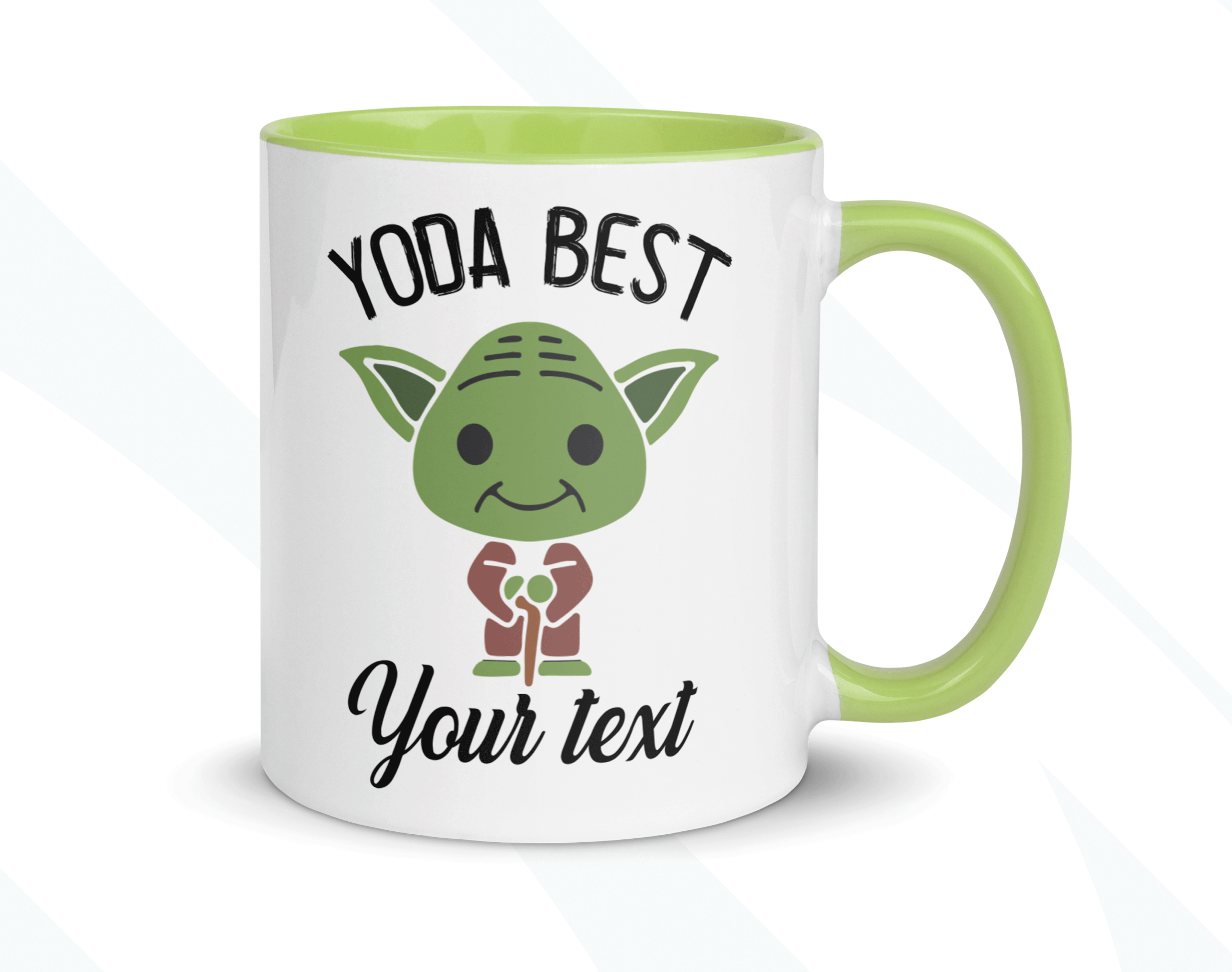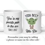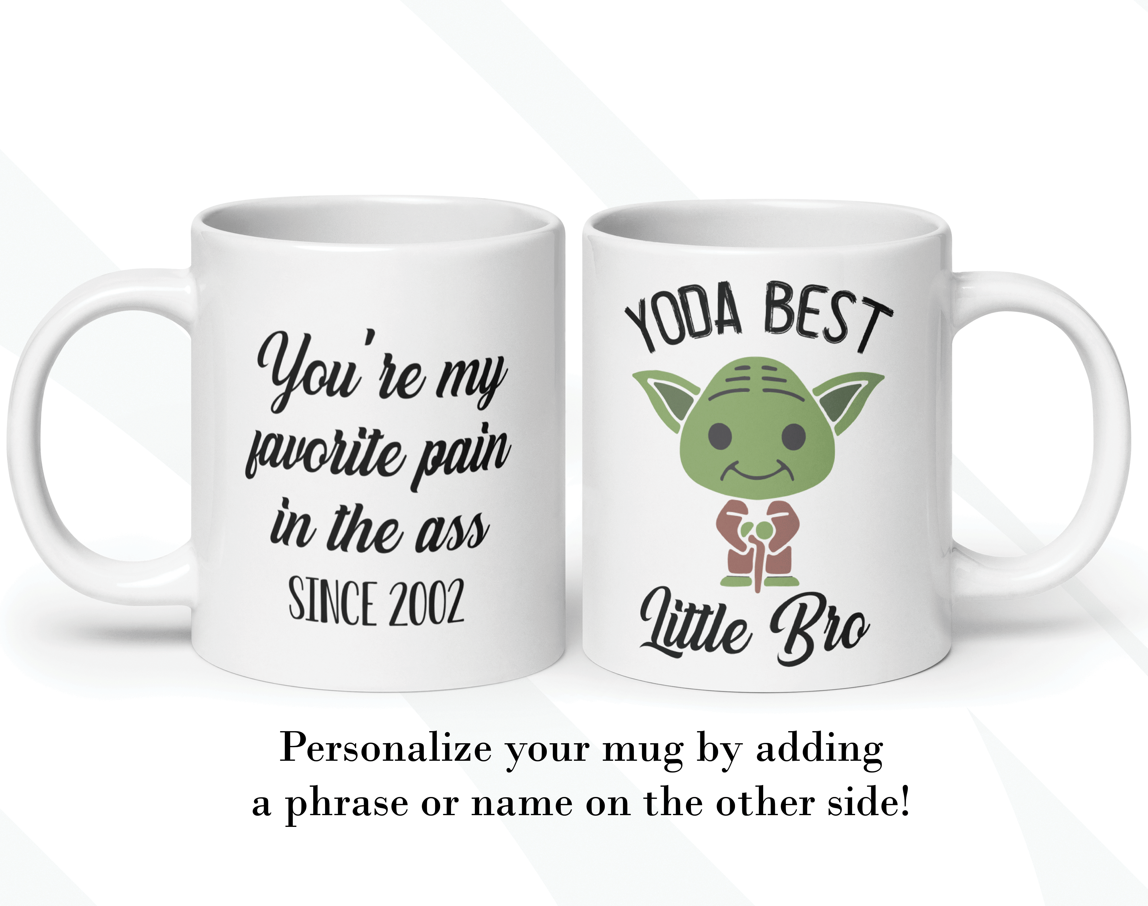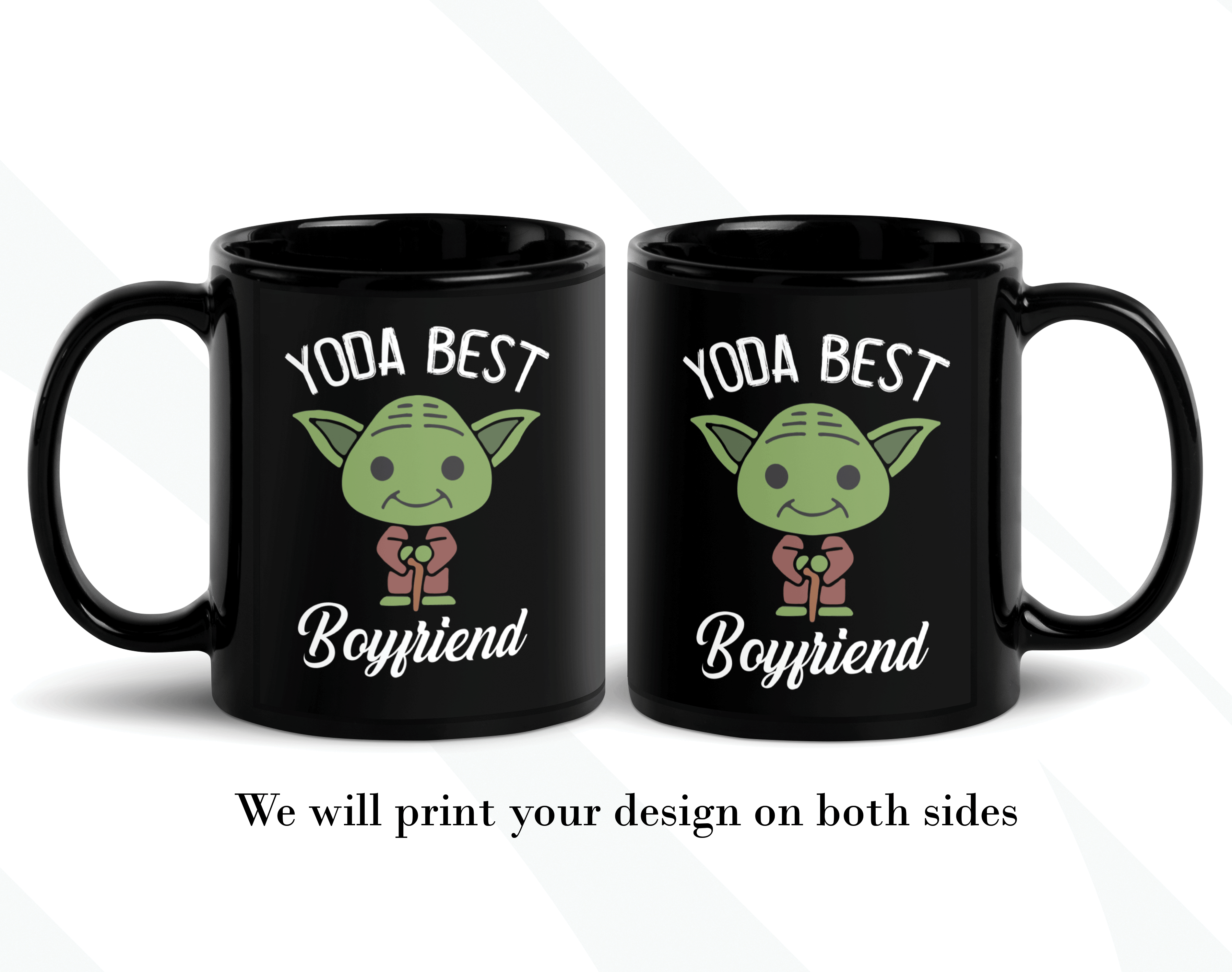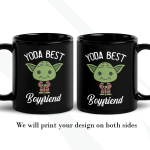 This Baby Yoda Gift is a customized mug where you can change the Yoda Best phrase to whatever that person is the best for you! For example, “Yoda Best Boyfriend”, “Yoda Best Girlfriend”, “Yoda Best Friend”, “Yoda Best Sister,” etc. By default, we will print the design on both sides. Please specify the text you want for your custom Yoda mug in the personalization box. As in the pictures, you can add a name or phrase to the mug’s back. If you do so, please help us by specifying it with the font number you want. We will take care of the rest!